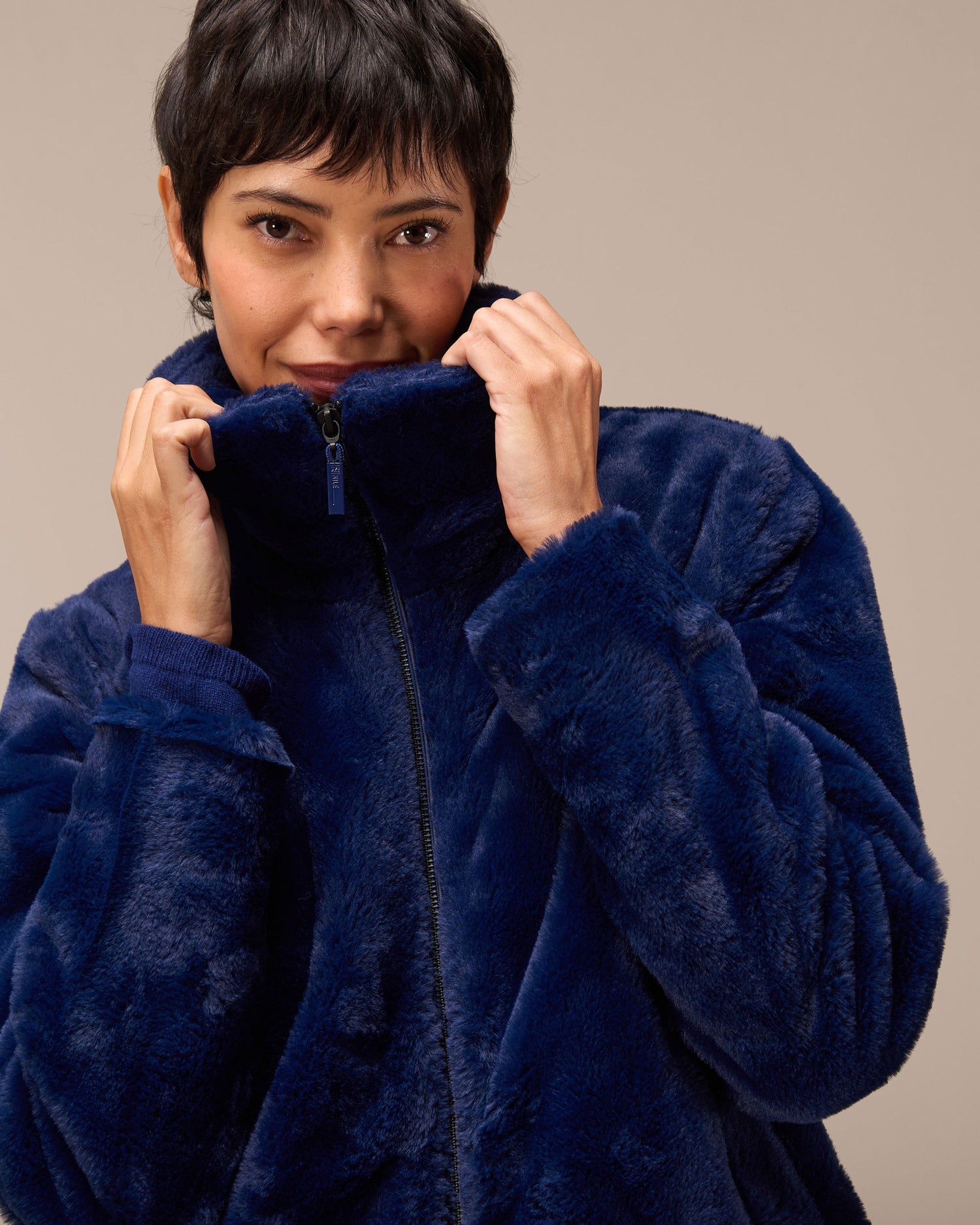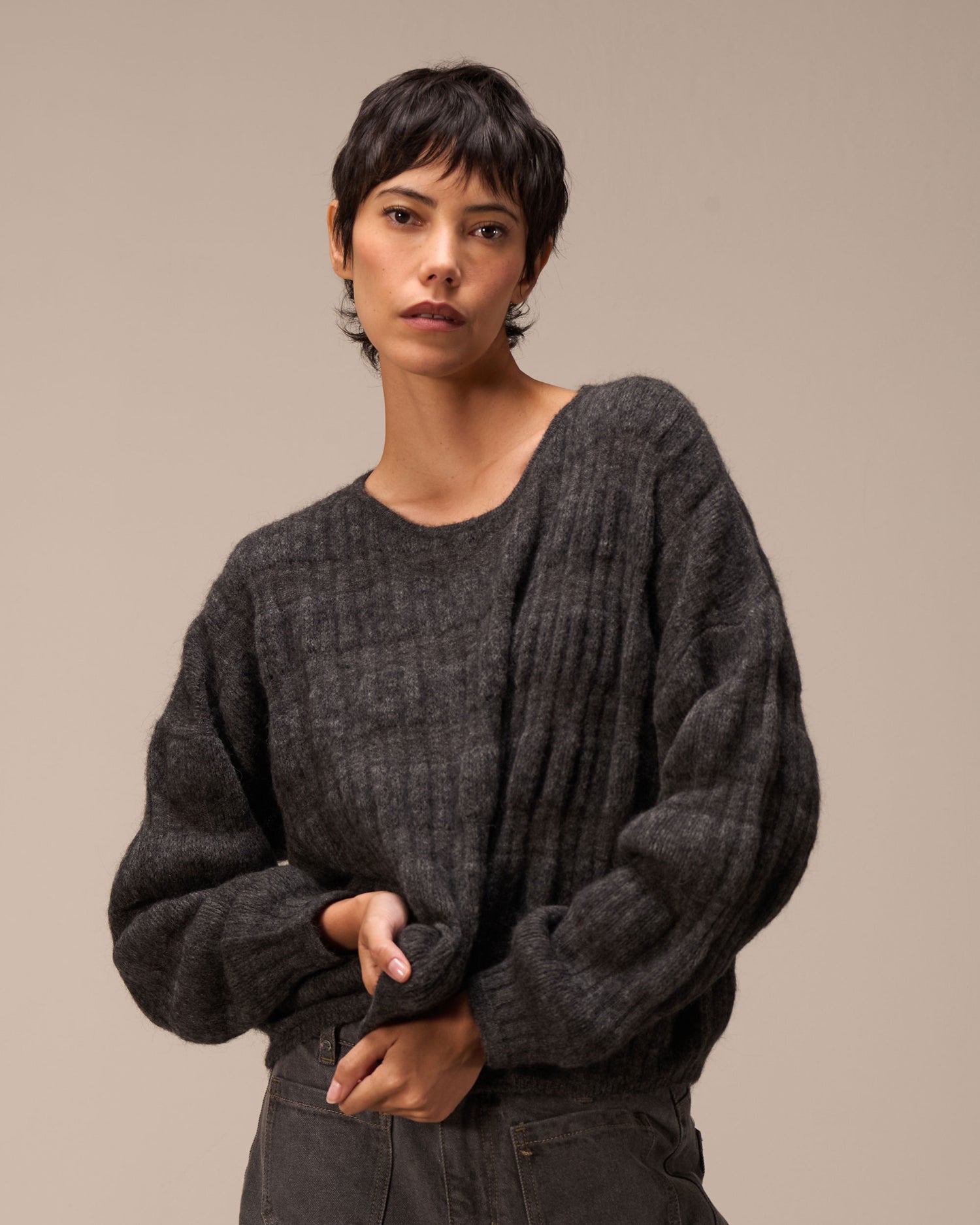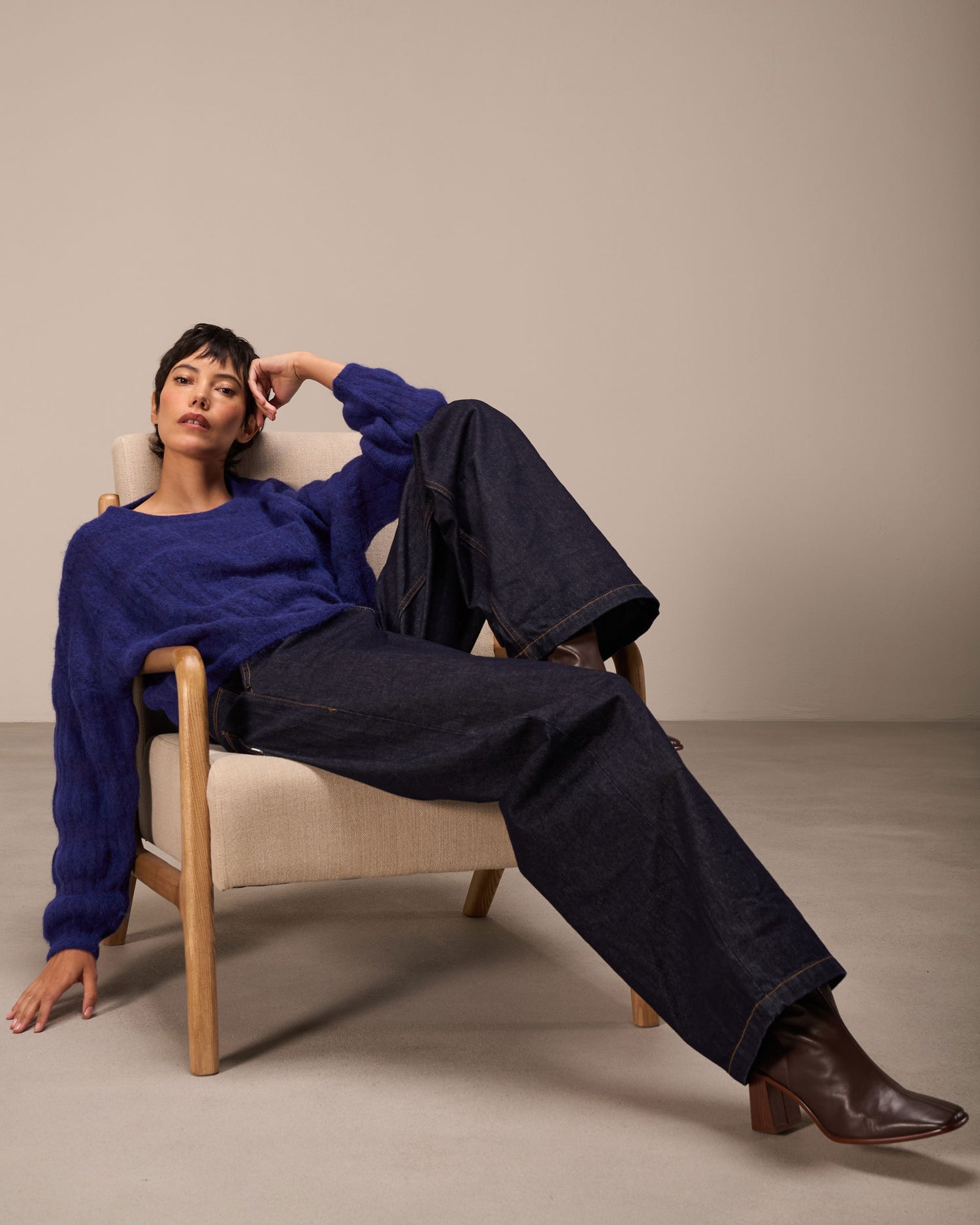 Der kuschelige Pullover in Cobalt trifft auf weit geschnittene Denim mit markanter Naht. Ein Statement-Look für kühle Herbsttage, der Komfort und Stil perfekt vereint.