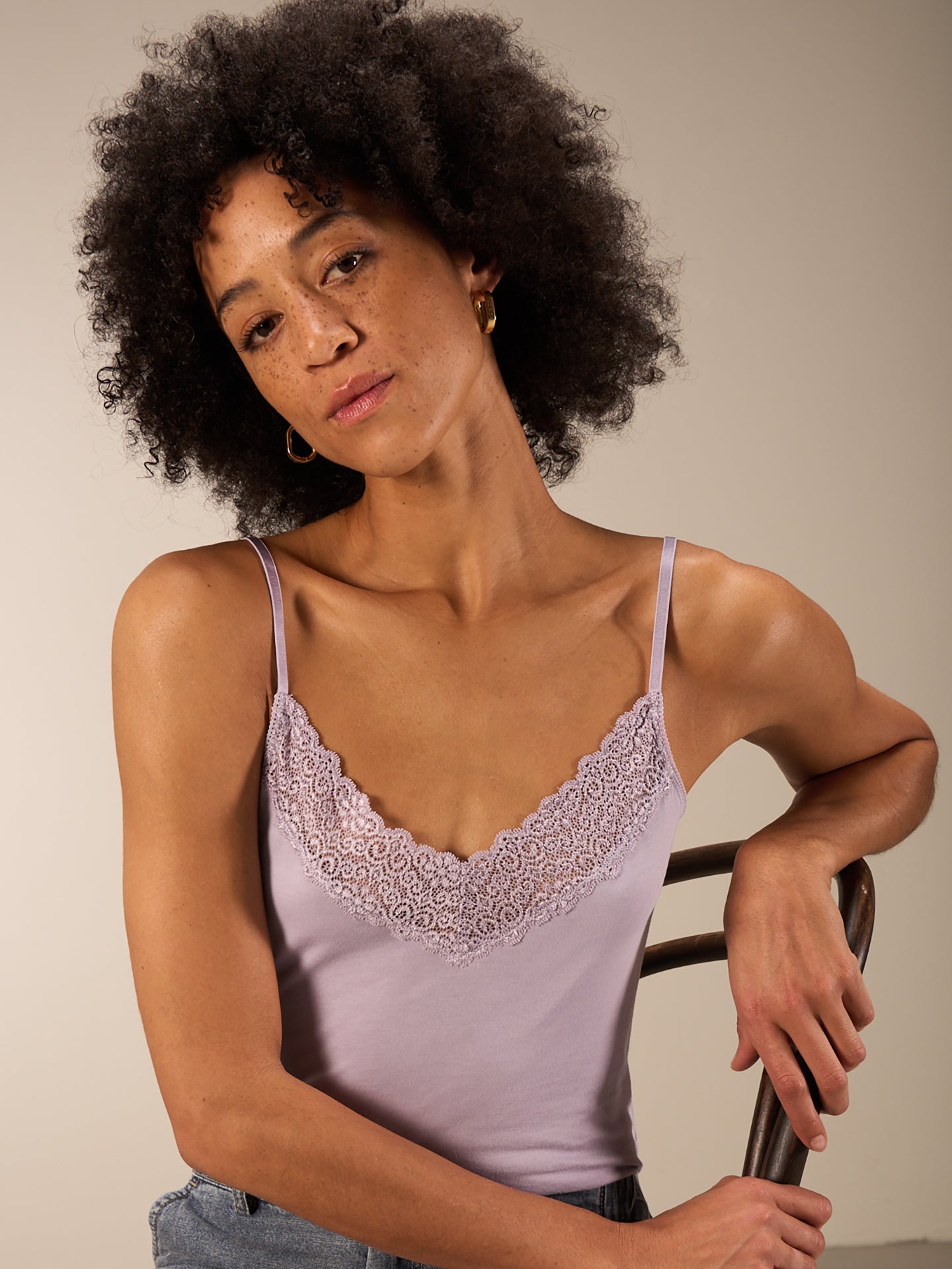 Figurbetontes Trägertop mit beidseitig tragbaren breiten Spitzenbesatz der entweder mit geradem Abschluss oder im V-Ausschnitt getragen werden kann. Die elastischen Spaghettiträger sind höhenverstellbar.