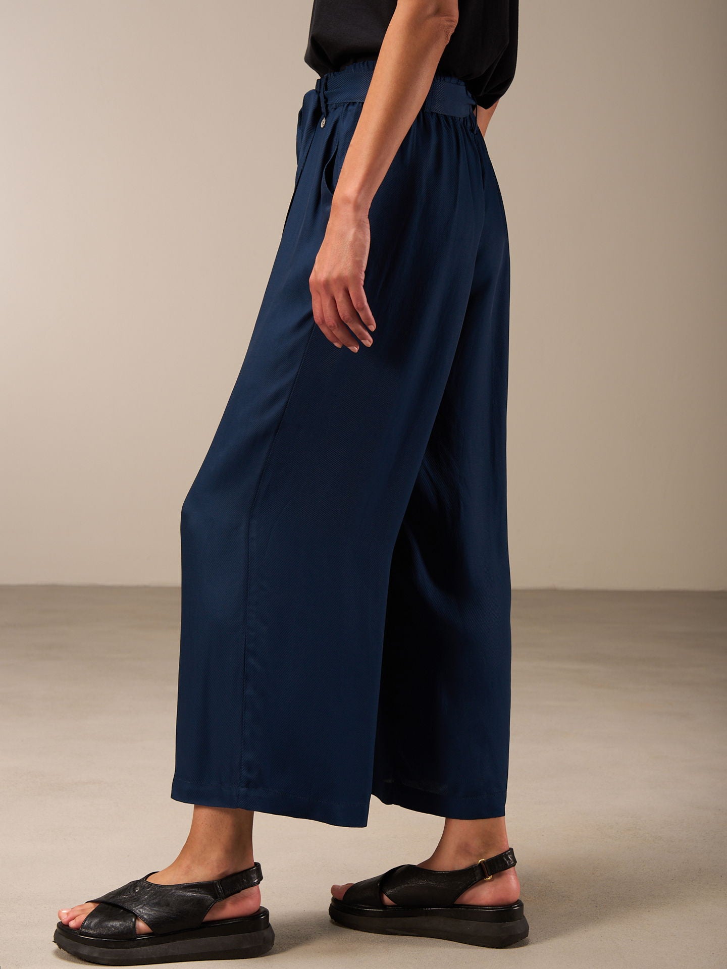 Luftige blickdichte Hose mit weitem gerade geschnittenem Bein und elastischem Bund, mit Gurtschlaufen und einem Stoffgürtel. Die leichte Crepe Optik sorgt für eine weich fliessende und feine Struktur.