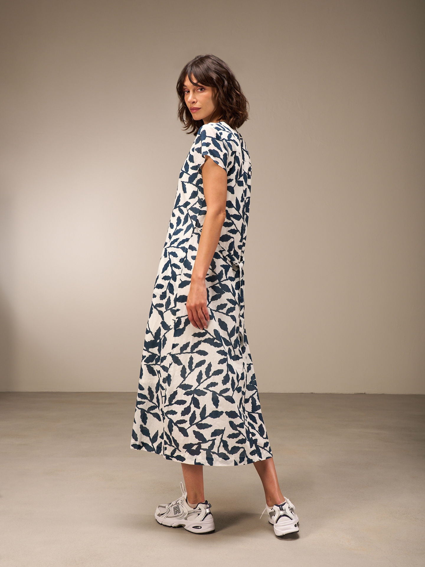 Feminines gefüttertes Kleid in leichter A-Linie mit kurzen Ärmeln und V-Ausschnitt, das mit dem dünnen Stoffgürtel auch tailliert getragen werden kann. Der handgezeichnete Alloverprint macht dieses Kleid zu einem Lieblingsteil, von Sommer bis Herbst .