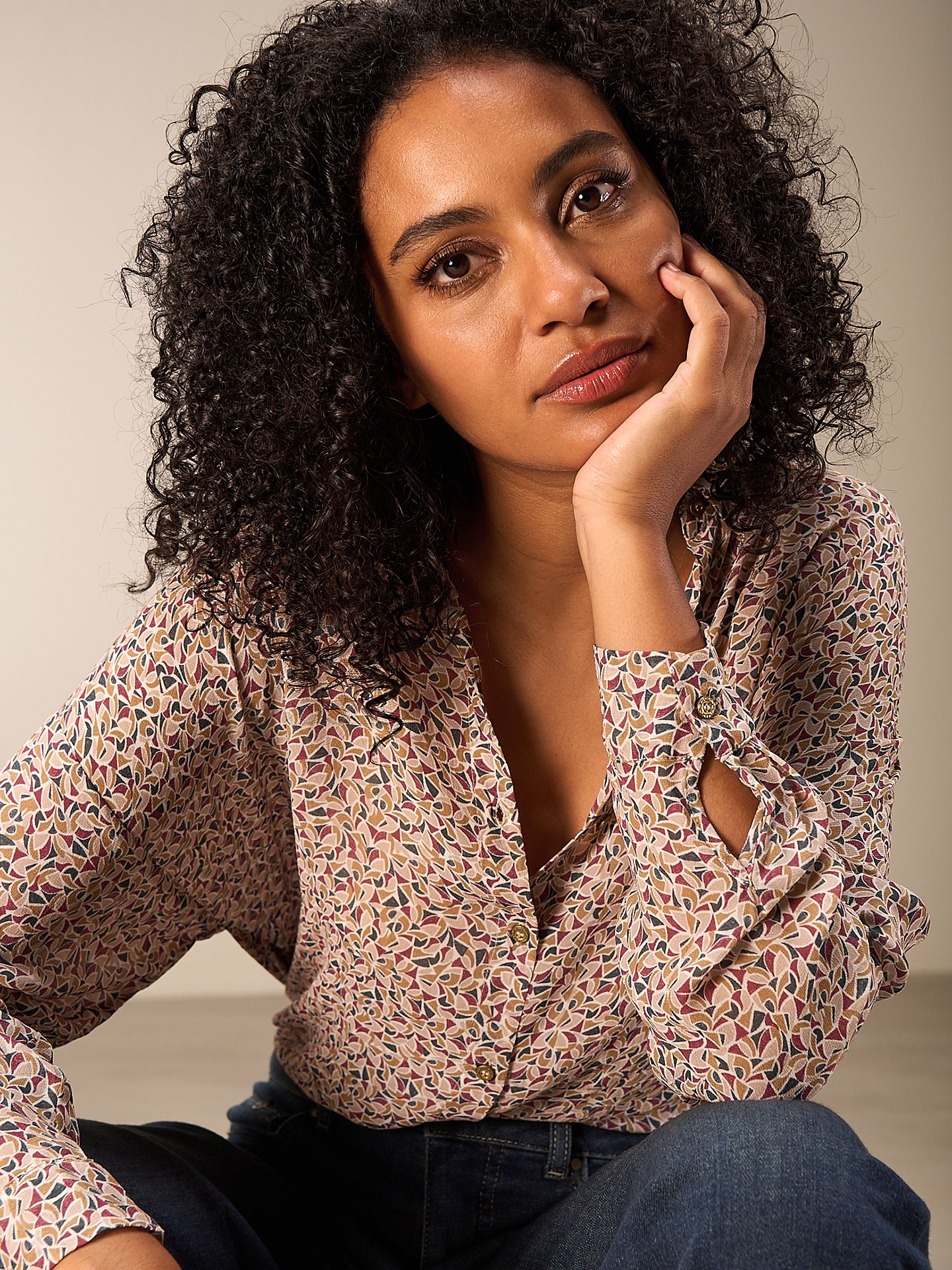 Durchgeknöpfte Hemdbluse in gerade geschnittener Passform und überschnittenen Schultern. Die langen Ärmel sind mit einem Knopf an der Manschette versehen. Der passende handgezeichnete Alloverprint runden den Look der Bluse ab. Aus 100% Eco Viskose, die aus nachhaltiger Holzwirtschaft gewonnen wird.