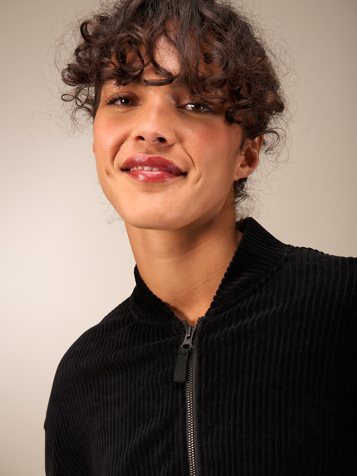 Modischer Blouson mit Bortenabschluss und Rundhalsausschnitt mit Kragen in elastischem weichen Kordstoff. Unregelmässigkeiten in der Farbe machen das Stück einzigartig. Der Ausbleicheffekt wird verstärkt.