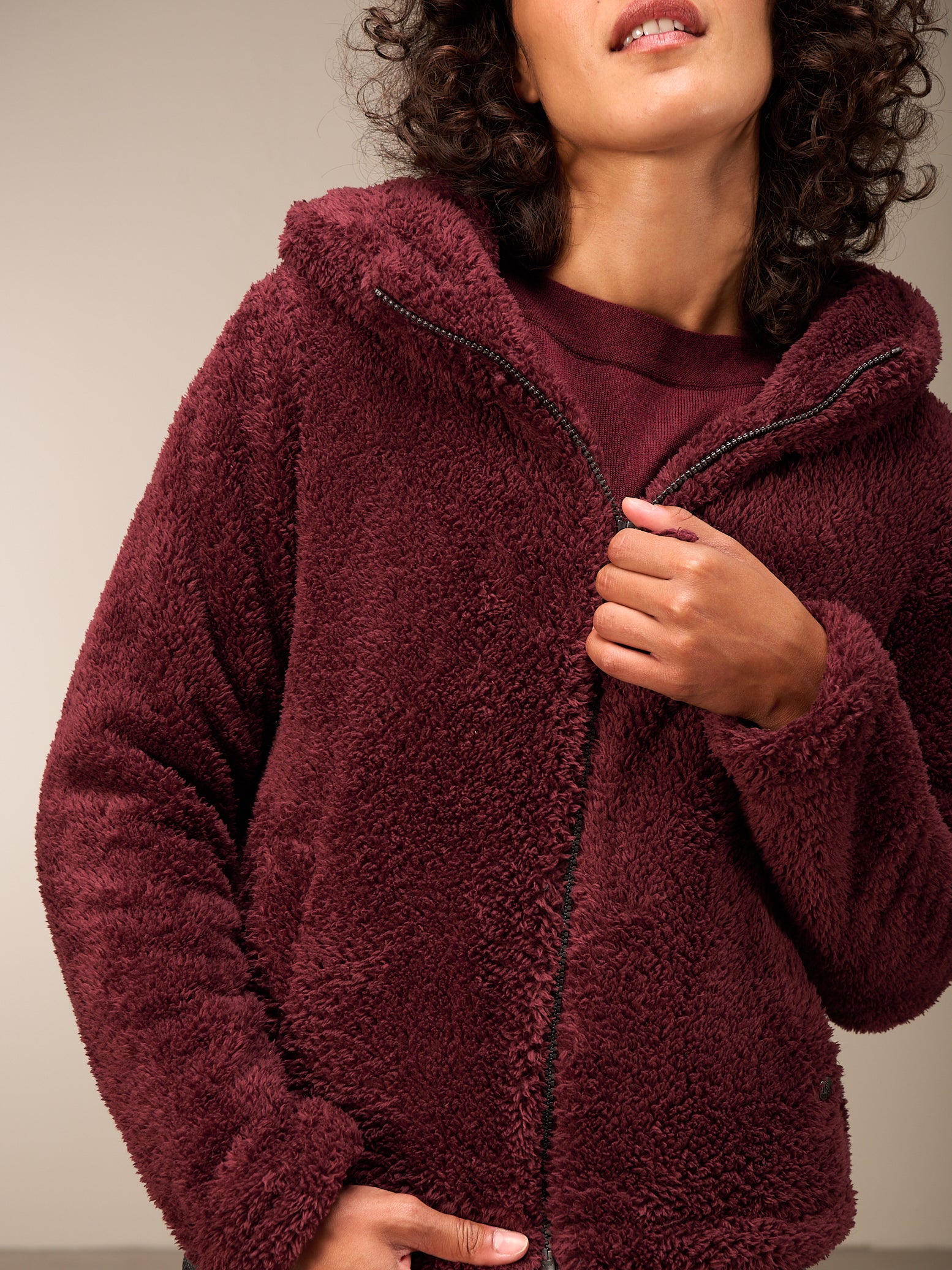 Superflauschige Jacke in kurzer, weiter Passform mit kuscheligem Kragen, dezenten Eingriffstaschen und leichtem Reissverschluss. Elastischer Abschluss am Ärmel.
