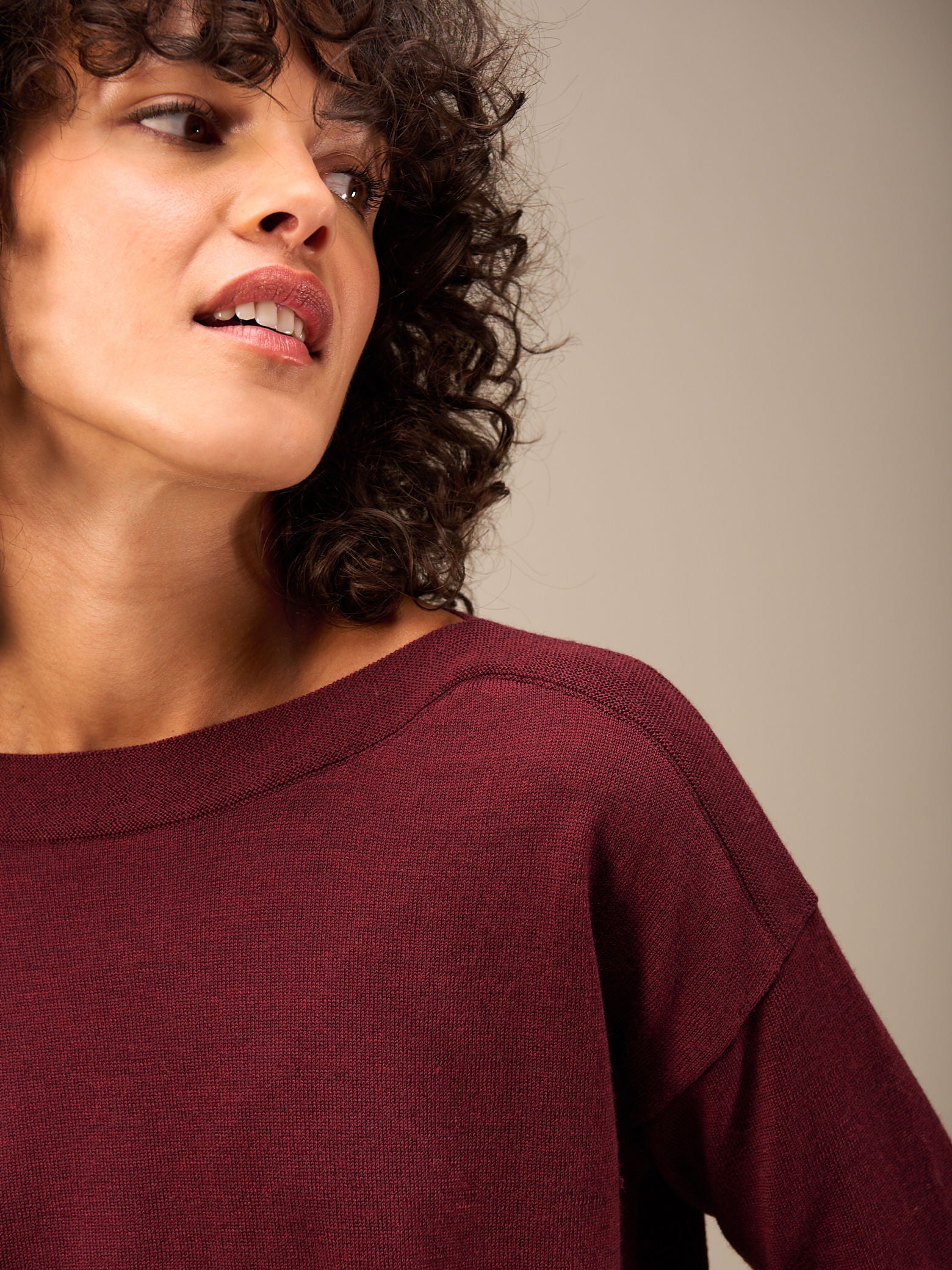 Gerade geschnittener Pullover in speziellem Melange-Garn mit edlem U-Boot Ausschnitt mit Rippenborte und stark überschnittenen Schultern. Der Schlitz am Rippen Saum und die verlängerte Rückenpartie runden den Pullover ab und macht ihn zum Lieblingsstück.