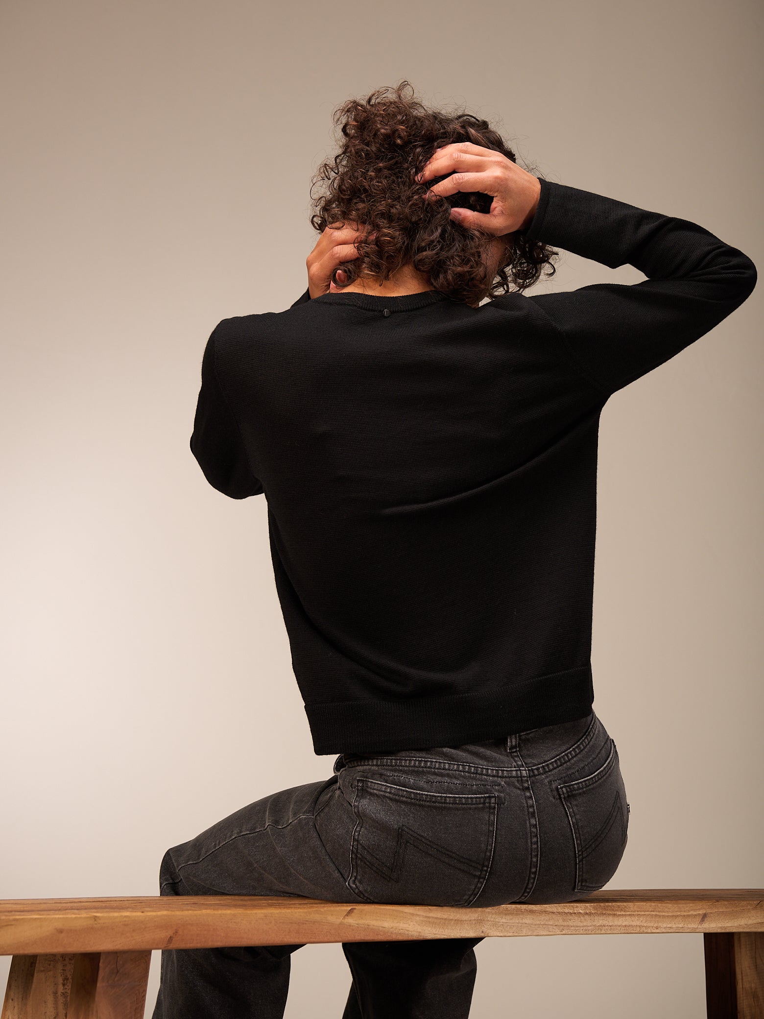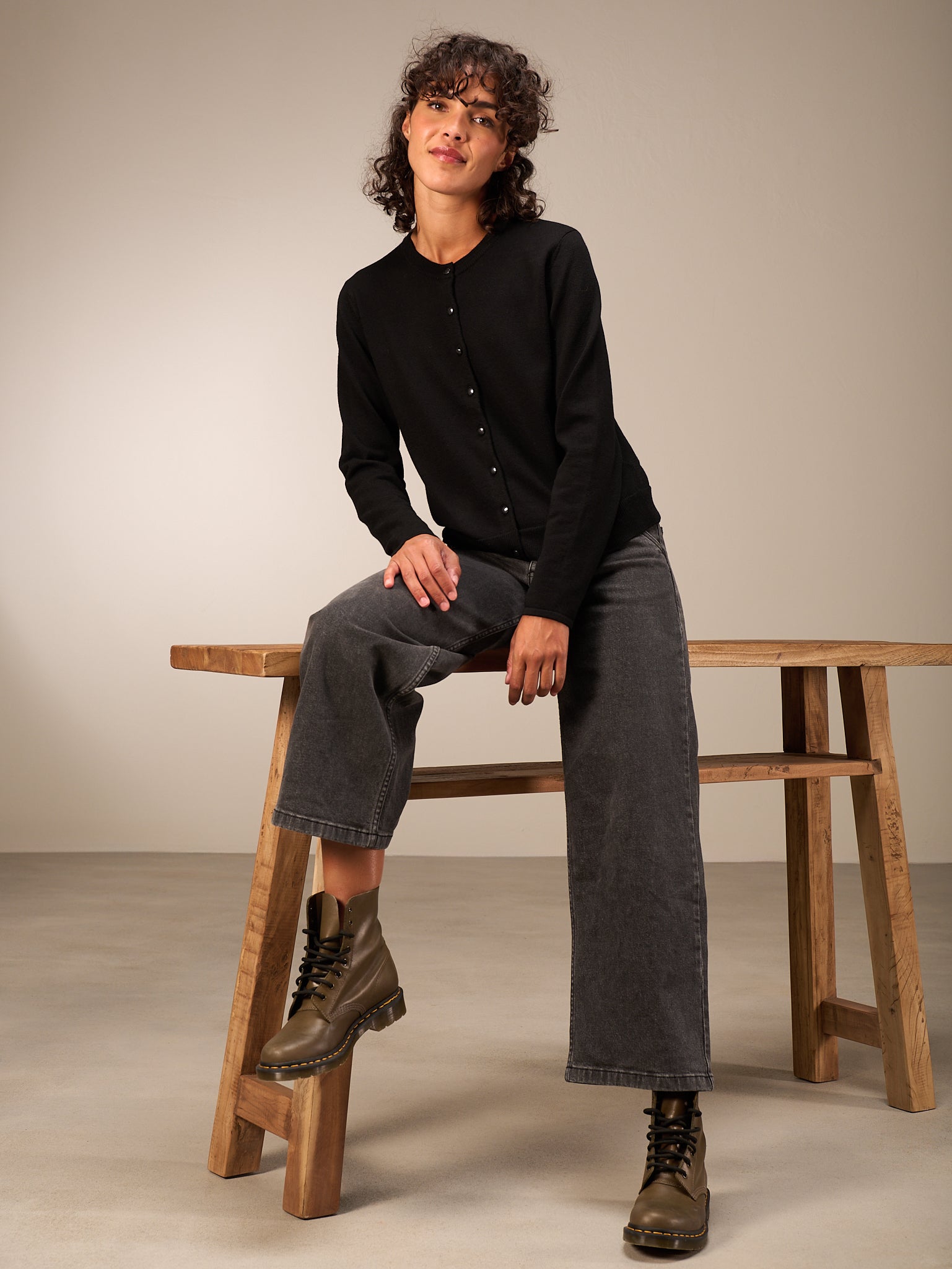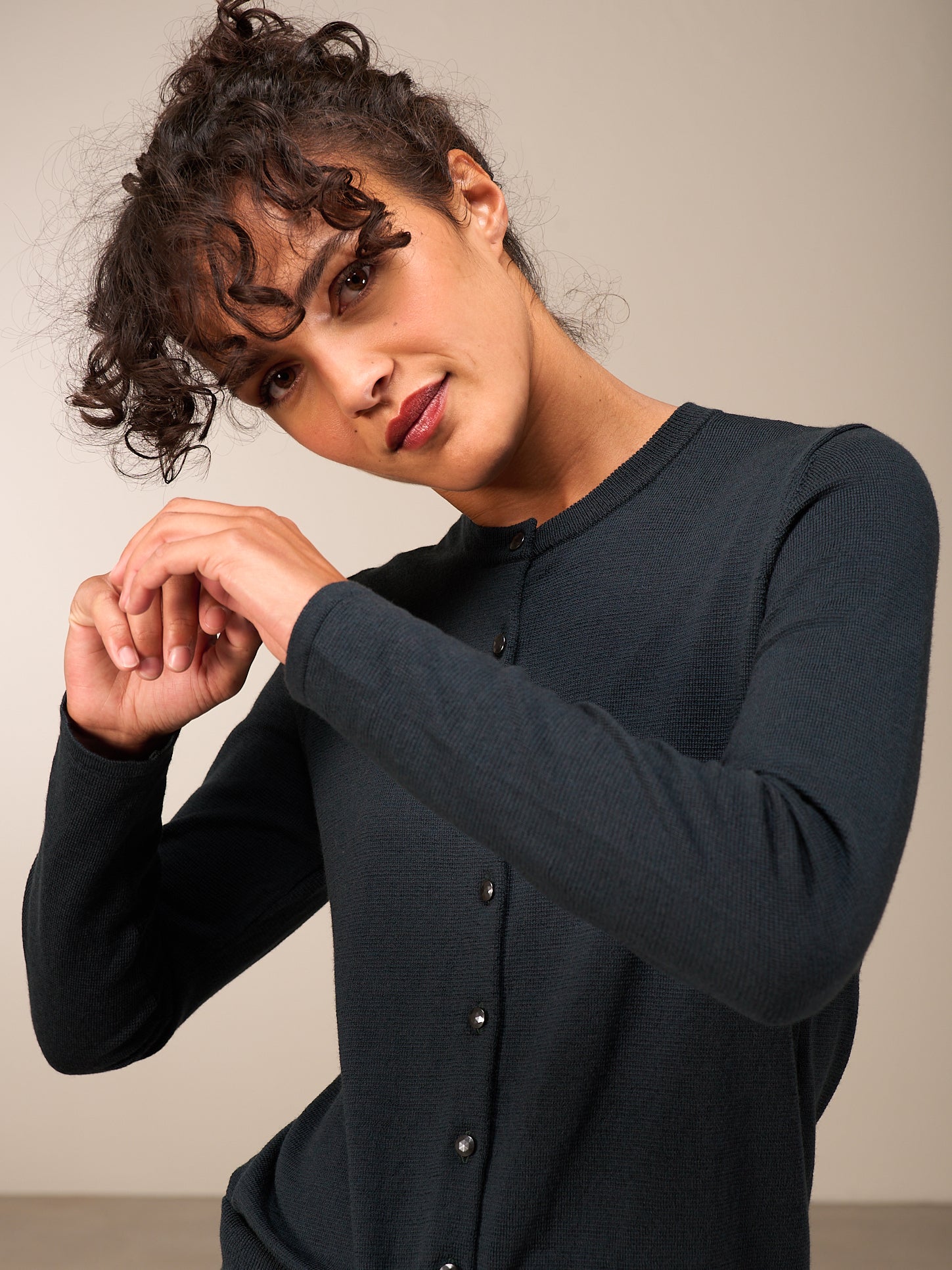 Locker, gerade geschnittene Strickjacke mit überschnittenen Schultern und wertigen Ösenknöpfen Ton in Ton. Die edle Merino Optik macht die Jacke zu einem Lieblingsteil.