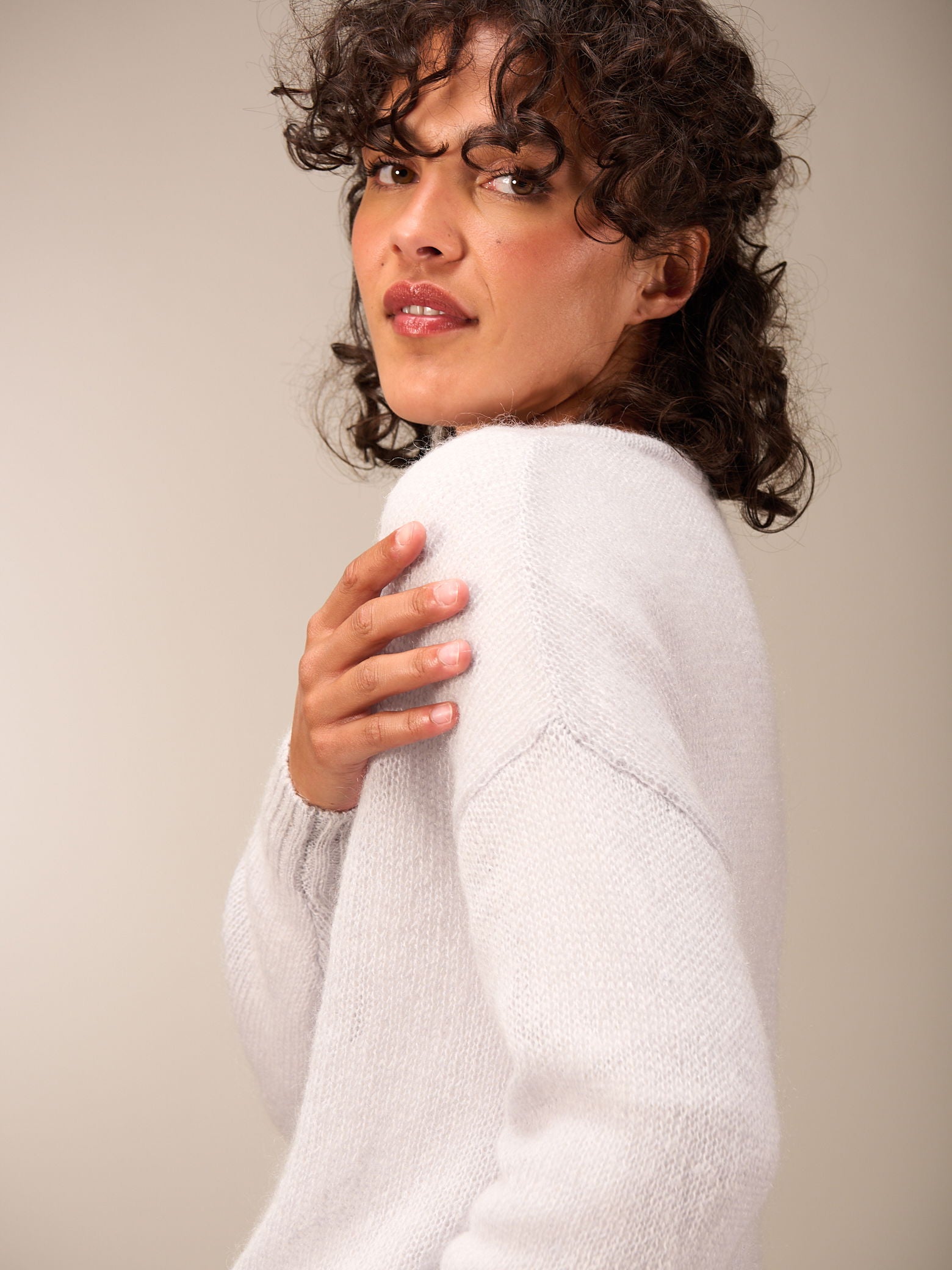 Gerade geschnittener Pullover mit leicht überschnittenen Schultern und dekorativer Perlmuttknopfleiste am Rundhalsausschnitt. Die leicht ballonförmigen Bischofärmel und die leicht transparente Optik macht den Pulli zum perfekten Kombipartner und hat Lieblingsteilpotential.