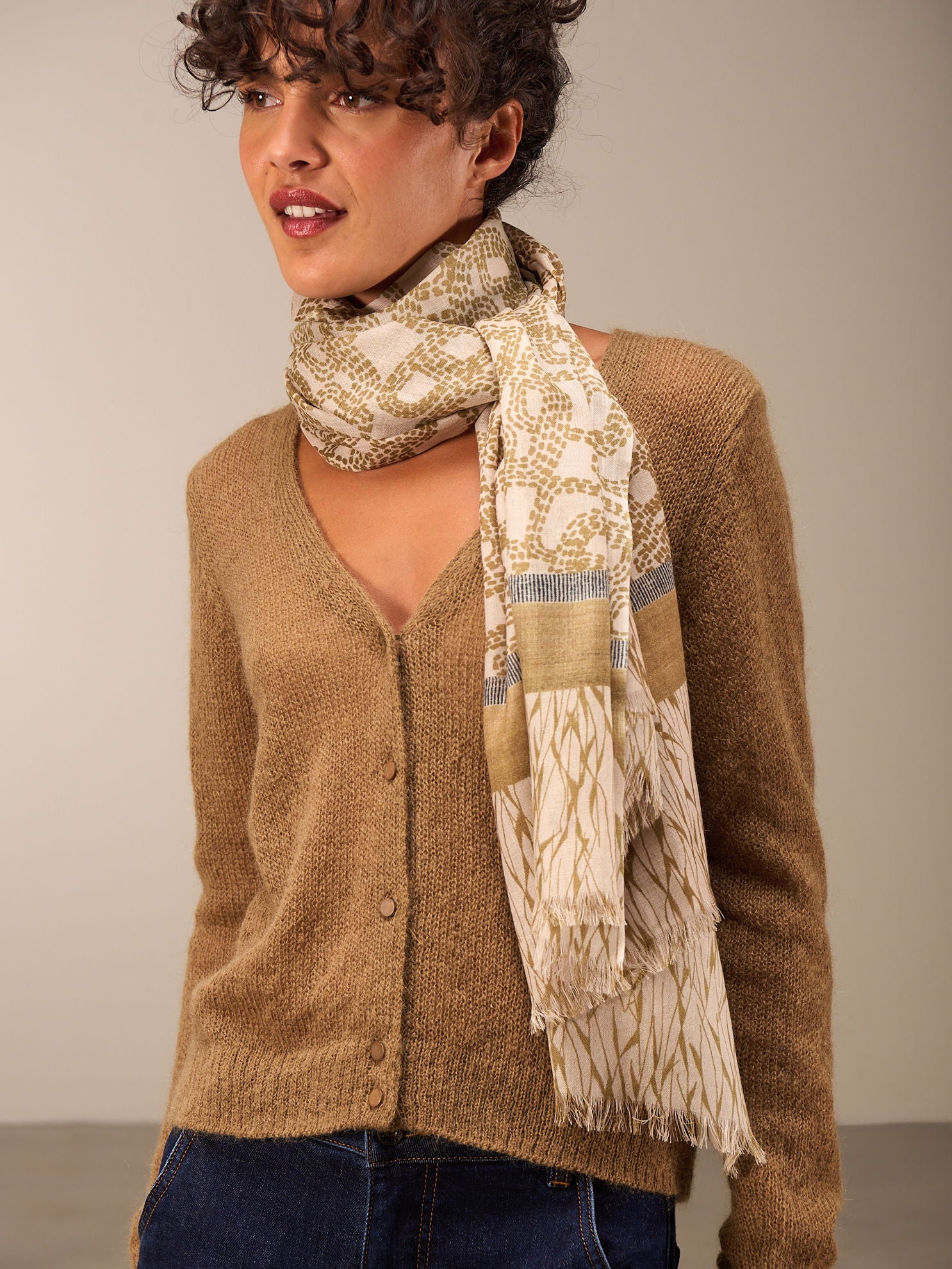 Hochwertiger Schal mit handgezeichnetem Alloverprint in der Grösse 70x200cm. 100% Wolle mit einer gewobenen Kante und kurzen Fransen.