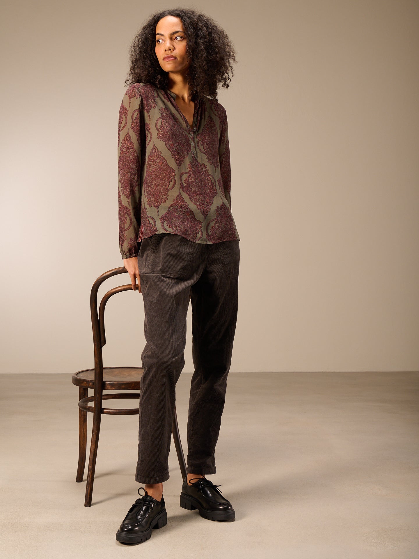 Lässige sportliche Hose in weicher Längsrippen-Cord Qualitat mit mittelhohem elastischem Bund mit Kordelzug, gekrempeltem Saum und aufgesetzen Taschen.