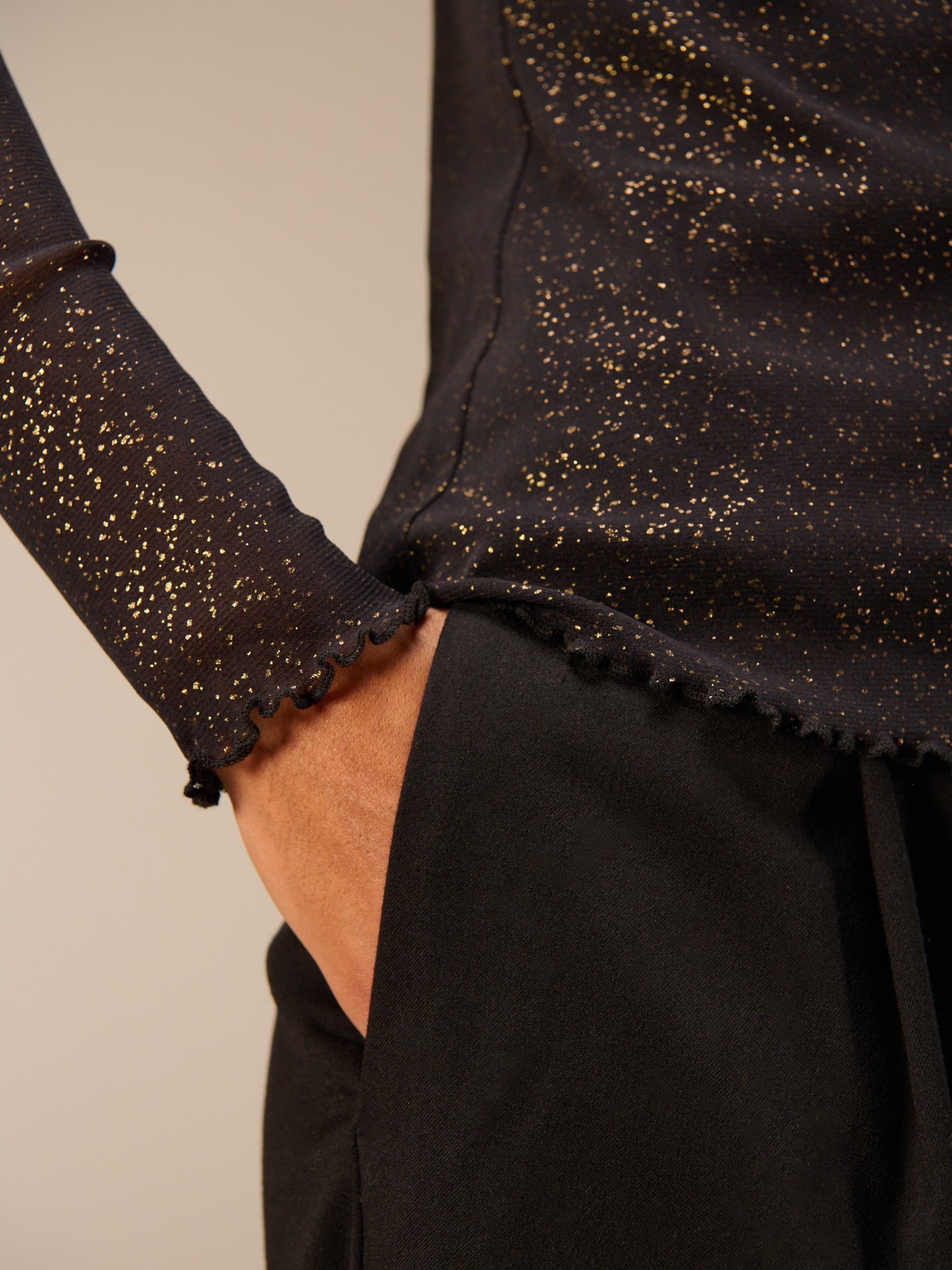 Körperbetontes Langarmshirt mit kleinem Stehkragen in angesagter feiner Netzoptik und mit dezentem Goldprint.