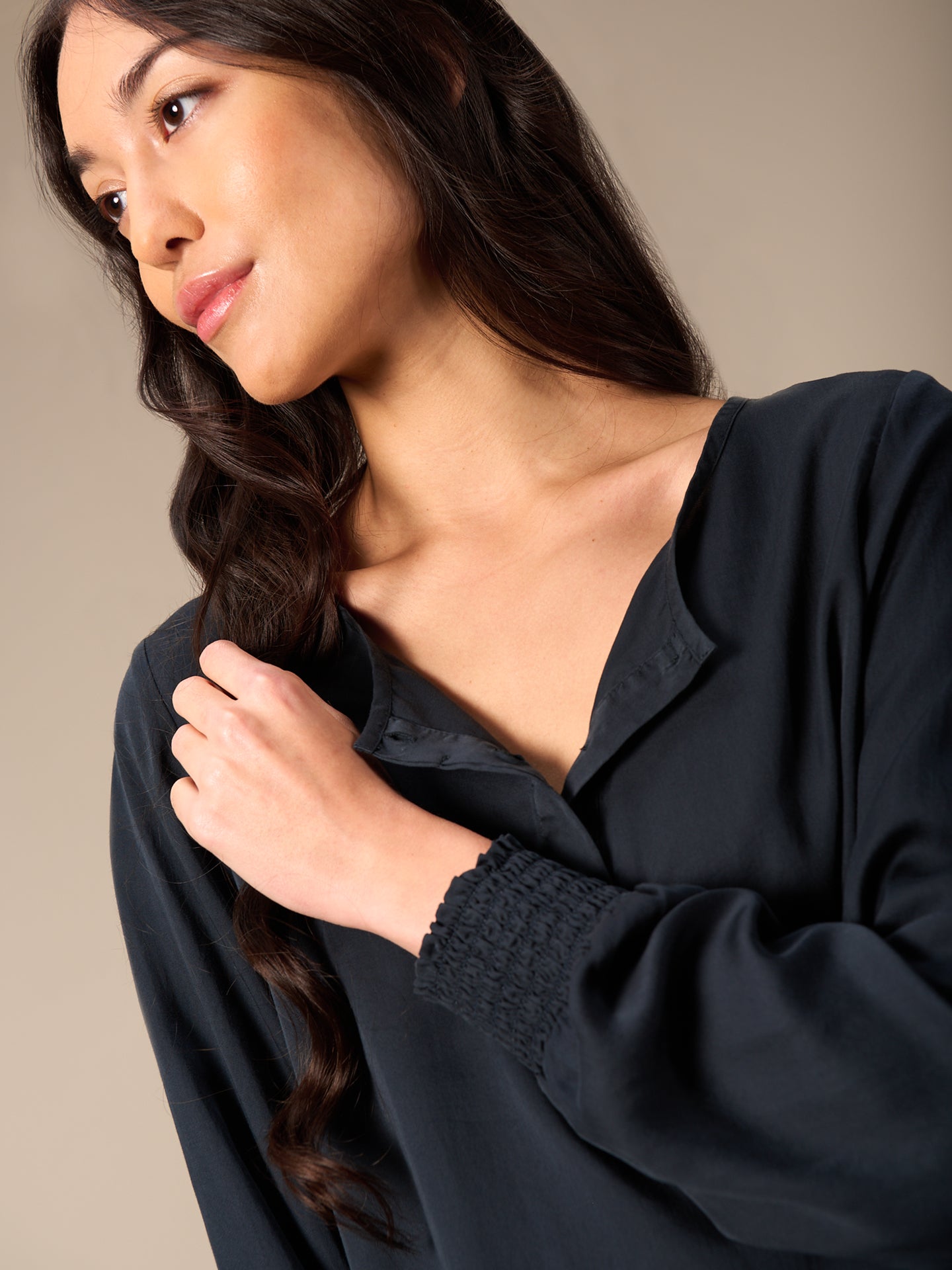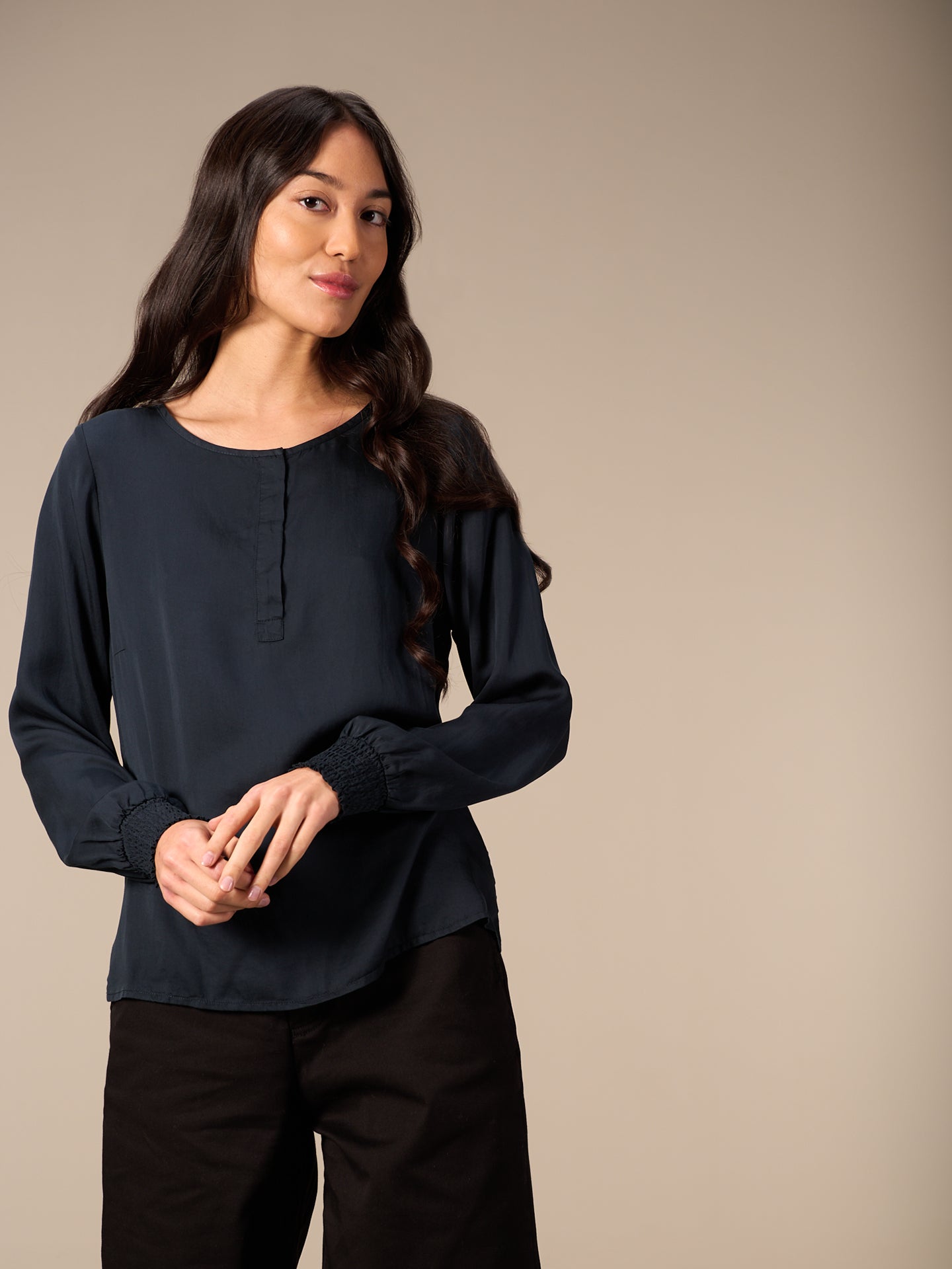 Edel schimmernde, locker geschnittene Satinbluse mit eingefasstem Rundhalsausschnitt mit verdecktem Verschluss. Die langen Ärmel enden mit einer gesmockten Manschette.