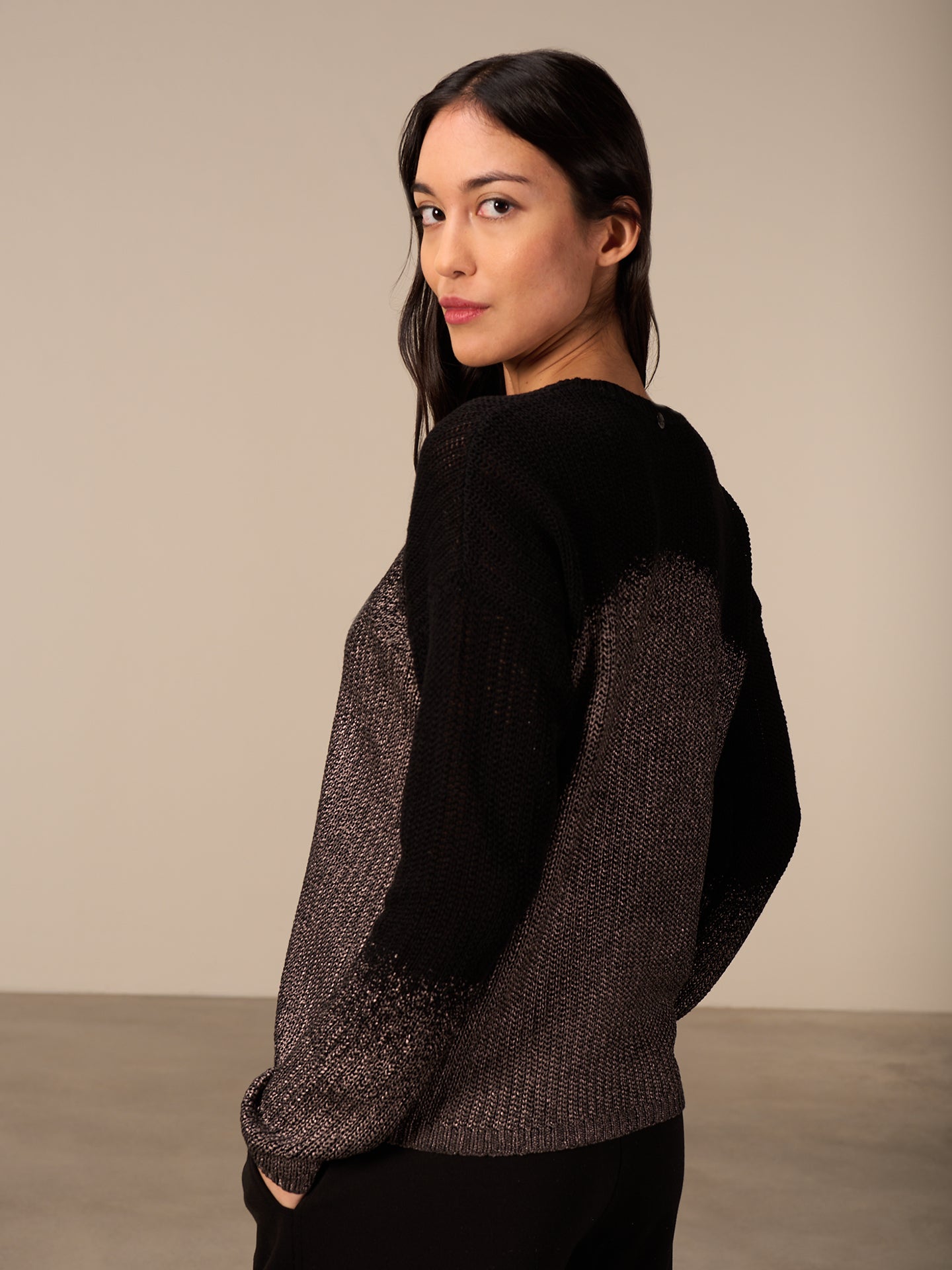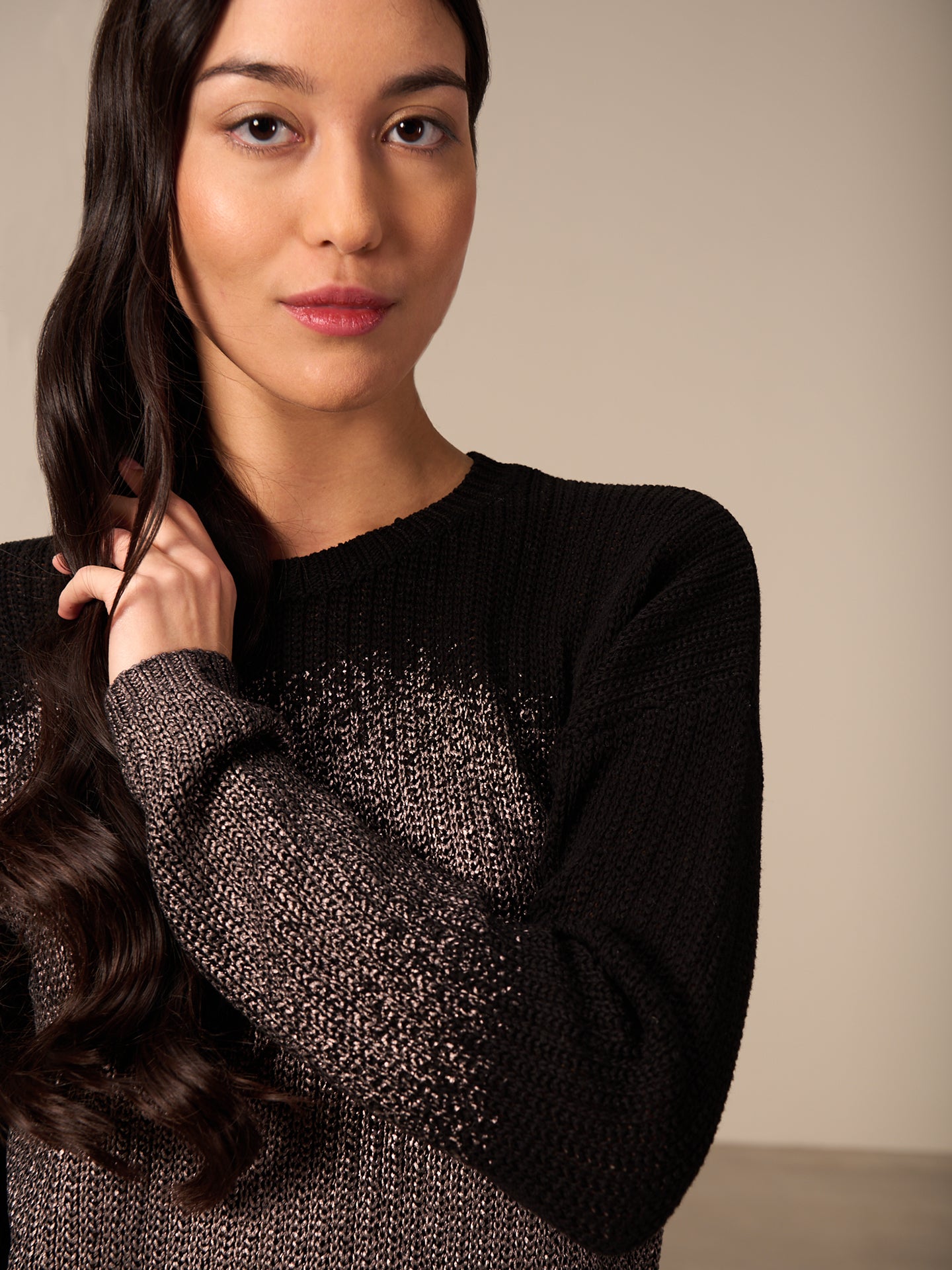 Gerade geschnittener Pulllover mit Rundhalsausschnitt und Rippenborte. Mit auslaufendem, glänzendem Druck ist dieser Pullover ein kuscheliger Begleiter für die Festtage.