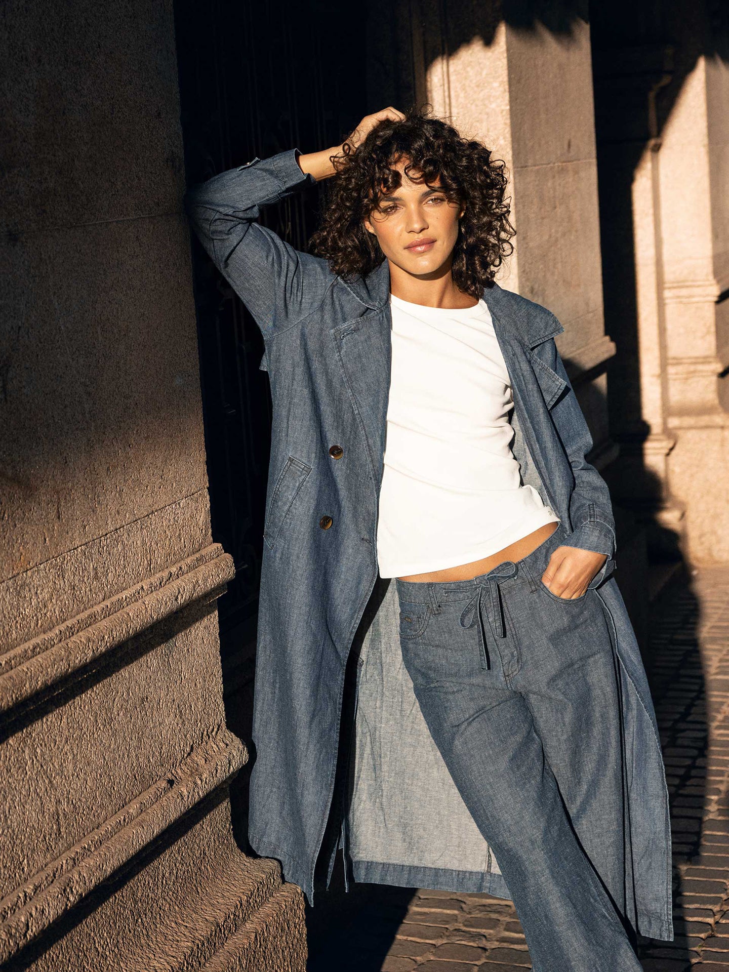 Eine Jeansversion des zeitlosen langen Trenchcoat, leicht oversized mit Reverskragen und Doppelreiherverschluss. Der Leinenanteil in der leichten Baumwollstoffmischung sorgt für den idealen Tragekomfort.