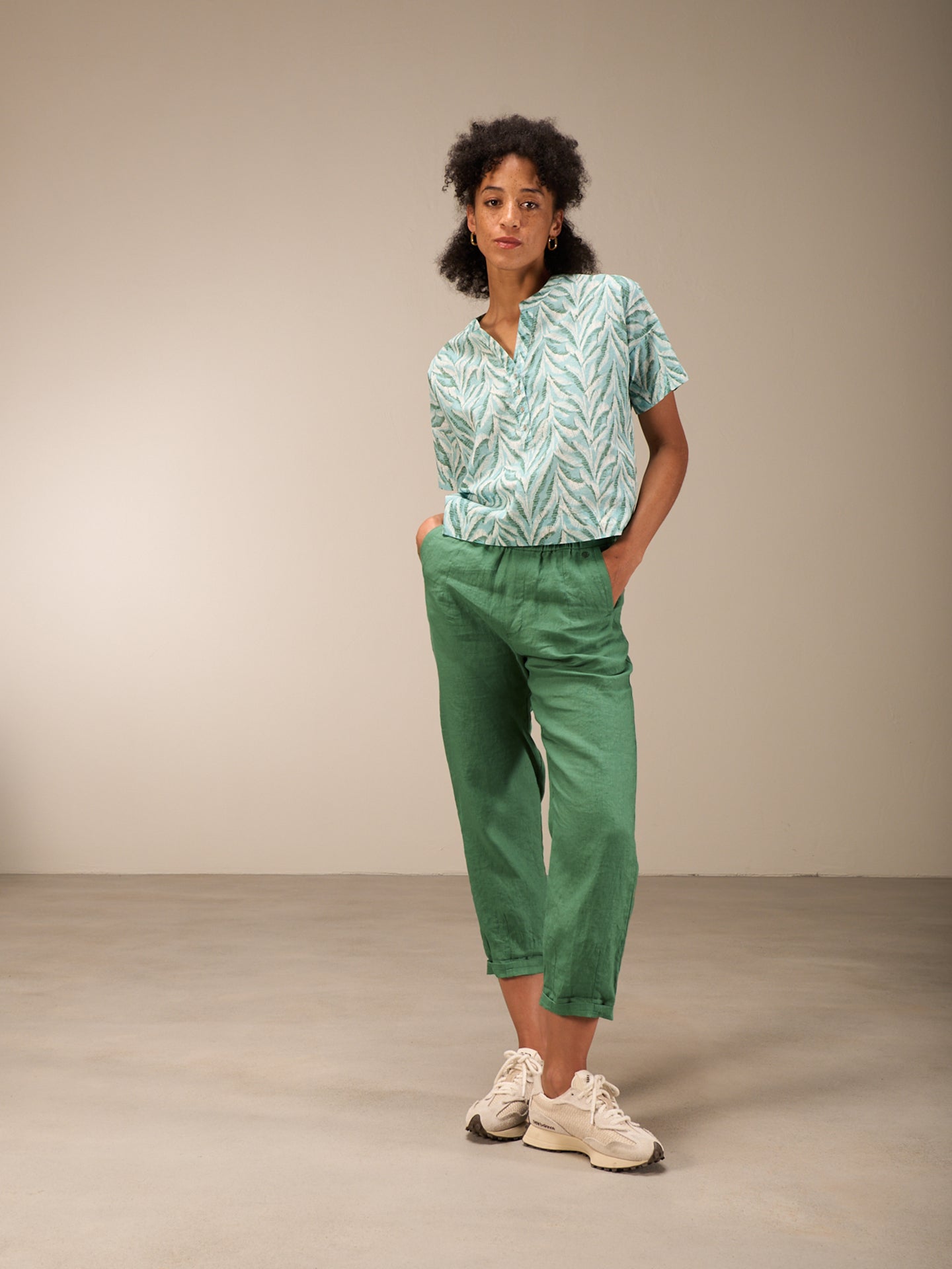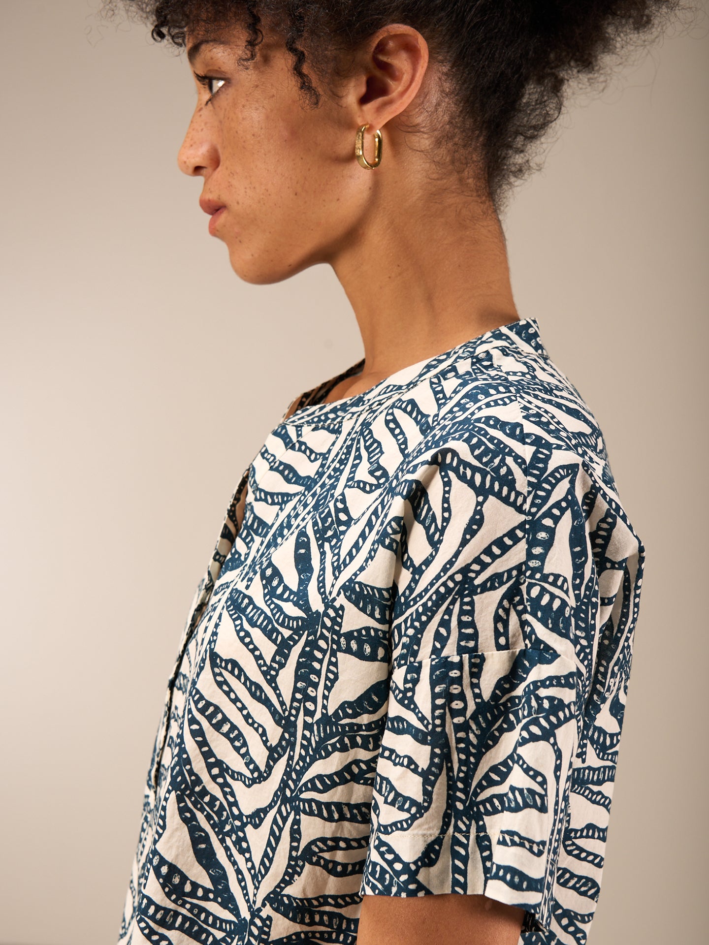 Wide, boxy-cut short-sleeved blouse with a small stand-up collar and a button placket with small metal buttons in a hand-drawn all-over print. A wide hem with small side slits round off the style.