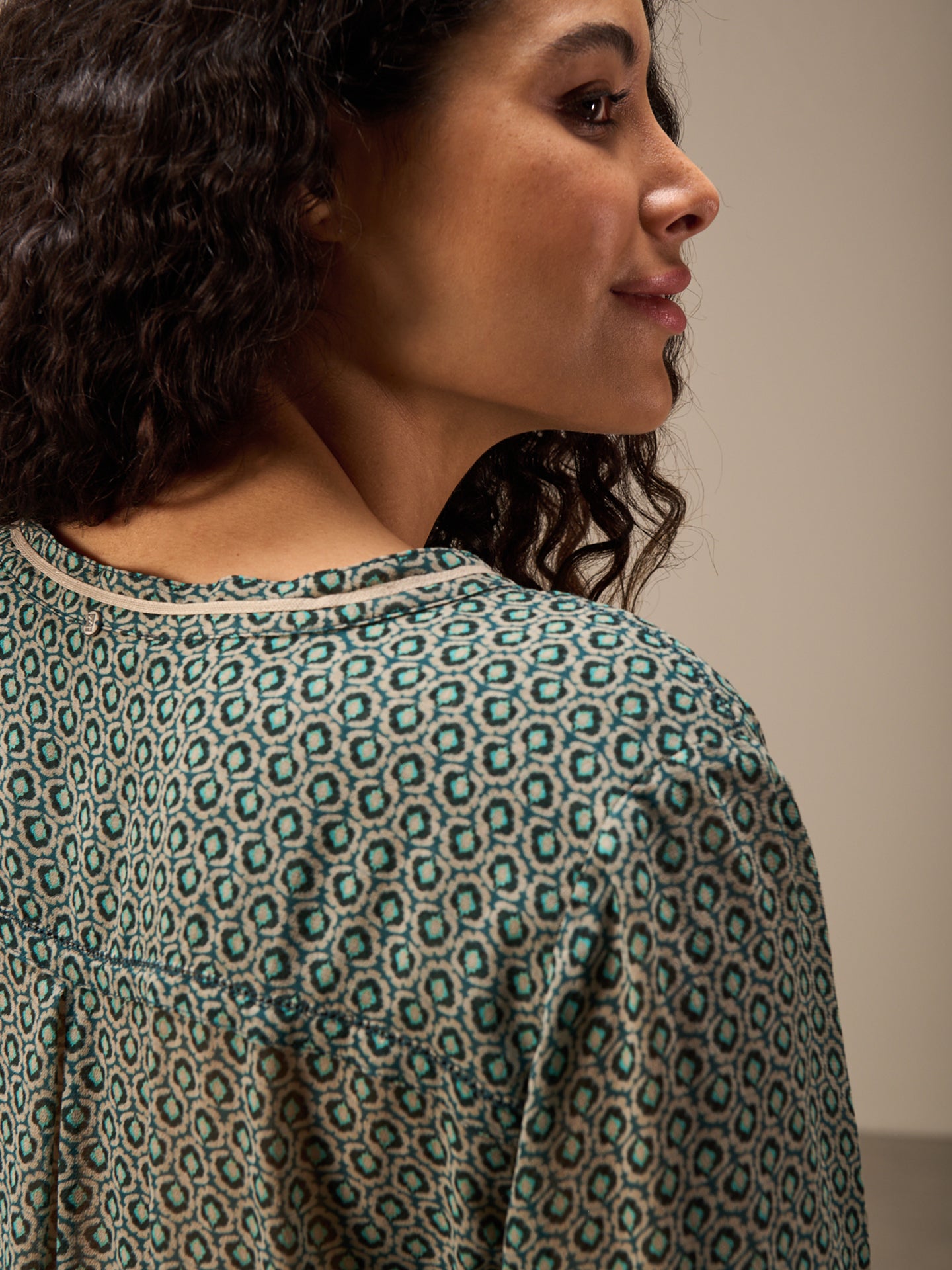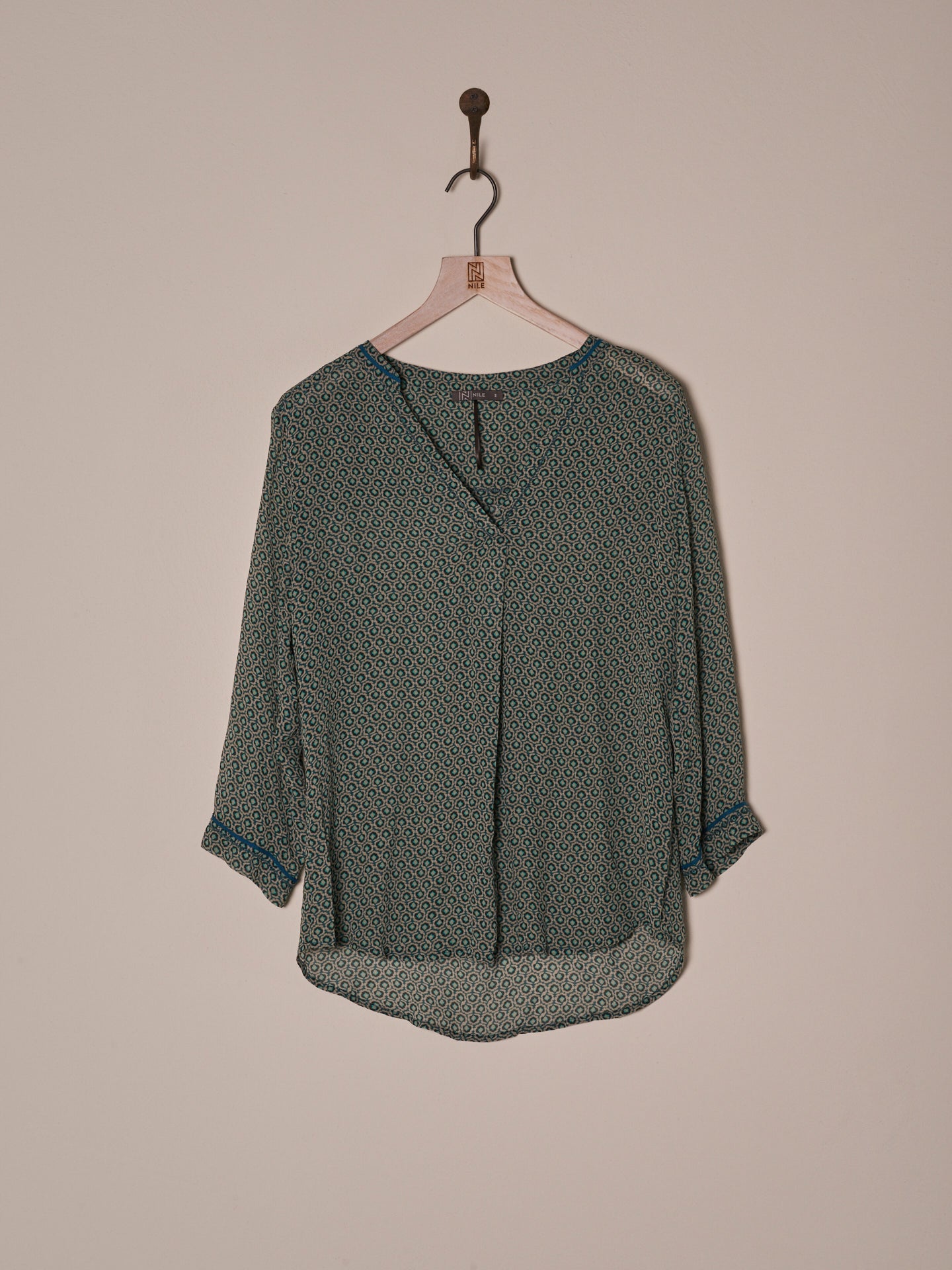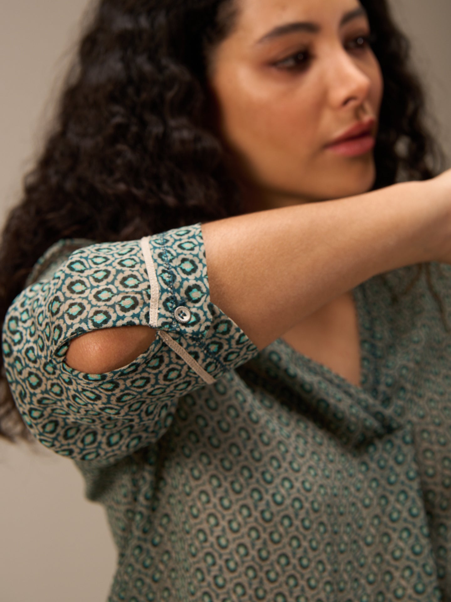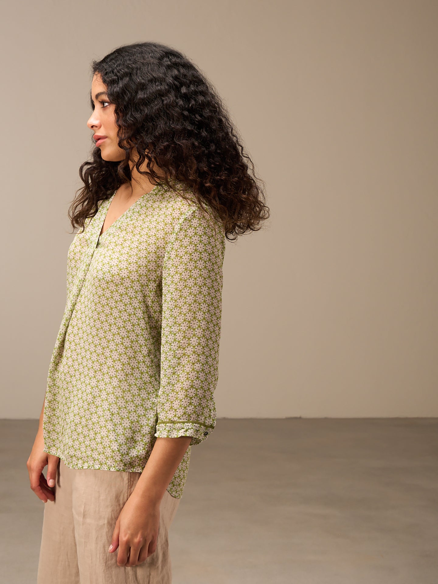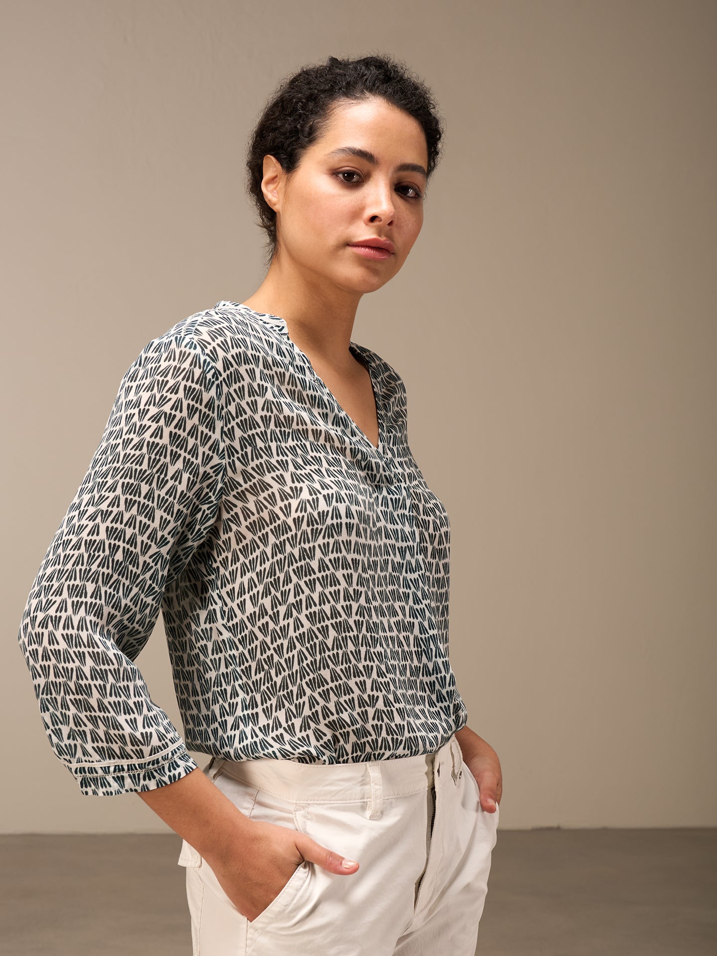 Straight-cut blouse with 3/4 sleeves, feminine V-neckline and hand-drawn all-over print.