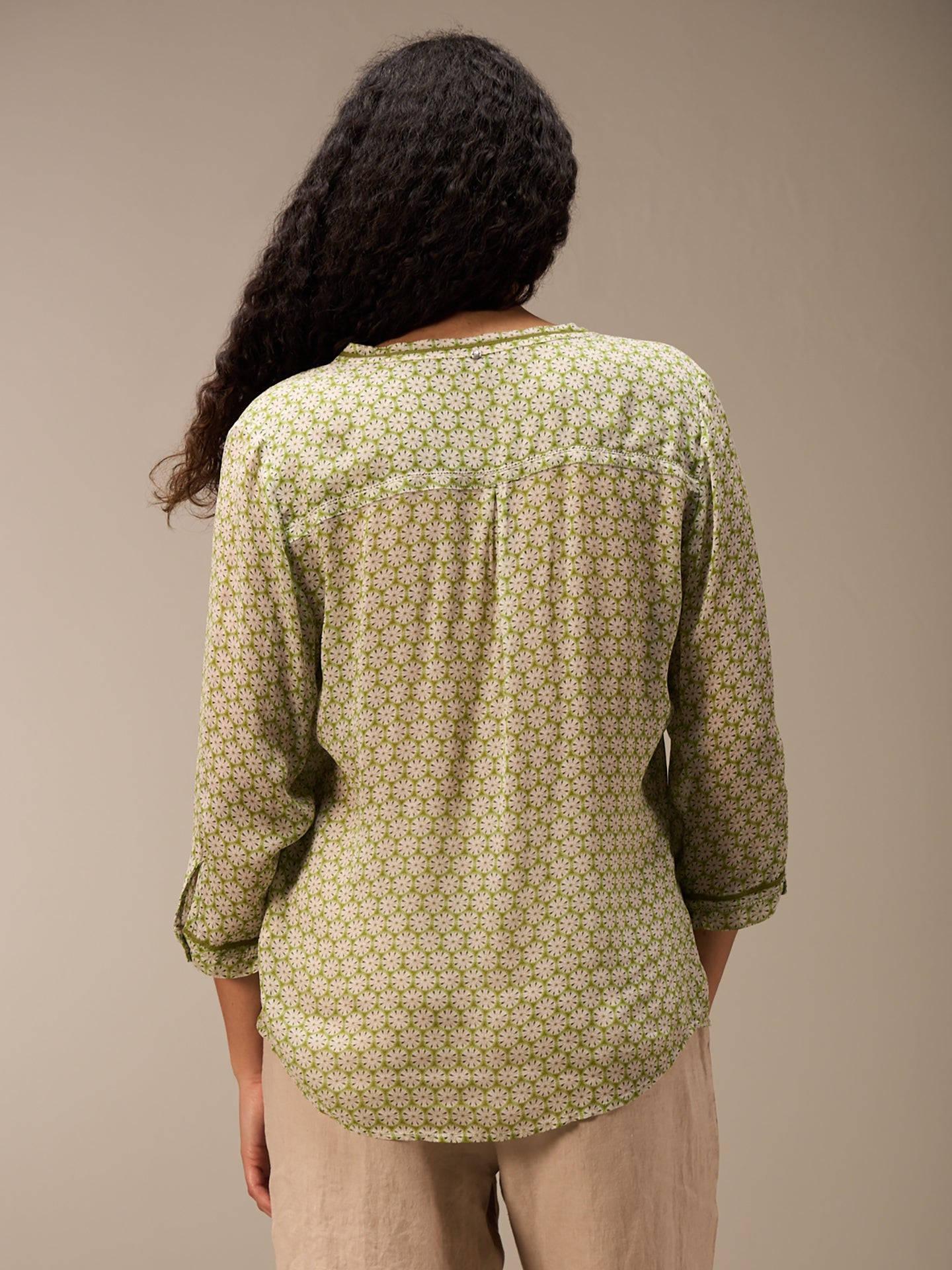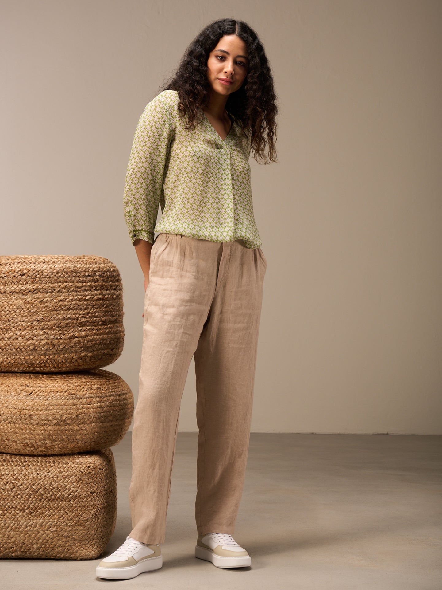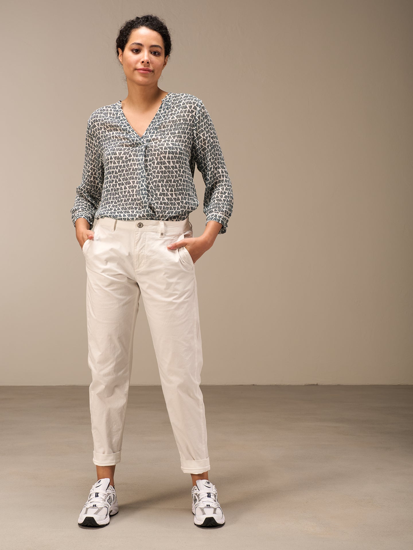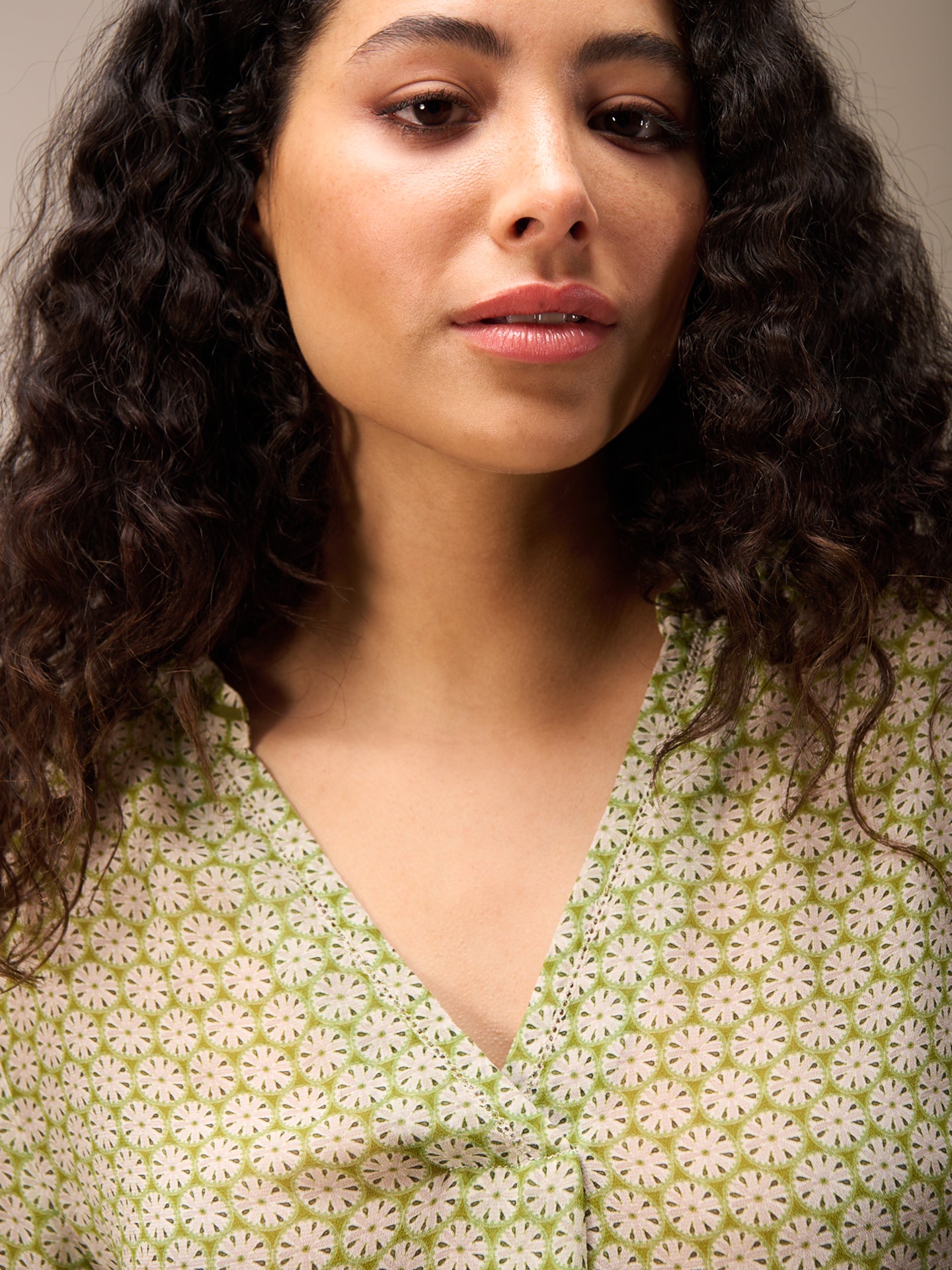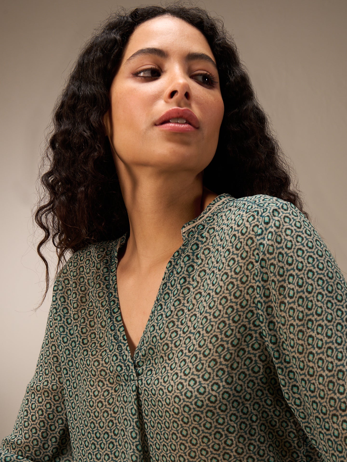 Straight-cut blouse with 3/4 sleeves, feminine V-neckline and hand-drawn all-over print.