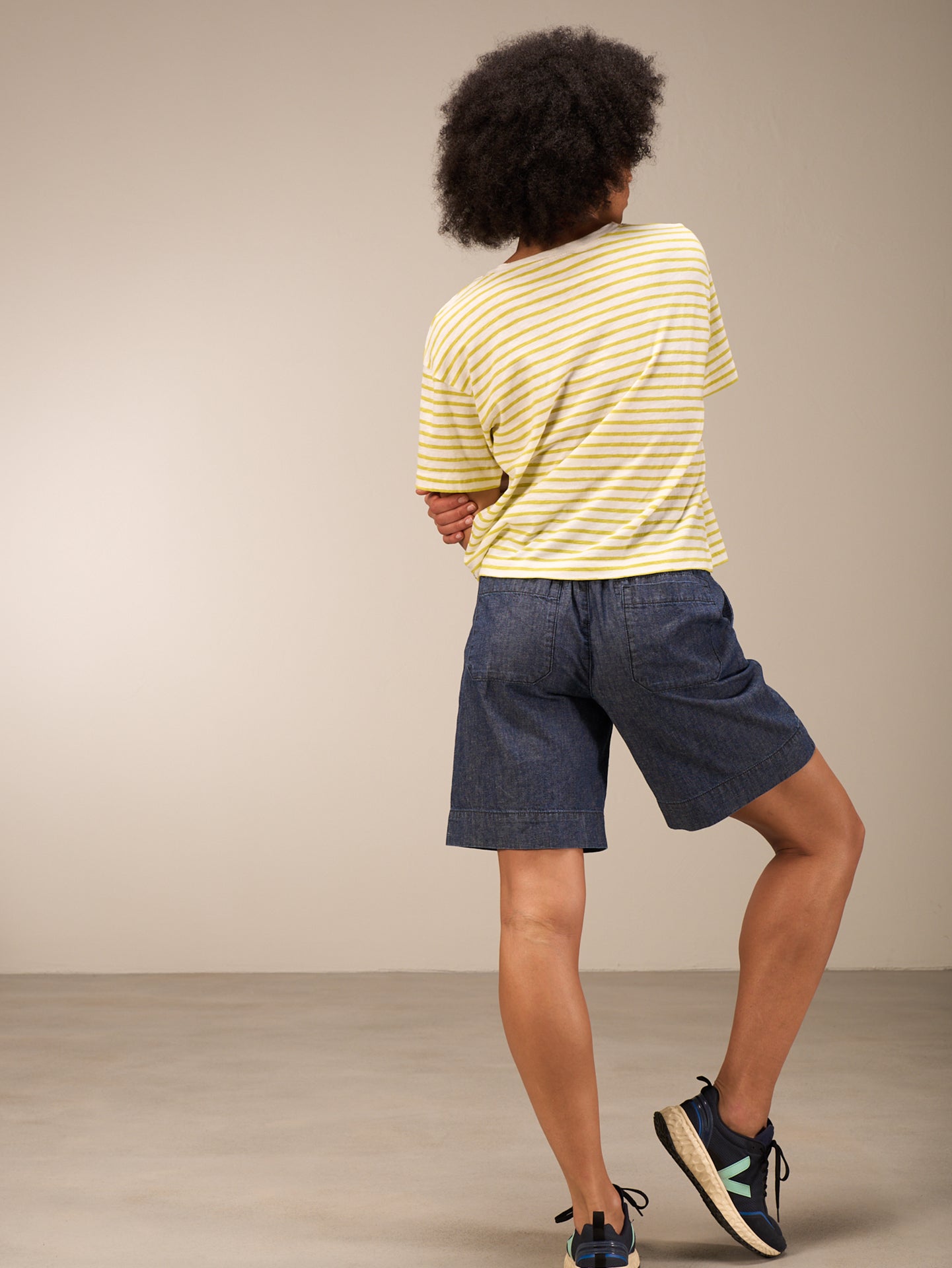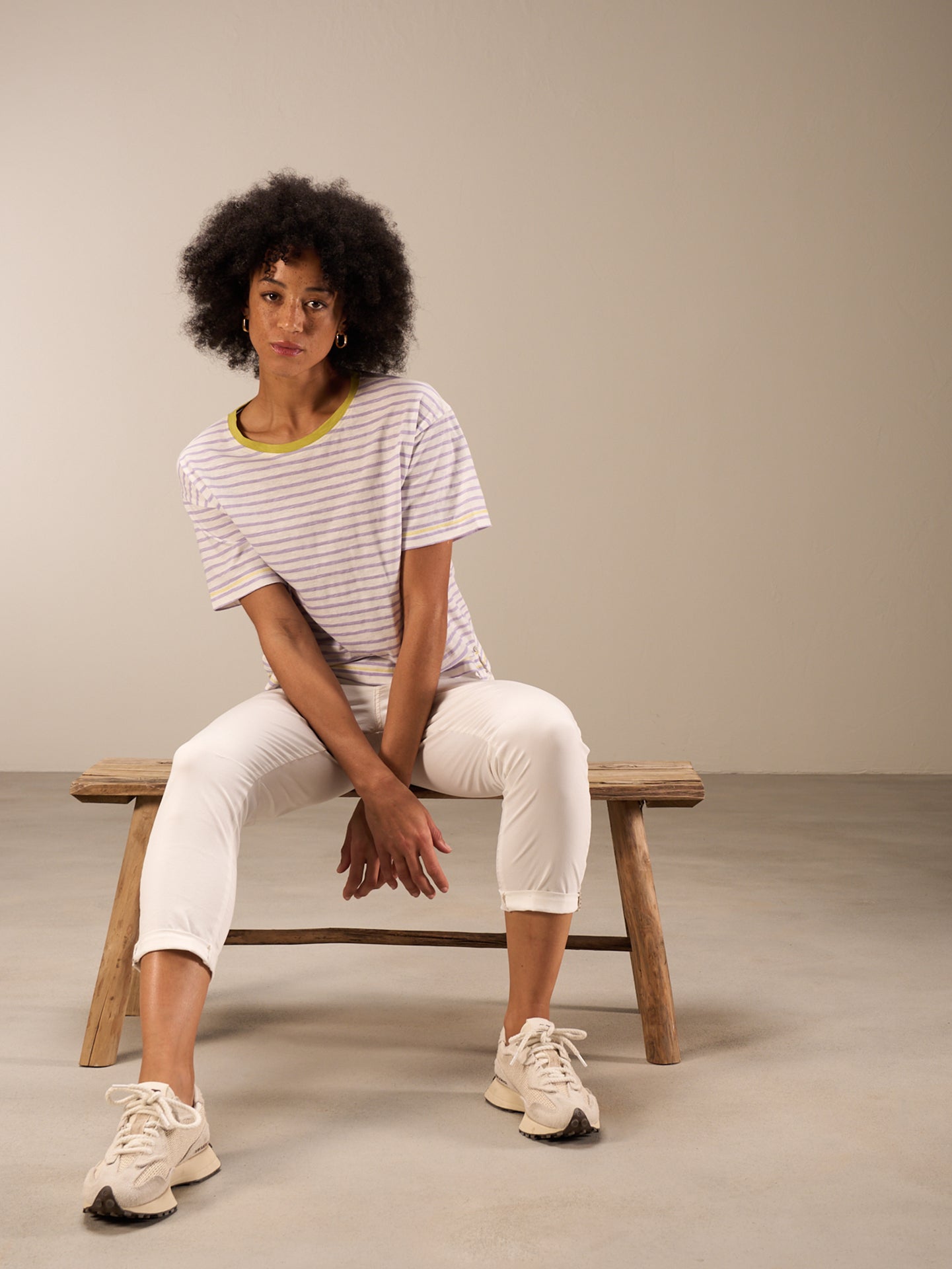 Trendy short-sleeved shirt in a cropped, boxy shape with a fashionable round neckline. The flamed jersey and all-over stripe print make this shirt a favourite summer companion.
