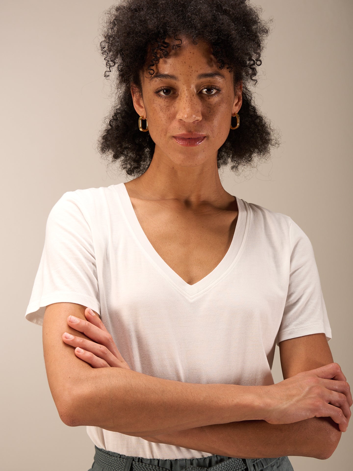 Loose-fitting shirt with short sleeves and a heart-shaped V-neckline. Composed of 70% viscose made from bamboo fibers and 30% organic cotton from certified farms. Piece-dyed.