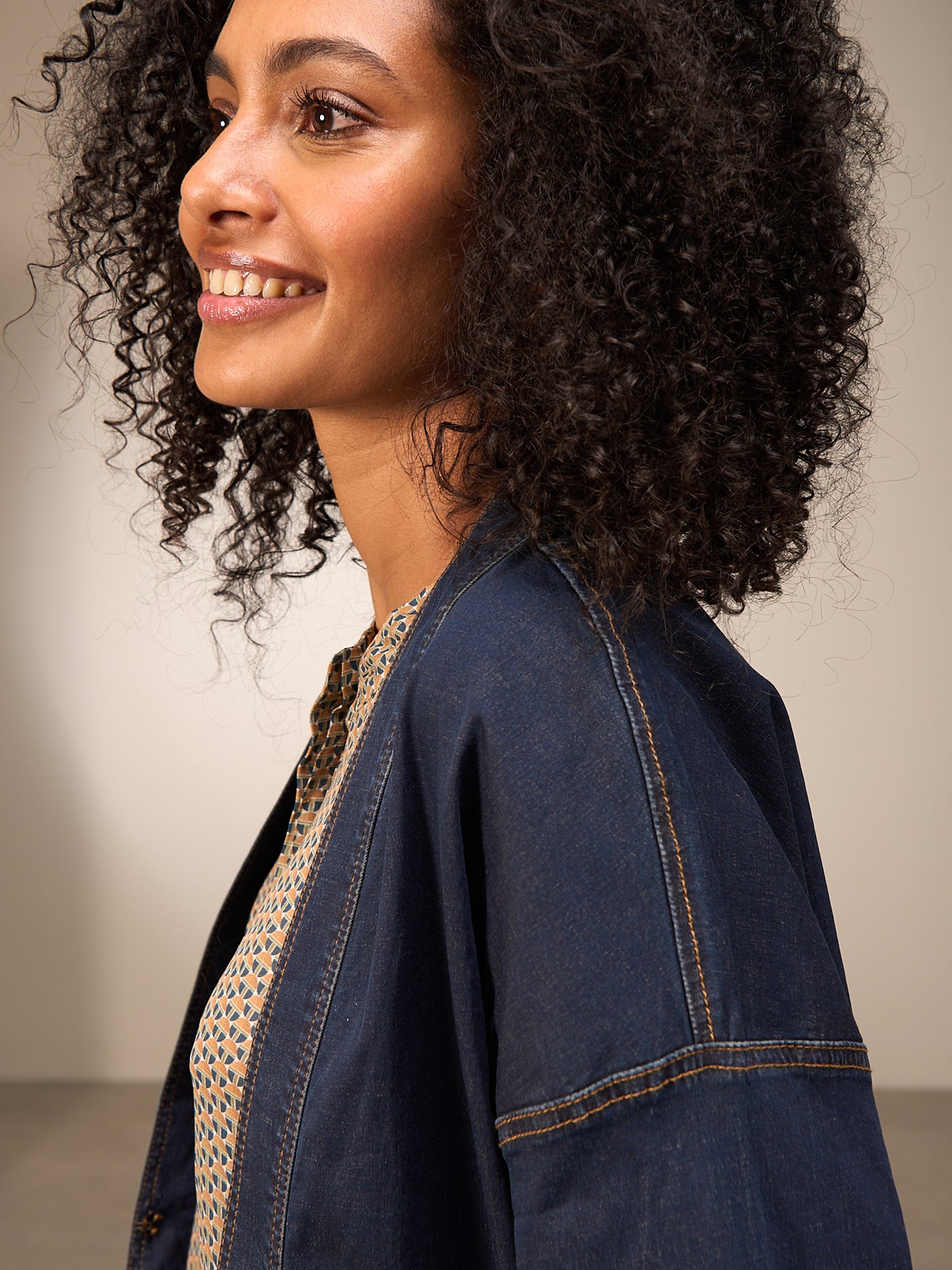 Kimono-inspired jacket with large patch pockets and a fine hook fastening. The jacket guarantees a comfortable fit thanks to the thin denim in classic denim washes. Irregularities in the colour make the piece unique. The fading effect is intensified. The product may rub off on clothing and surfaces.