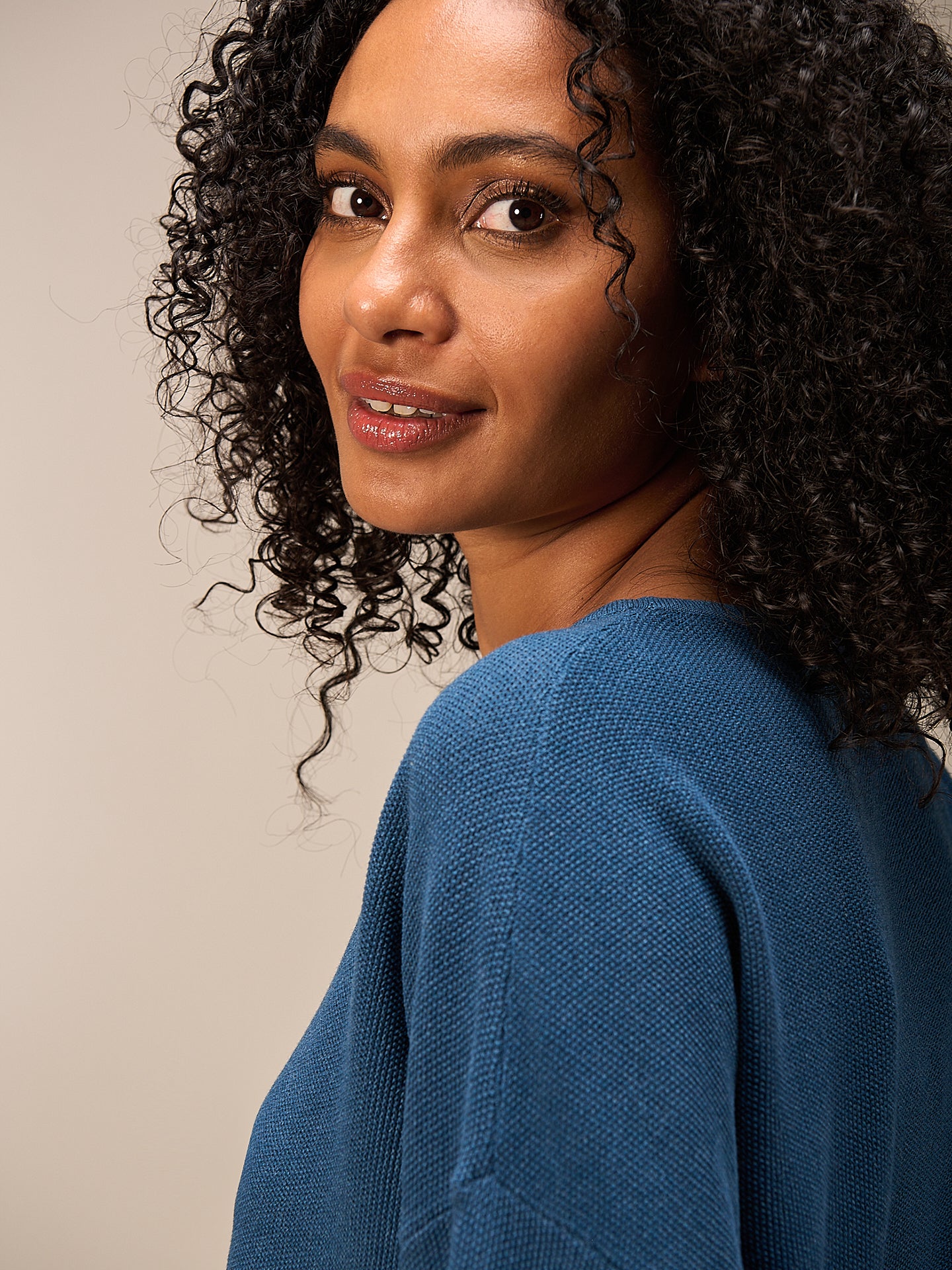 Loose pullover with a boat neckline and dropped shoulders in a half-pattern and melange yarn. 60% organic cotton from OCS-certified farms and 40% recycled polyester. The Organic Content Standard (OCS) verifies the percentage of organically grown materials in a final product and ensures that the information about the percentage of organic material is correct by means of seamless traceability.