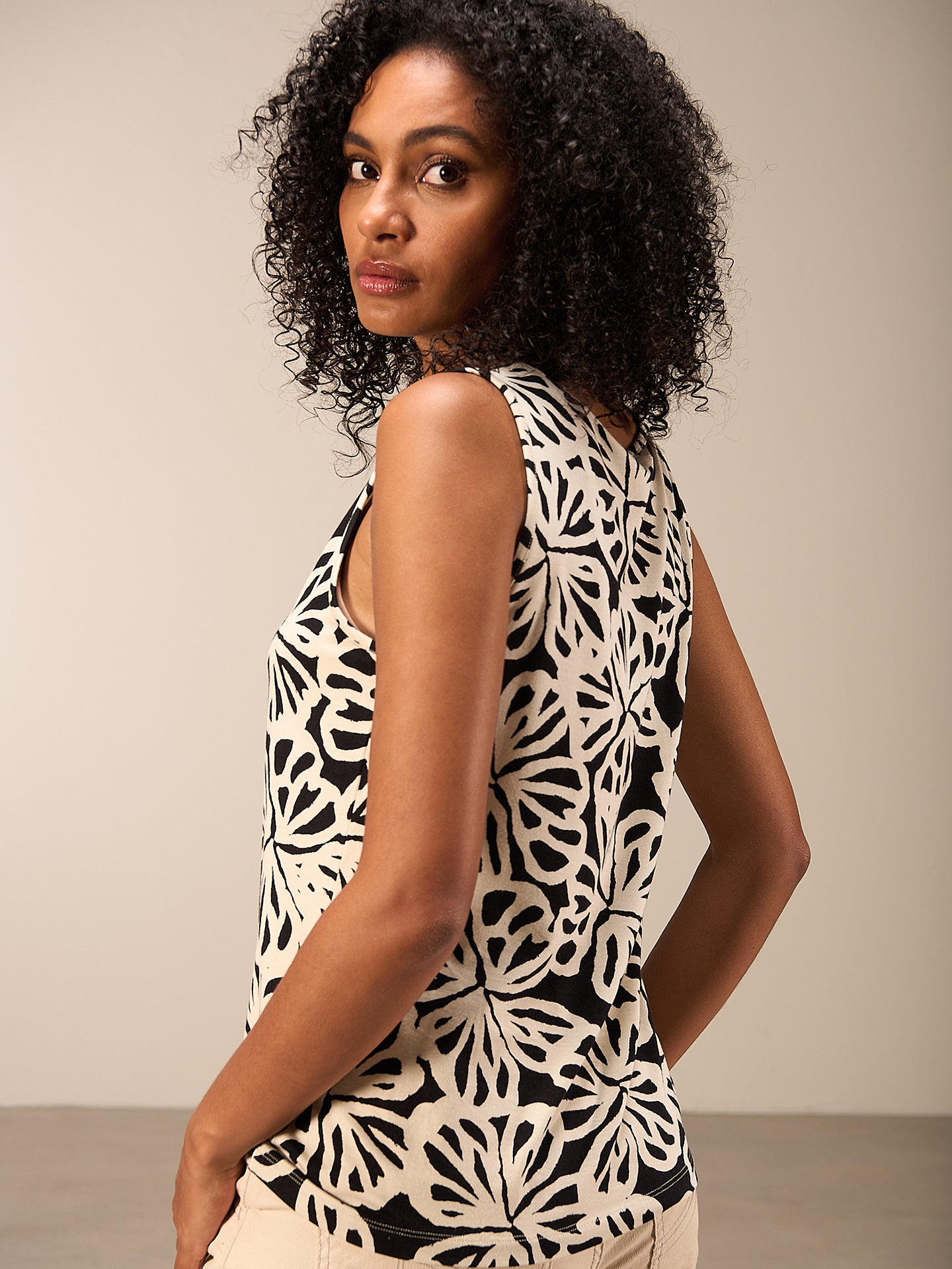 Casual cut top with a boat neckline and side slits in an appealing black and white look. Thanks to the high-quality Tencel fabric, this top is soft and flowing to wear without being transparent.