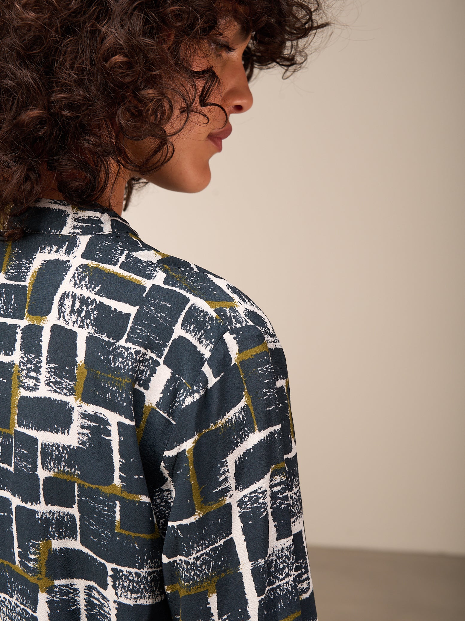 Slightly cropped, boxy blouse with a stand-up collar, short concealed button placket and straight 3/4-length sleeves. The matching hand-drawn all-over print and the soft, flowing, opaque material round off the blouse's look.