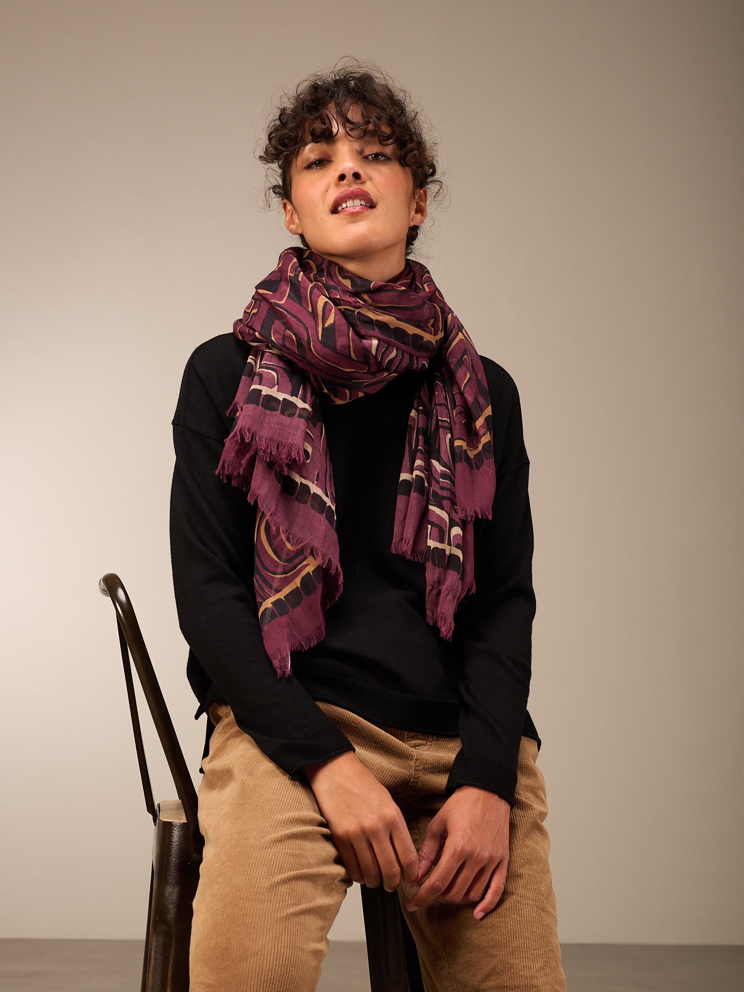 The large 120x200cm size is perfect for varied styling. Casually draped around the neck and shoulders, this scarf will instantly enhance any outfit and become a favourite accessory. The scarf is printed all over with hand-drawn prints and has shorter edges with fringes.