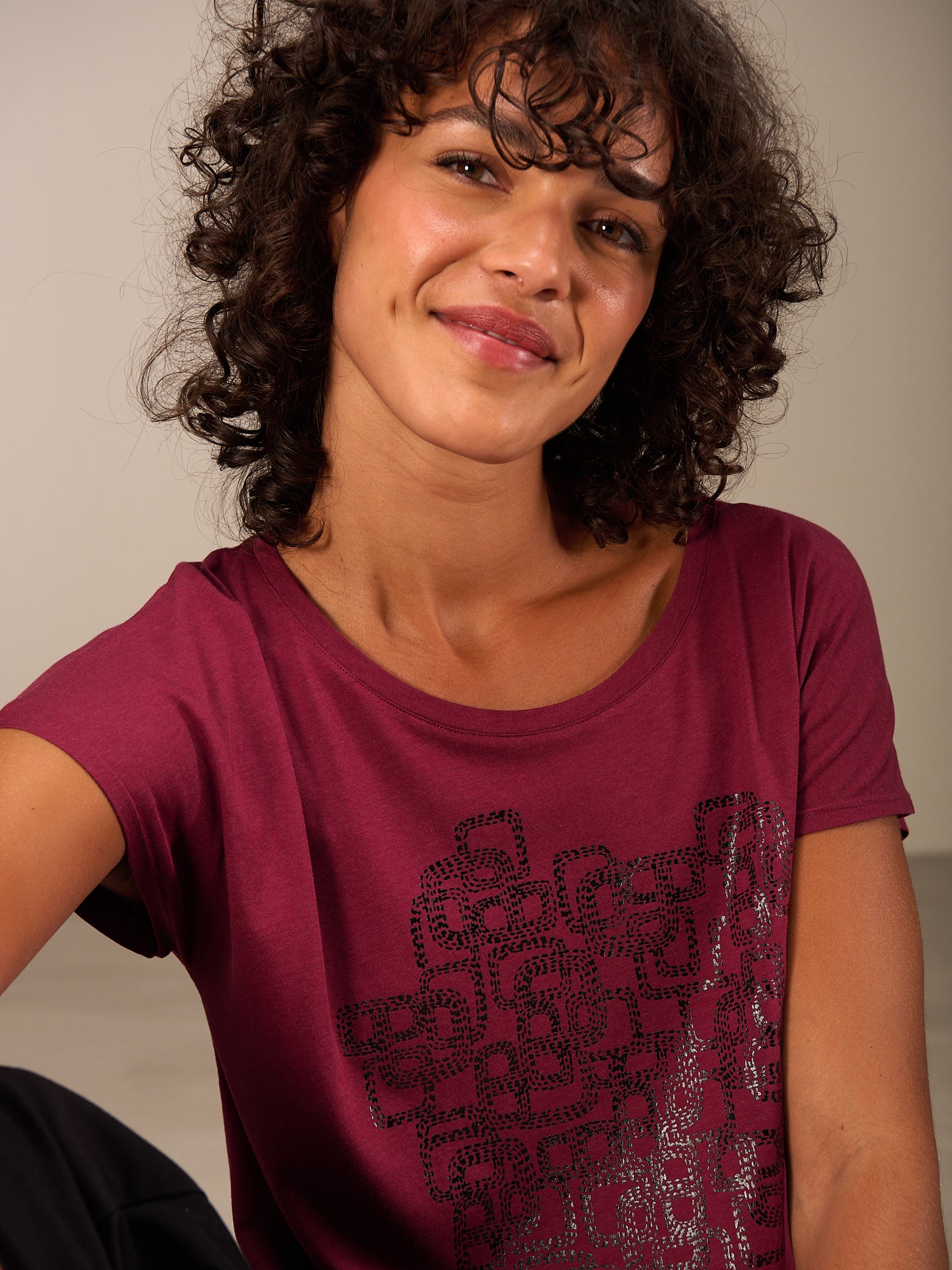 Loose-fitting round-neck shirt with a placed print. The perforated lace seams at the back add that certain something to this high-quality shirt.