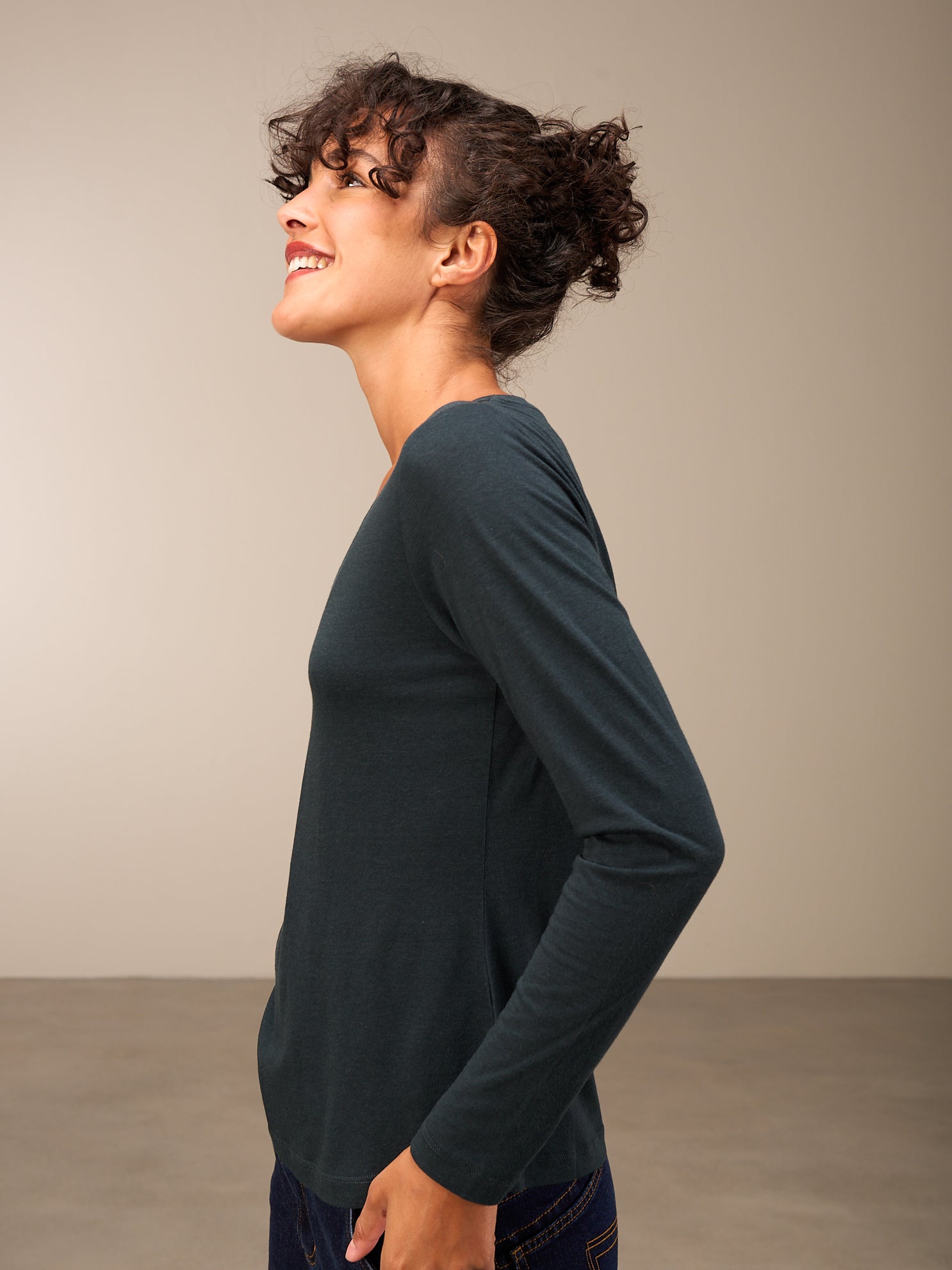 Casual long-sleeved shirt with a V-neckline and long, narrow sleeves.