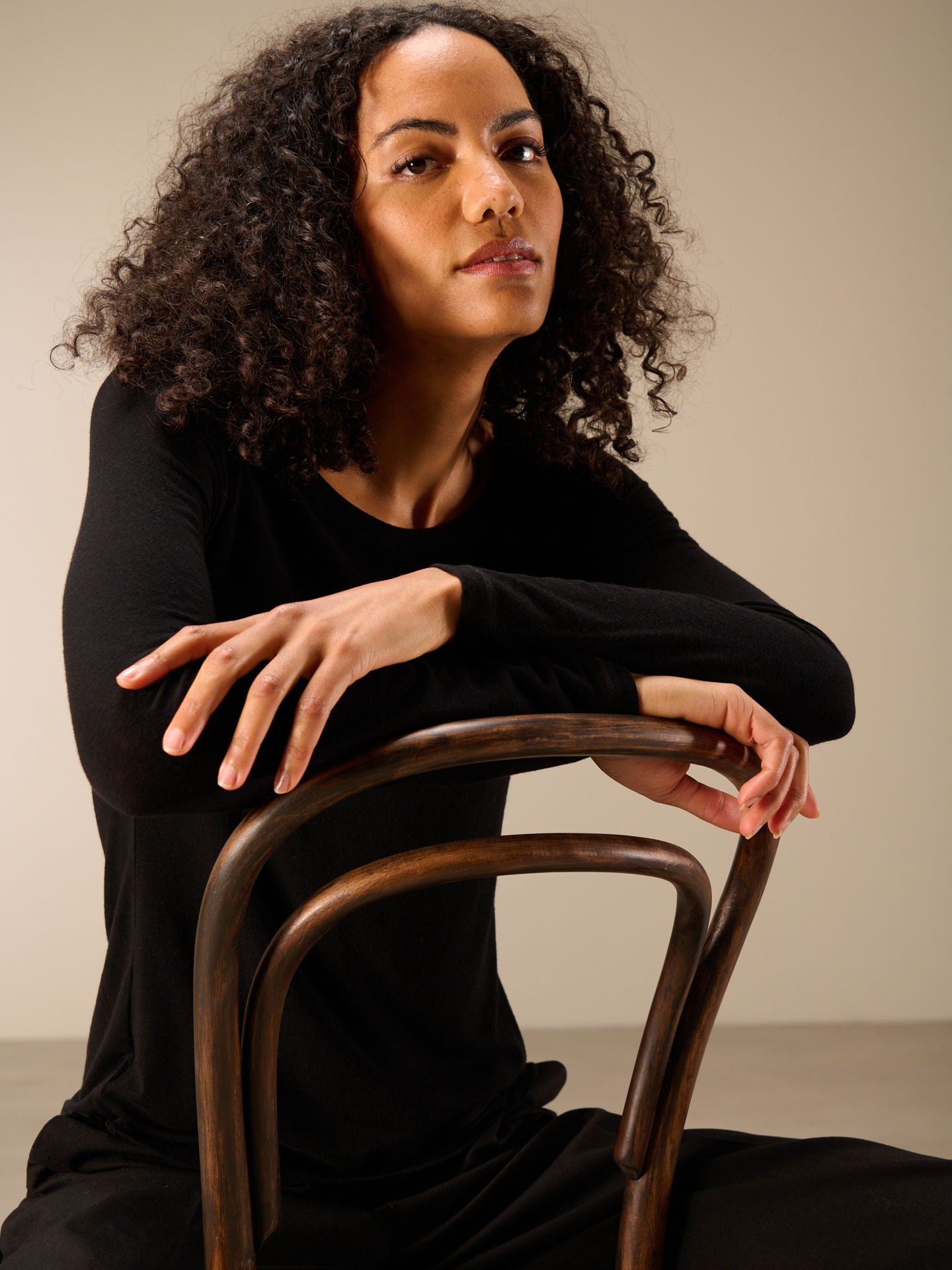Loose-fitting long-sleeved shirt with a round neckline and a warming wool content.