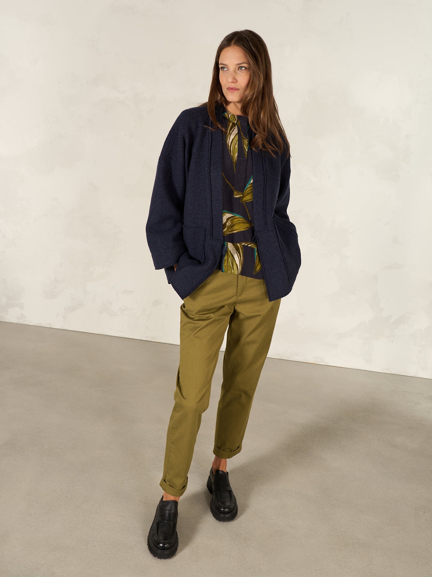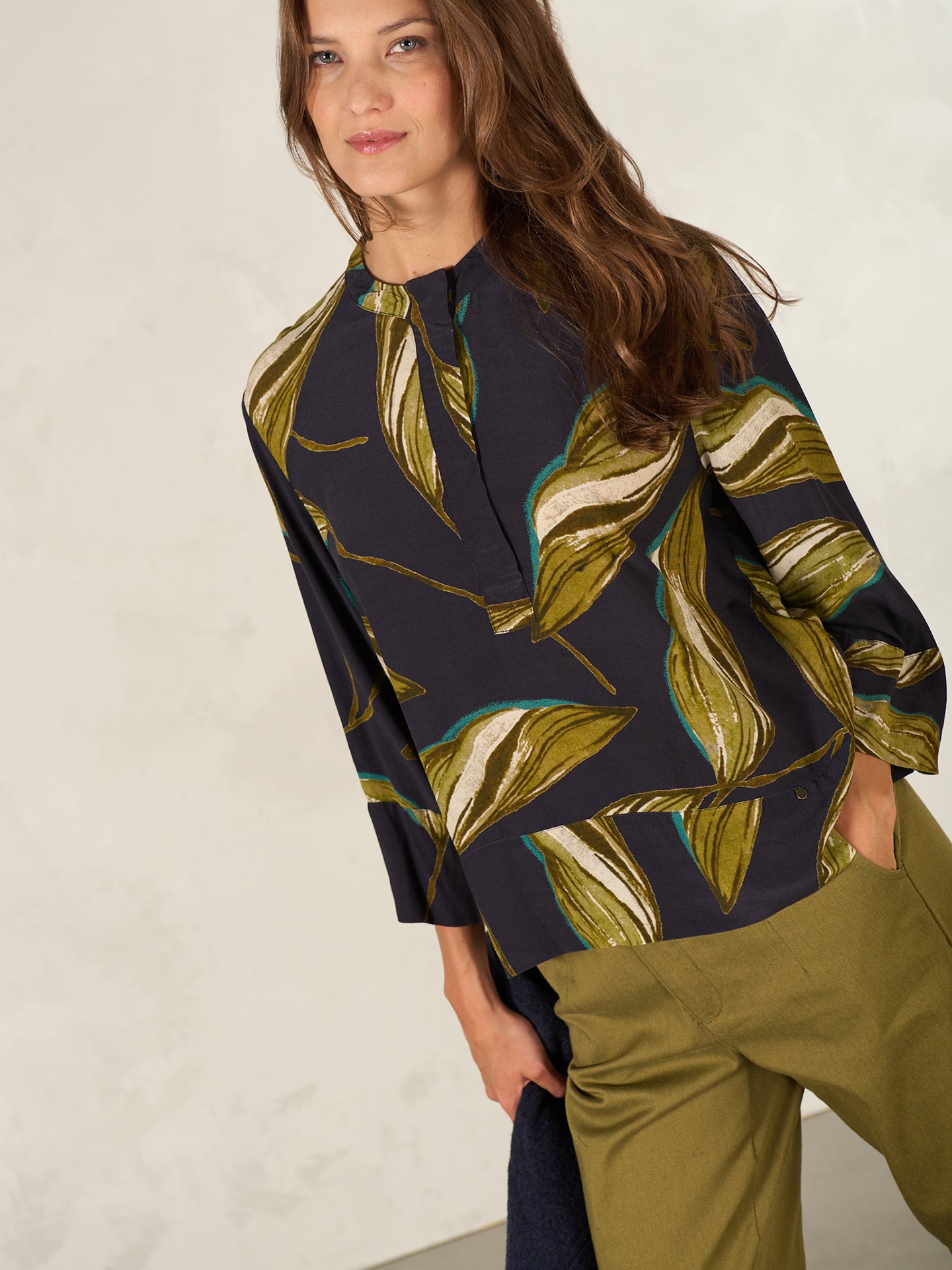 Slightly cropped, boxy blouse with a stand-up collar, short concealed button placket and straight 3/4-length sleeves. The matching hand-drawn all-over print completes the look of the blouse.
