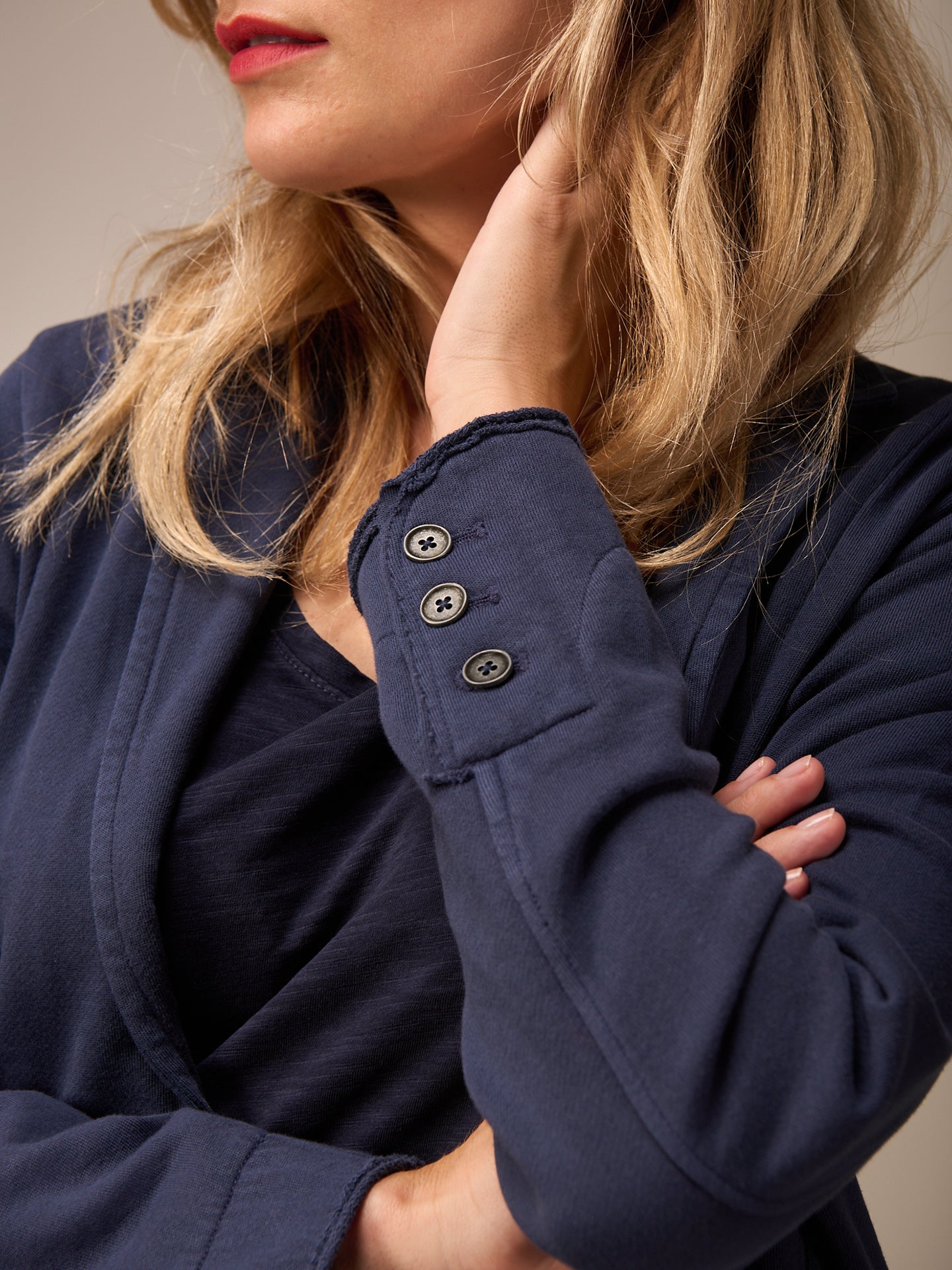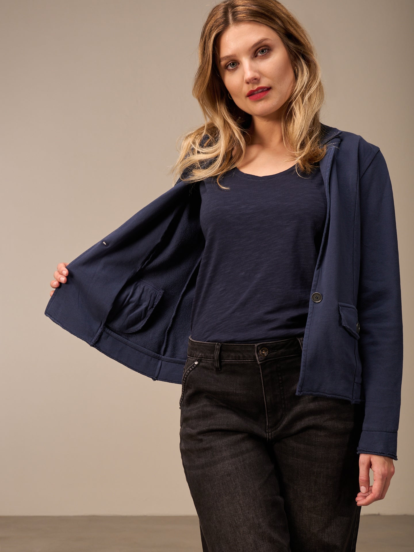 Blazer jacket in a slim silhouette with a lapel collar and patch pockets with an open-edged hem. Made from 100% GOTS-certified organic cotton. Piece-dyed; irregularities in the color mean that every piece is unique. The faded effect is enhanced.