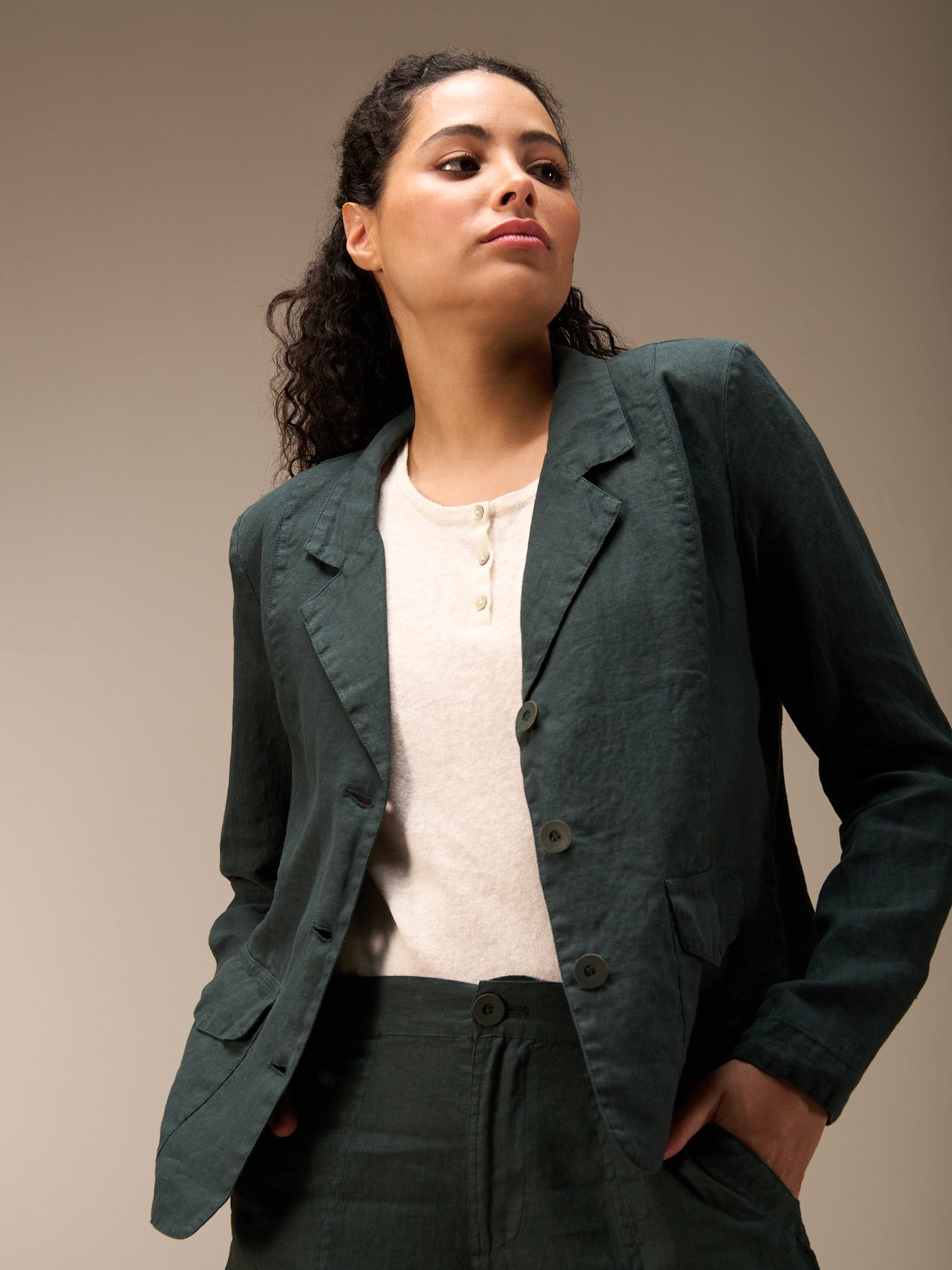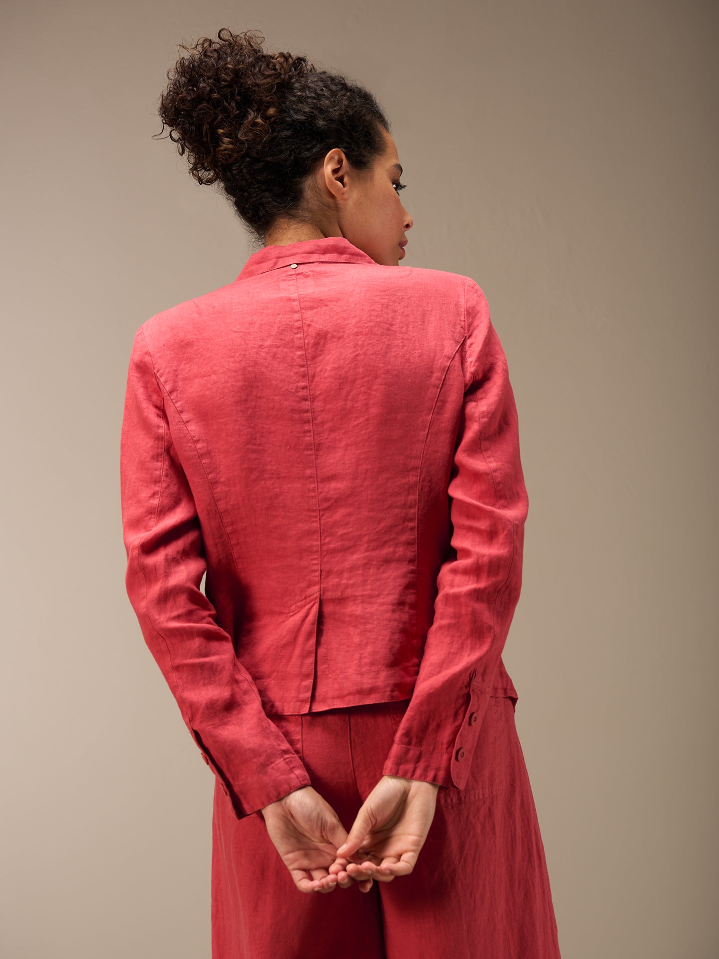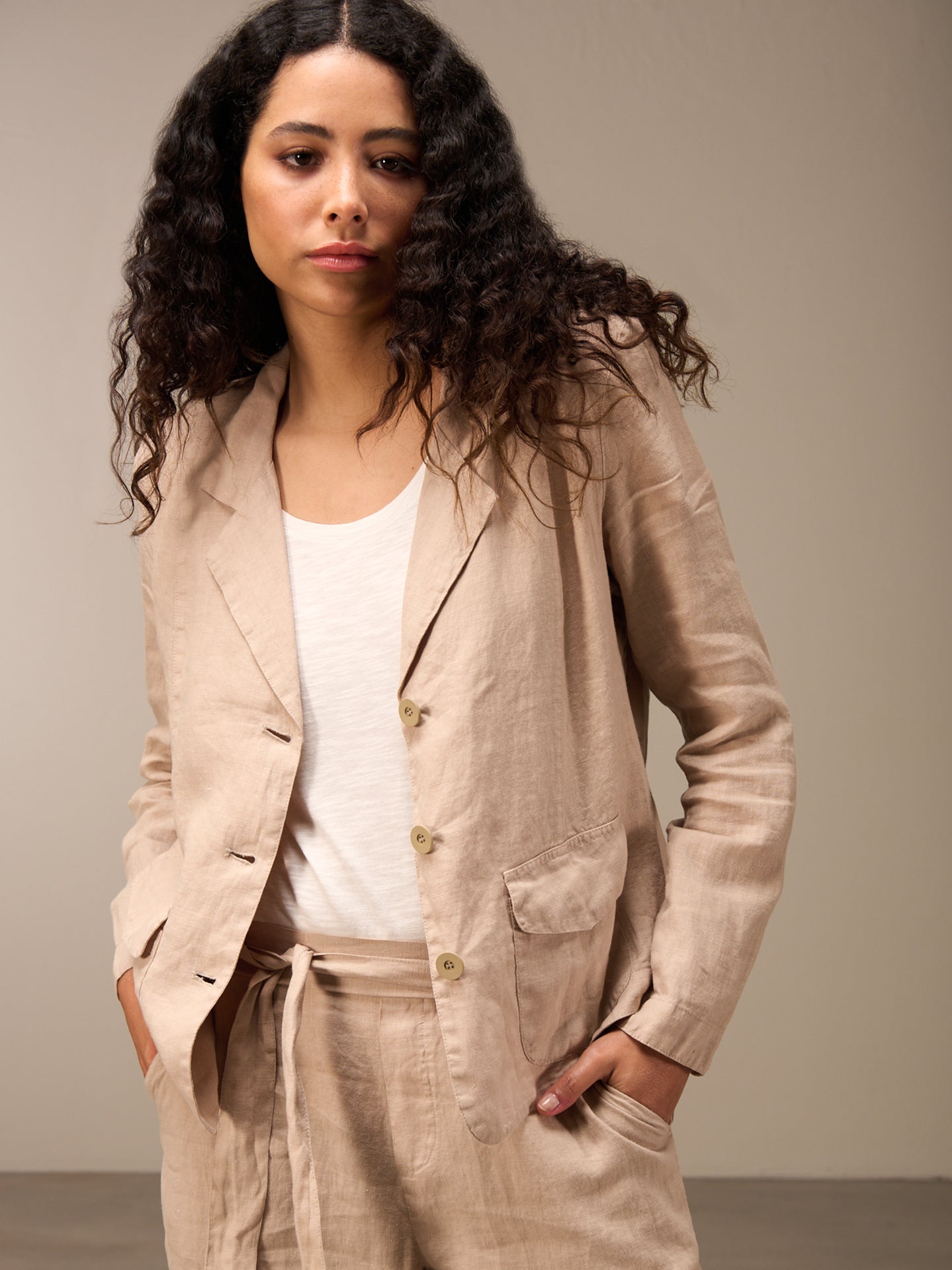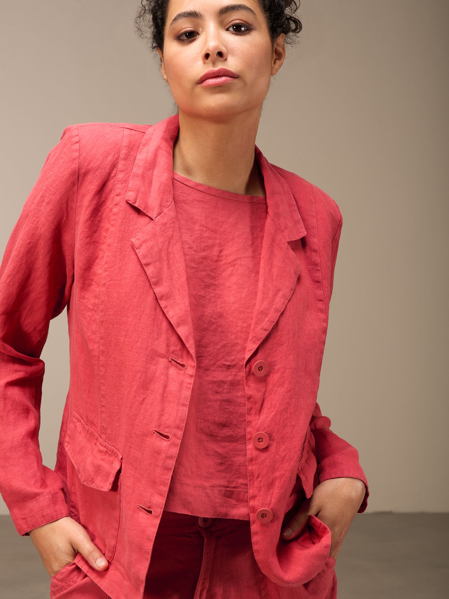 Tailored buttoned blazer with a narrow lapel collar and patch pockets with small flaps. The small shoulder pads ensure a perfect fit. The 100% linen fabric ensures ideal comfort even in summer temperatures.