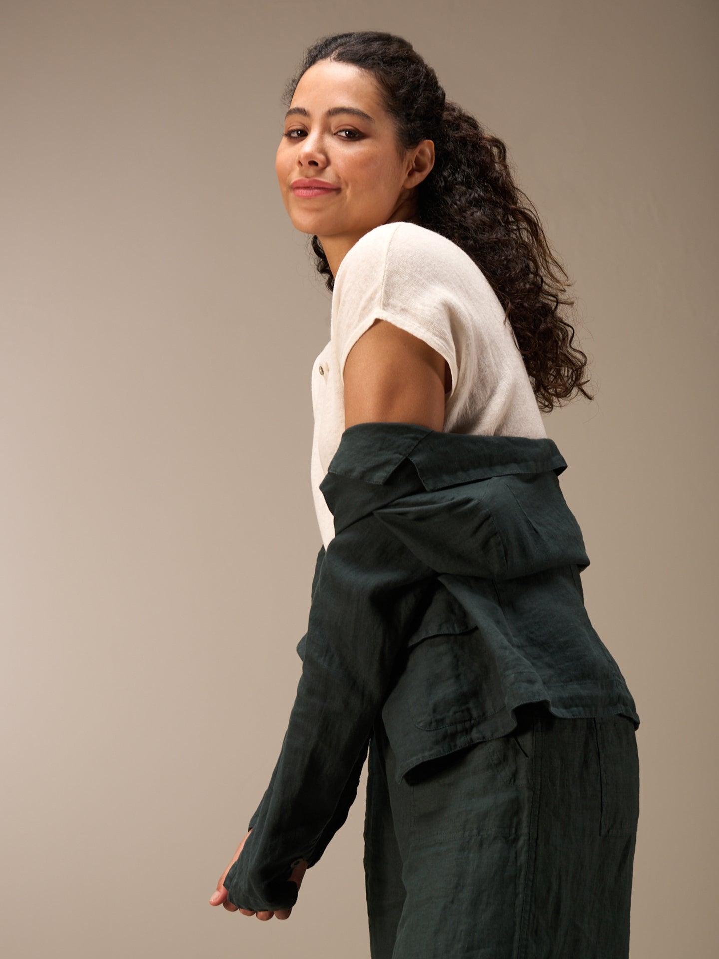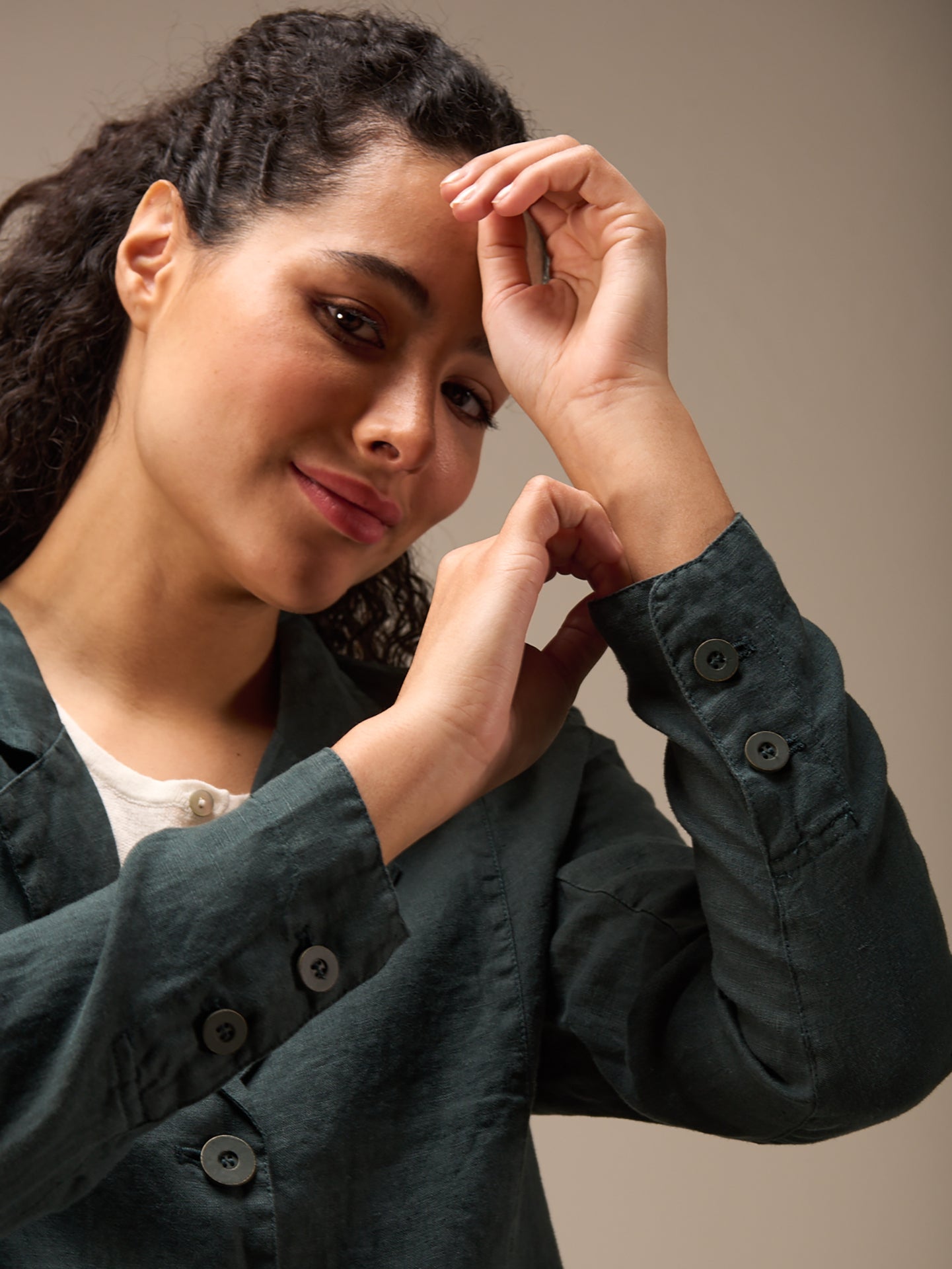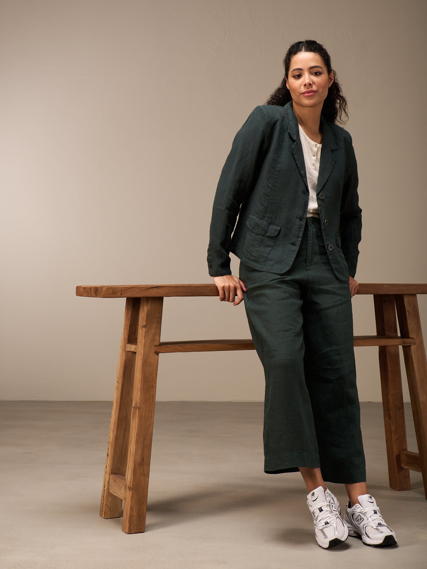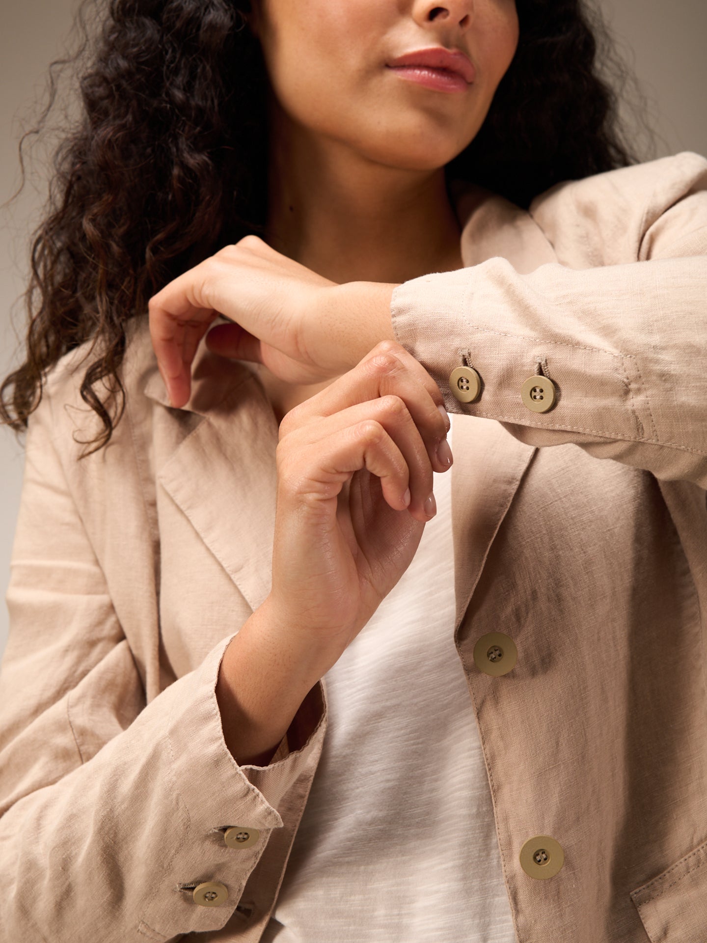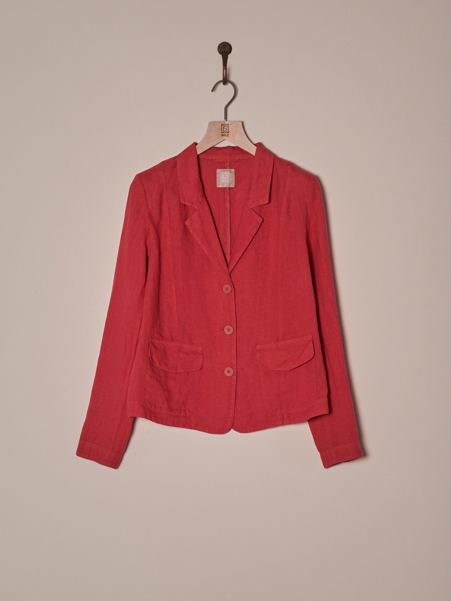 Tailored buttoned blazer with a narrow lapel collar and patch pockets with small flaps. The small shoulder pads ensure a perfect fit. The 100% linen fabric ensures ideal comfort even in summer temperatures.