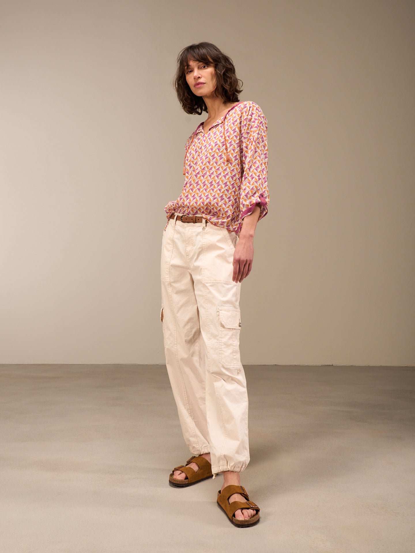 Loose-fitting round neck blouse with small slits and 3/4-length sleeves with turn-up tabs. The decorative tassels on the cords at the neckline make the blouse a real eye-catcher.