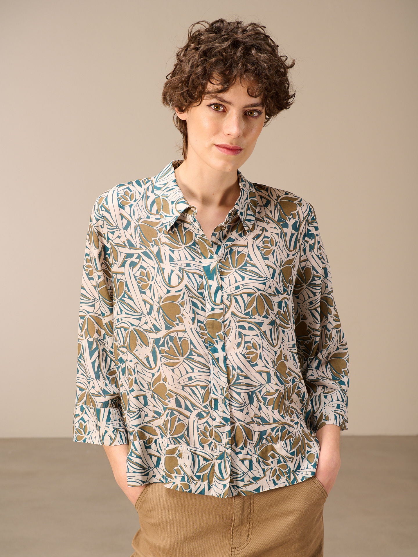 Short button-through chemise blouse with concealed button placket in a straight cut with 3/4 sleeves in popular lightweight yet opaque Tencel fabric.