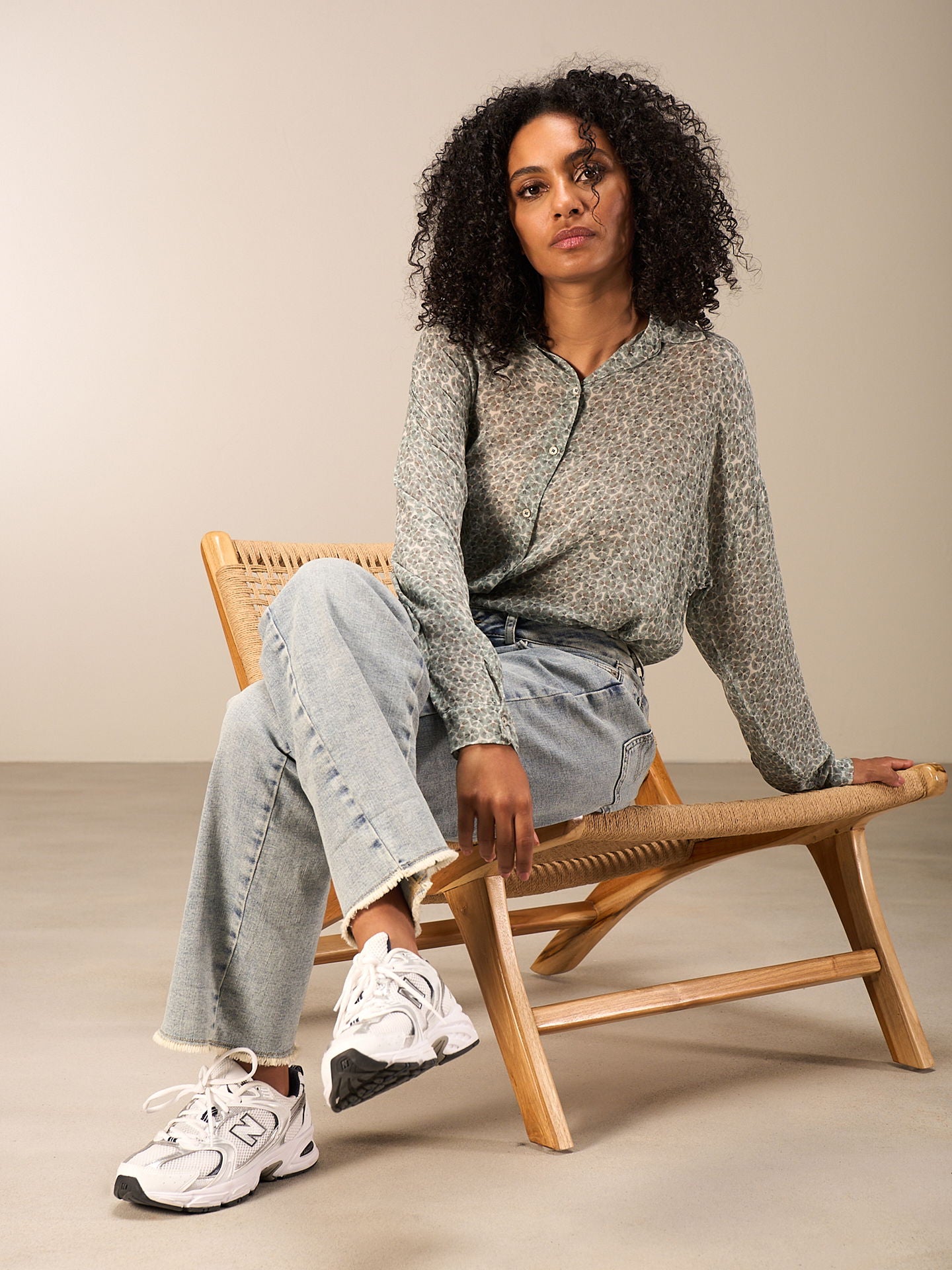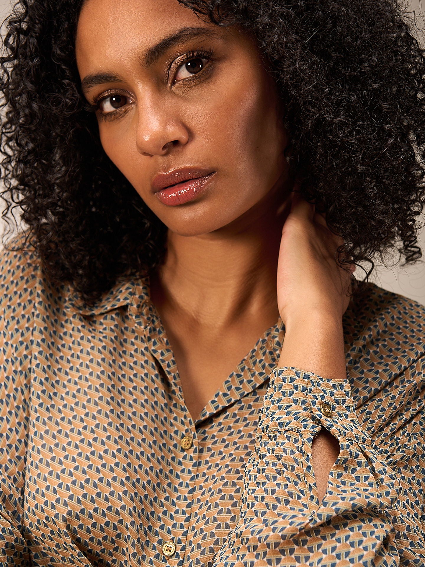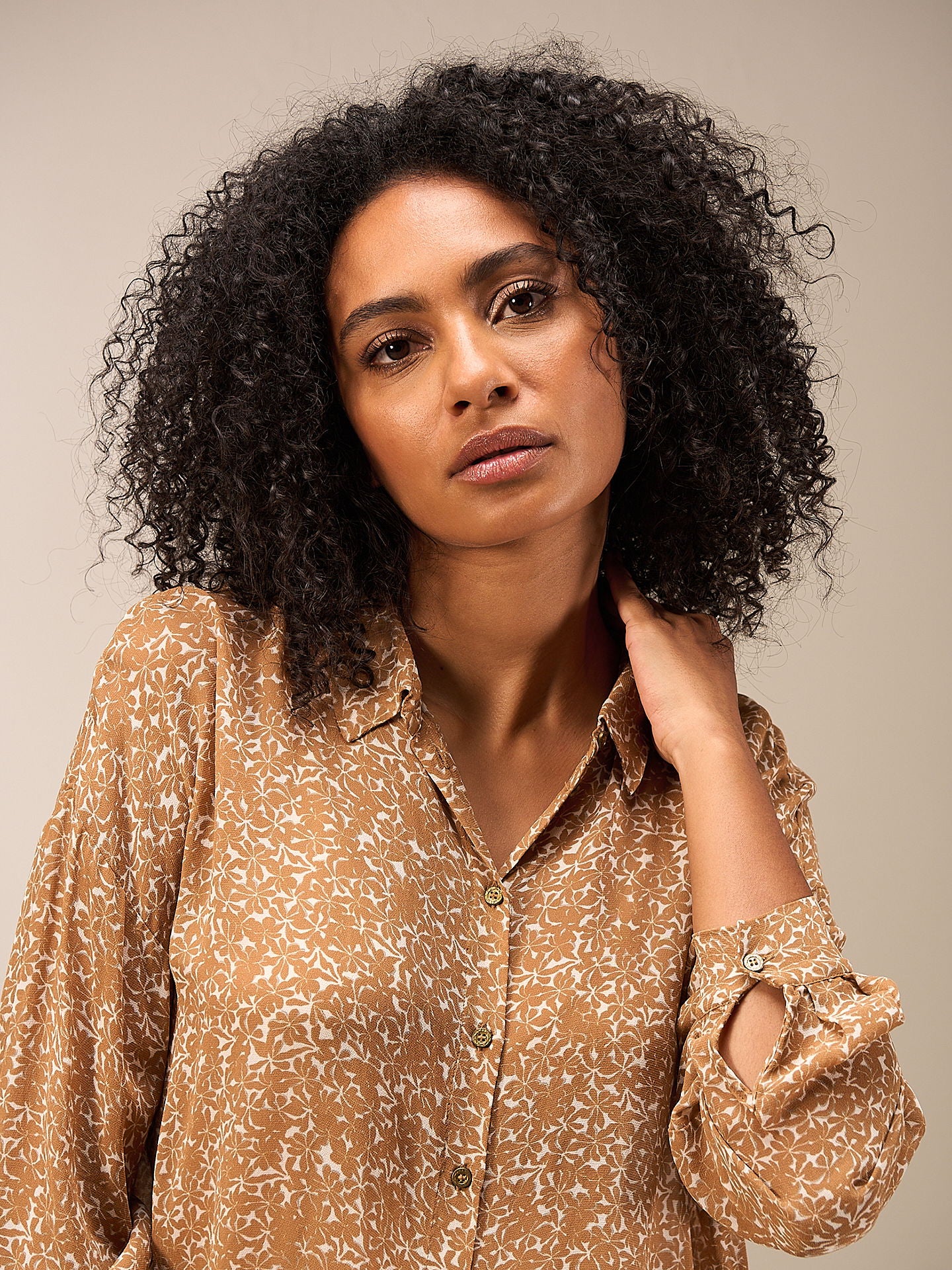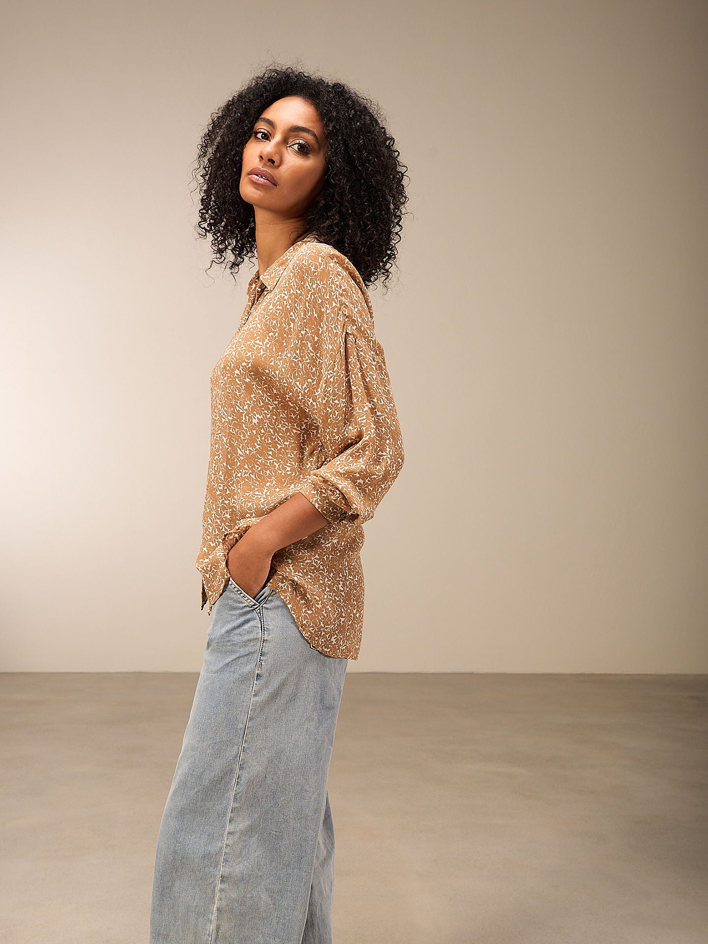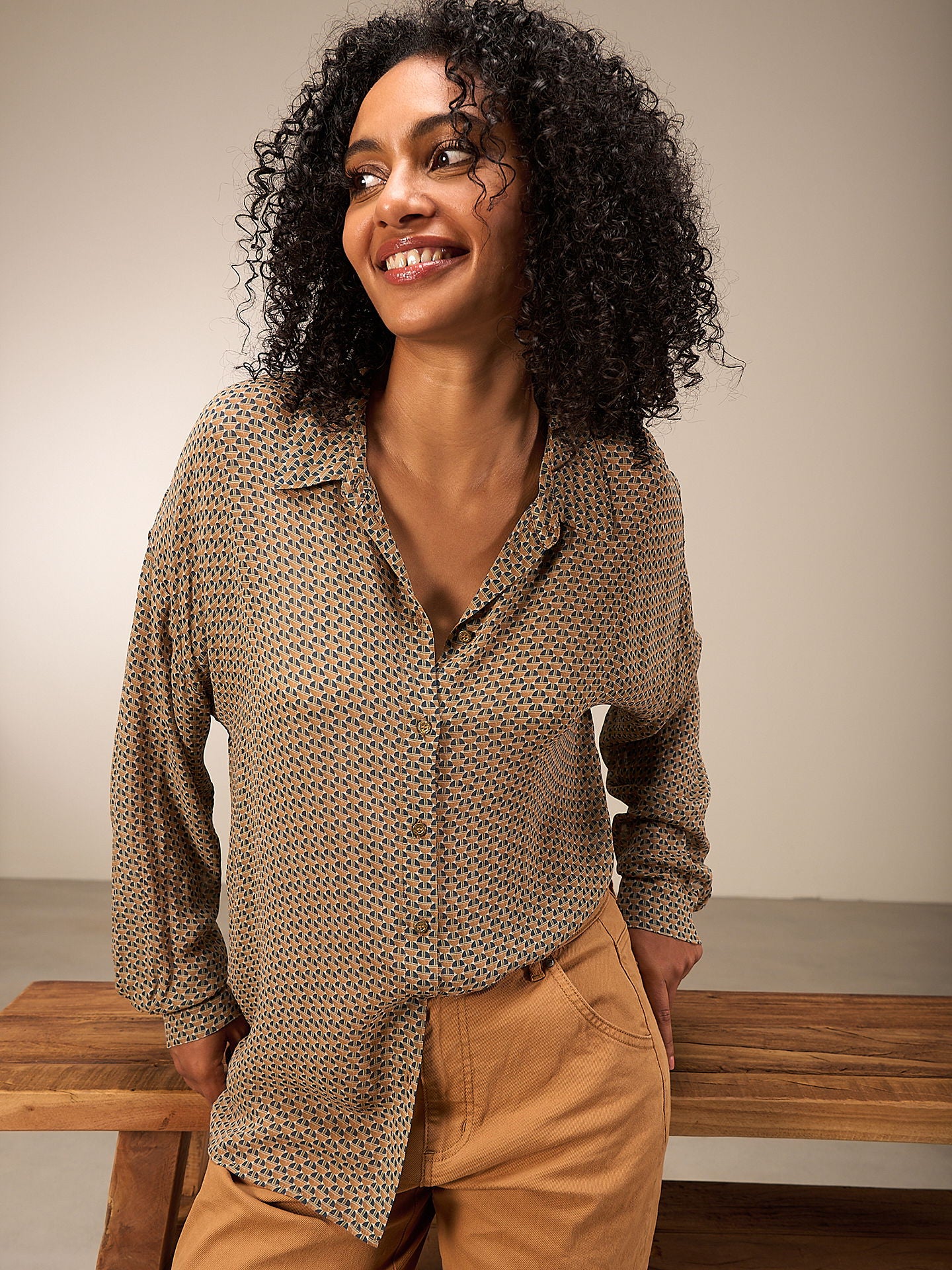 Button-through shirt blouse with a straight fit and dropped shoulders. The long sleeves have a button at the cuff. The matching hand-drawn all-over print completes the look of the blouse. From 100% Eco viscose, which is obtained from sustainable forestry.