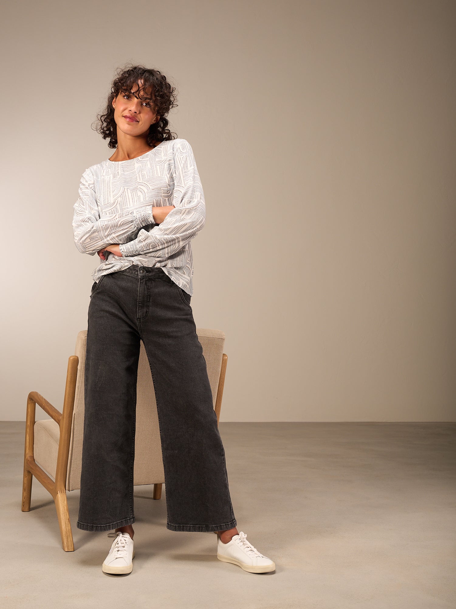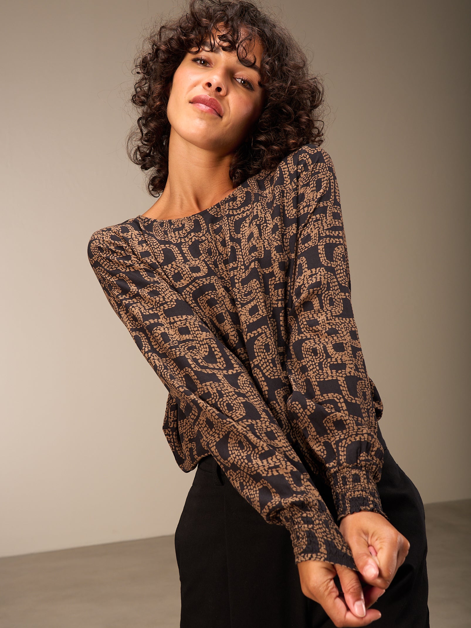 Loose-fitting blouse with a round neckline and smocked sleeve cuffs. A small, sophisticated slit with button fastening at the back. The matching hand-drawn all-over print and the soft, flowing, opaque material round off the look of the blouse.