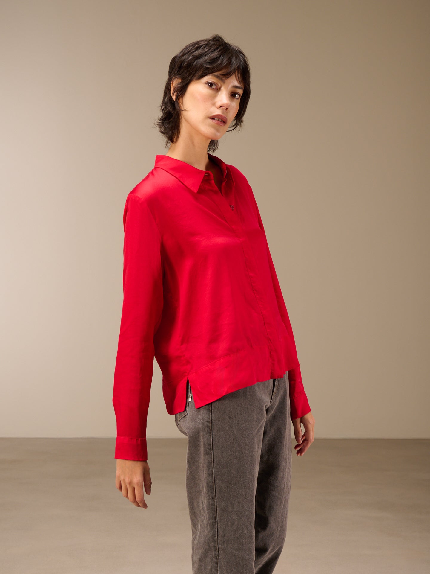 Boxy cut, elegantly shimmering, long-sleeved satin blouse with a chemise collar. The buttons on the cuffs are covered, making this blouse a festive companion.