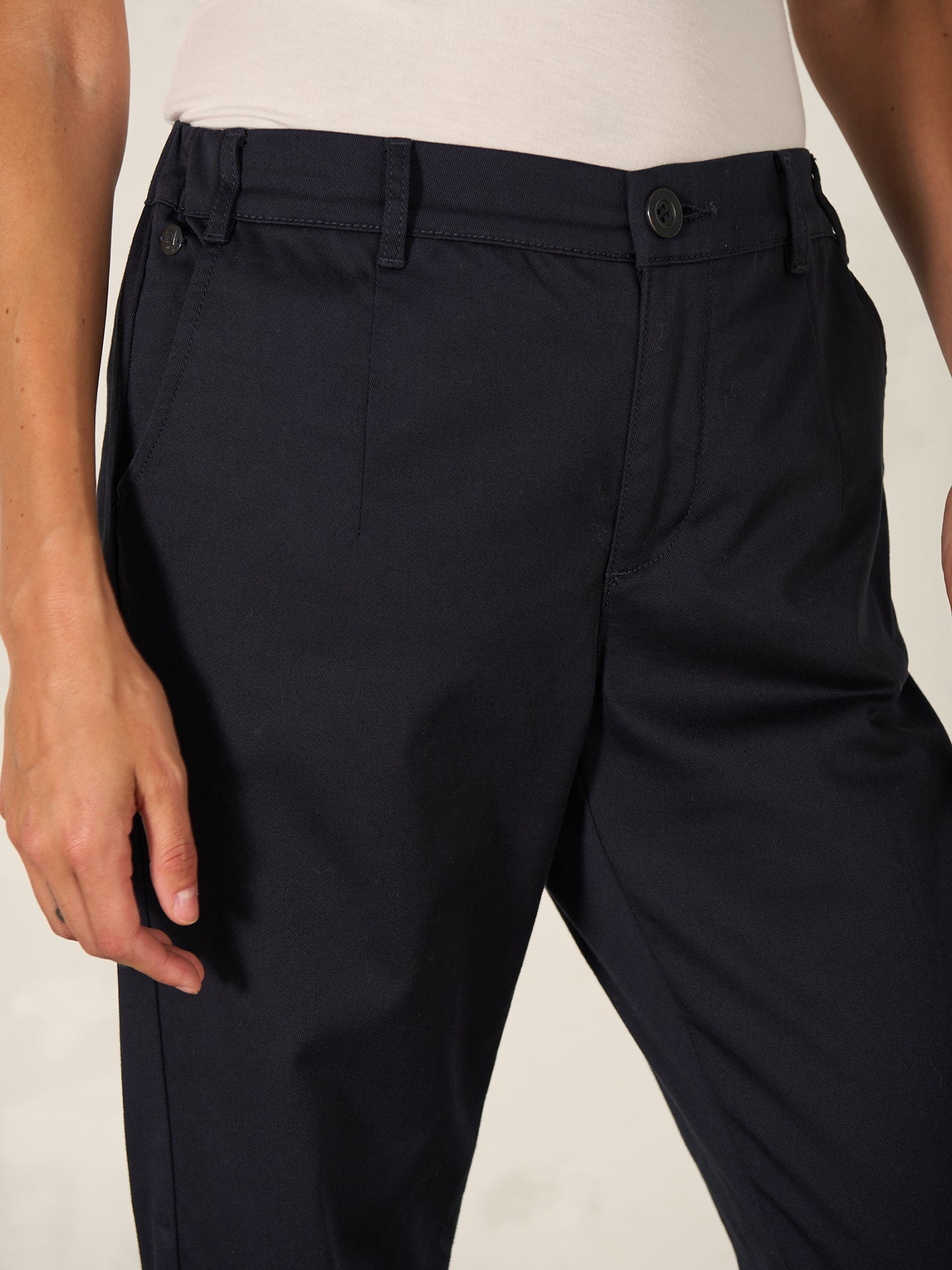 Loose-fitting trousers in a timeless design with a slim leg, mid-rise waistband, belt loops, slit pockets at the front and fake back welt pockets. Made of stretch fabric with a discreet sheen.