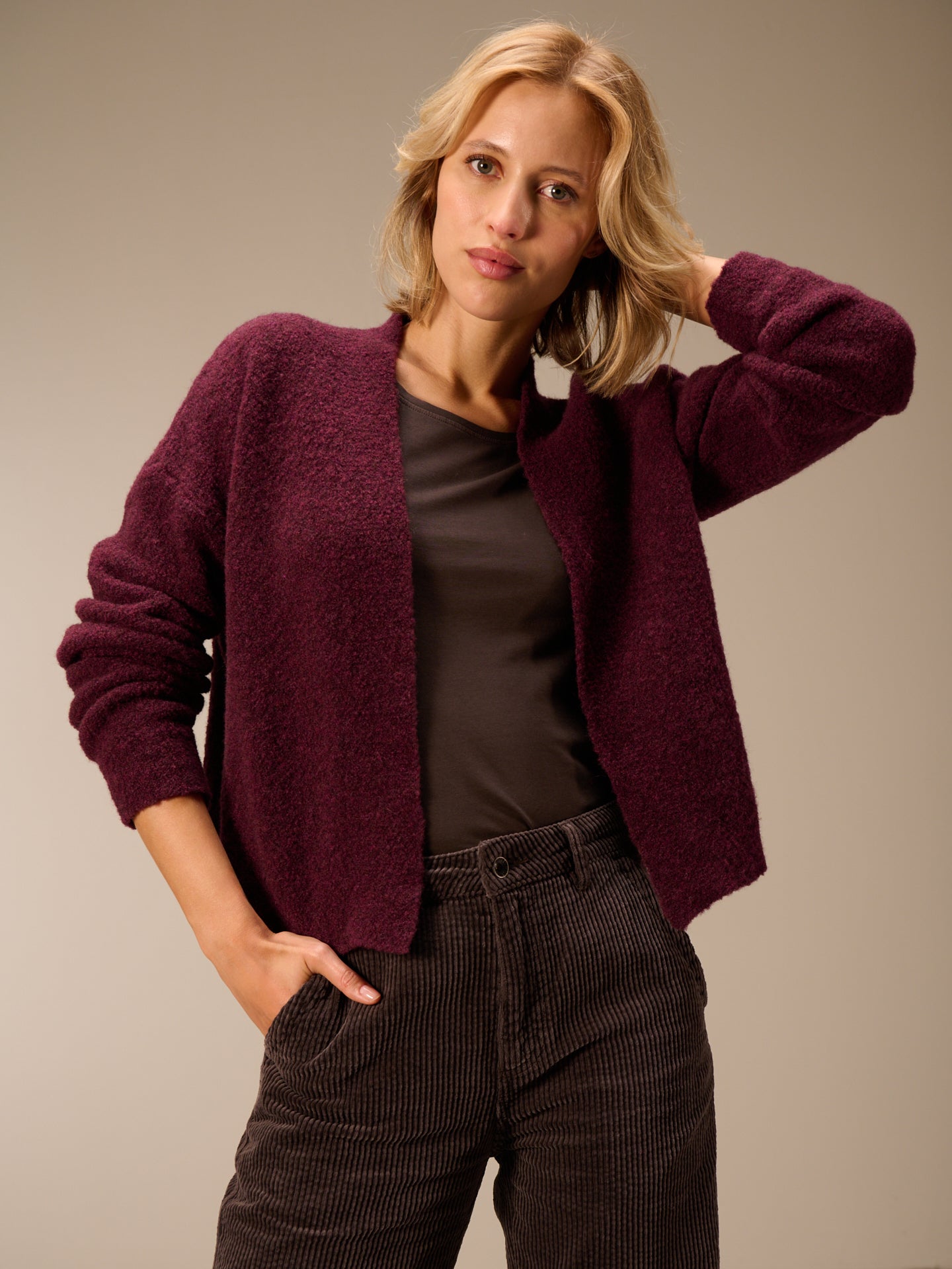 Loose-fitting cardigan with V-neck made from bouclé yarn - needle closure and ribbed trim on sleeves and hem.