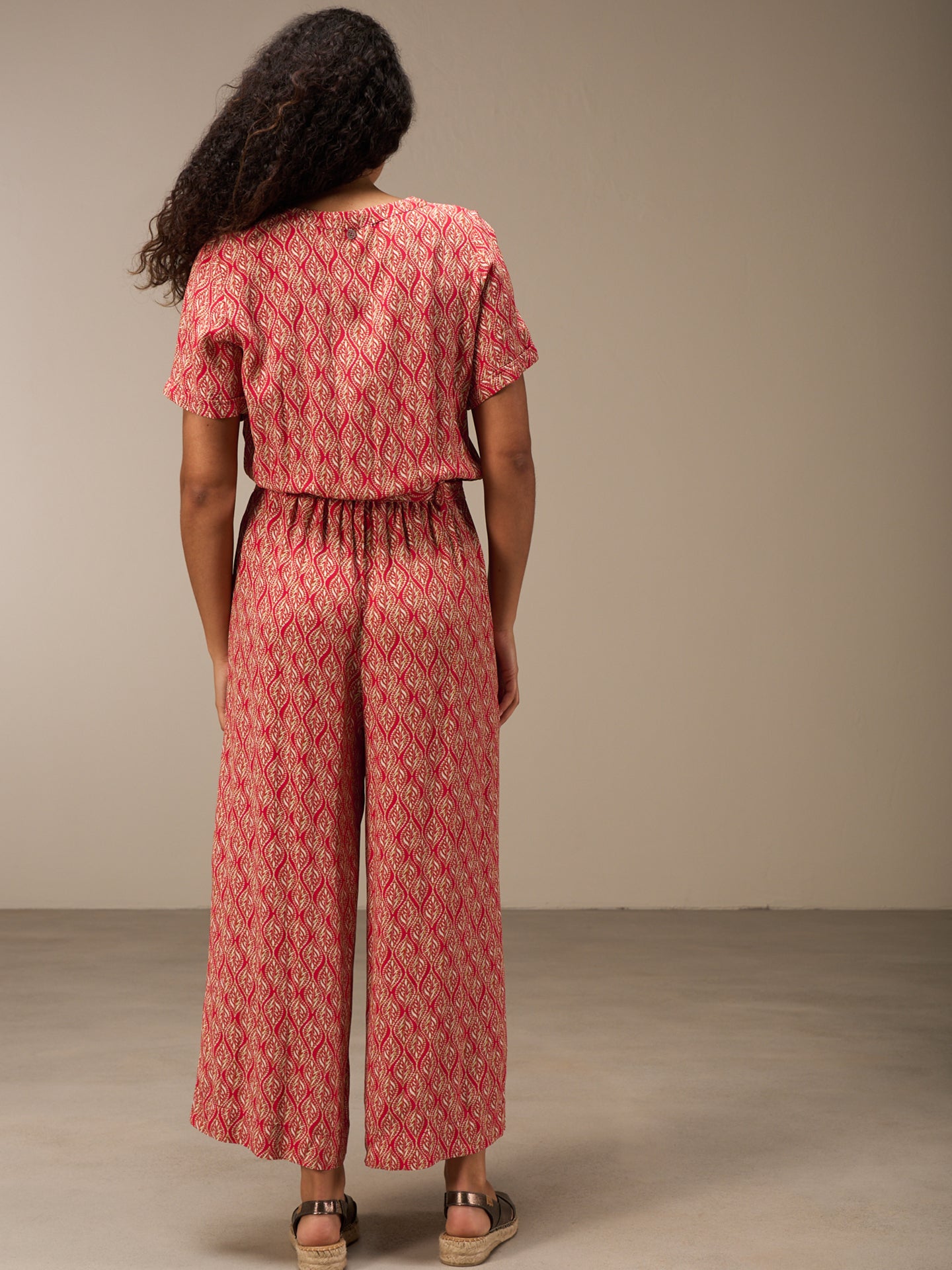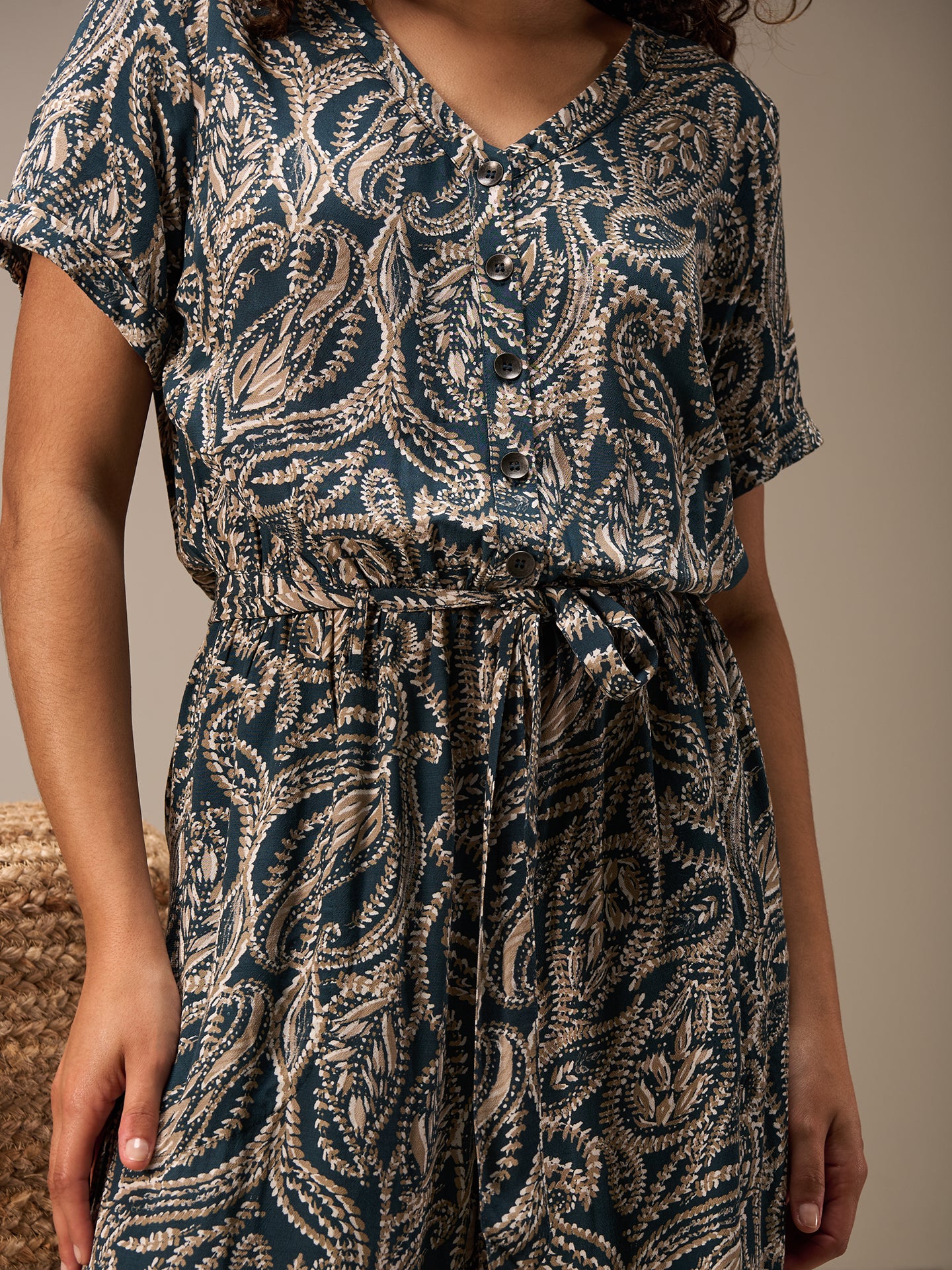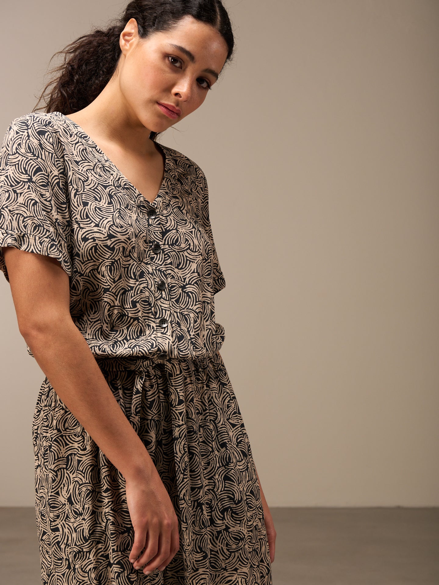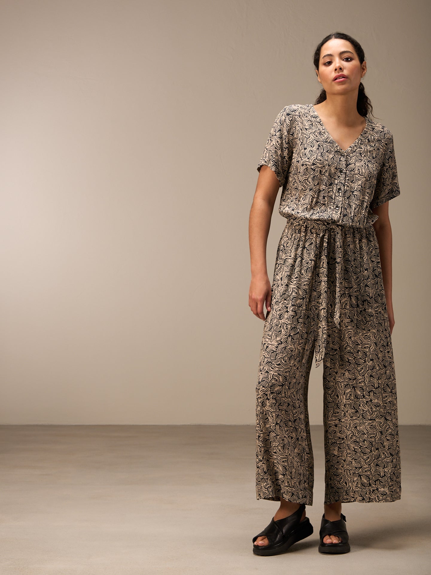 A summery, airy jumpsuit with stylish horn buttons and short sleeves with turn-ups.