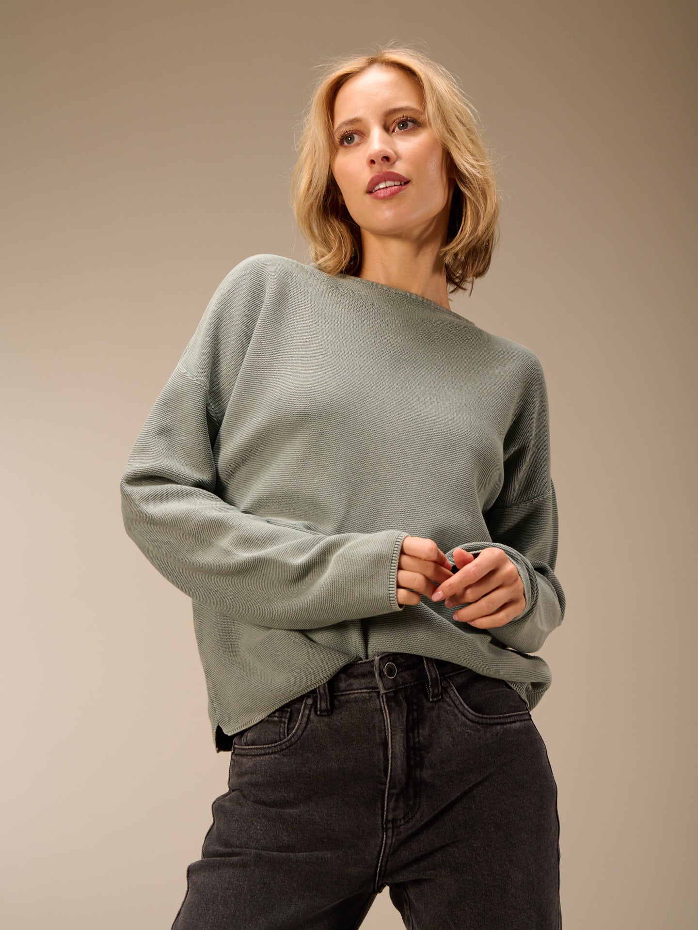 Loose-fitting knit sweater with a round neckline and short stand-up collar. Piece-dyed. Irregularities in the color make each piece unique. The fading effect is enhanced.
