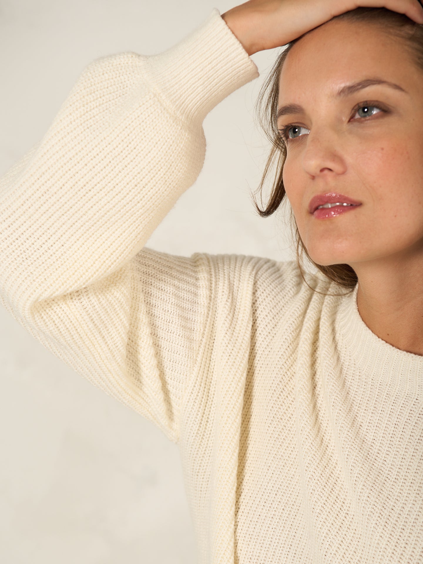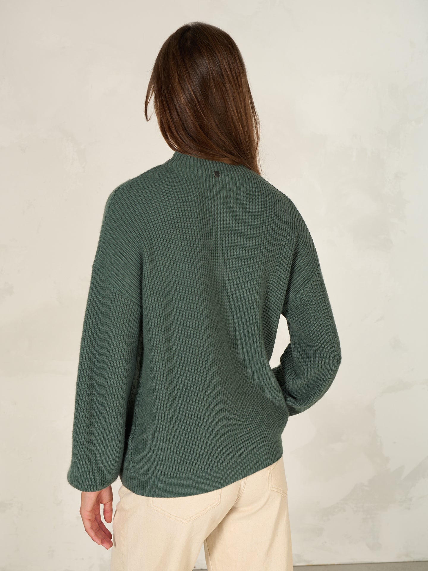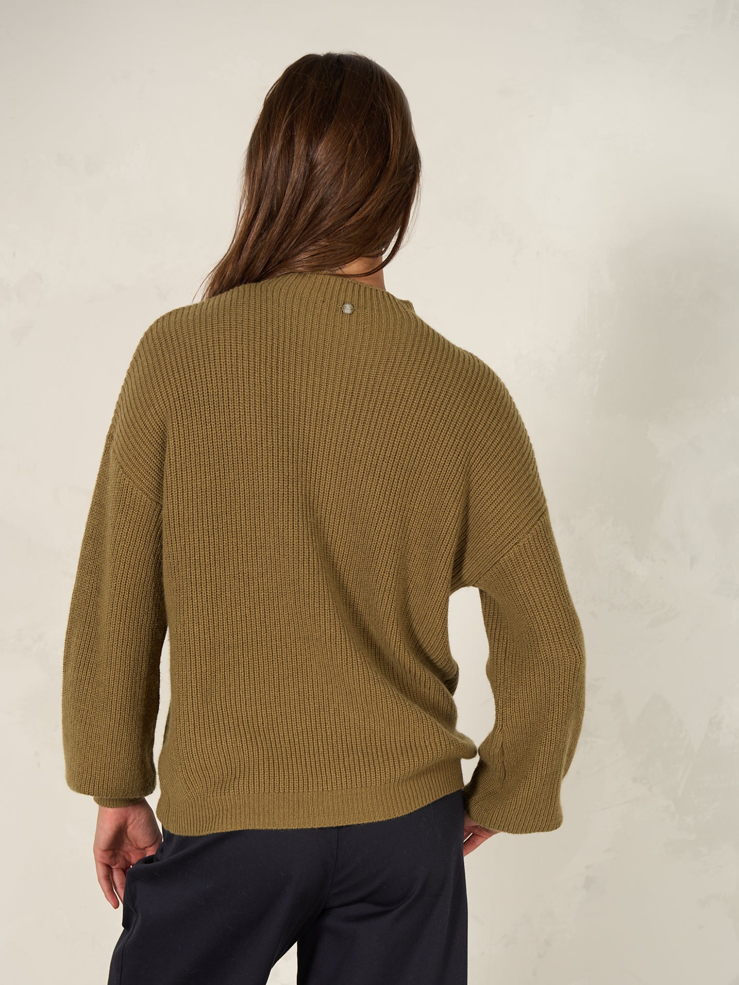 Loose-fit knitted pullover in a ribbed look with a short stand-up collar, dropped shoulders and decorative bishop sleeves.