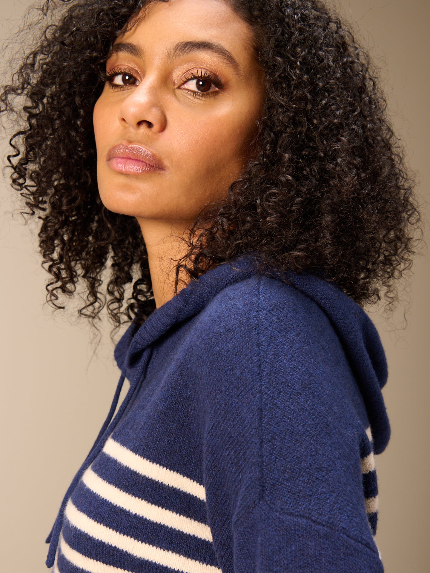Loose-fitting hooded sweater with a stockinette stitch look and ribbed trim.