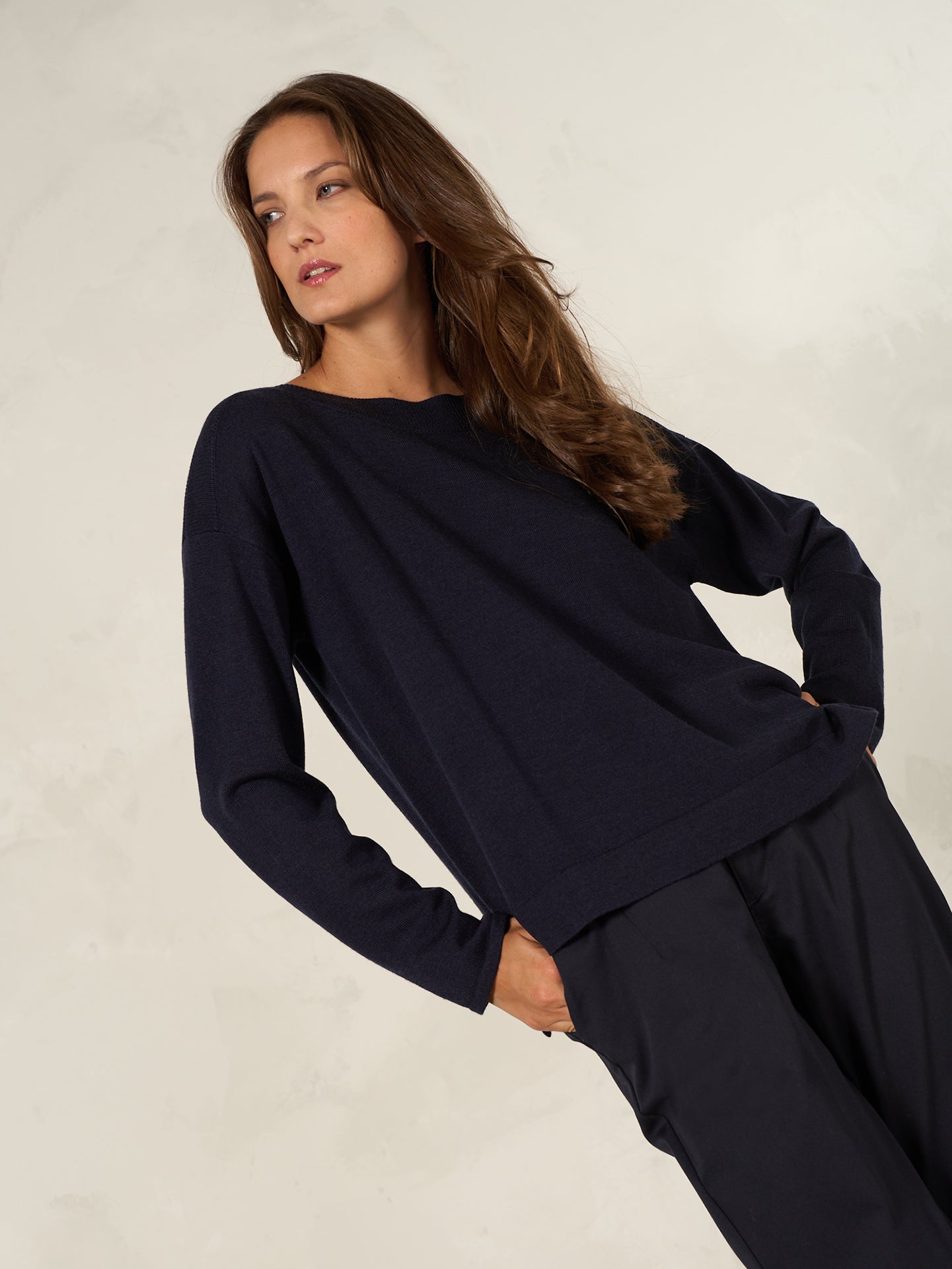 Straight-cut pullover in a special melange yarn with an elegant boat neckline with ribbed edging and dropped shoulders. The slit at the ribbed hem and the elongated back round off the pullover and make it a favourite.