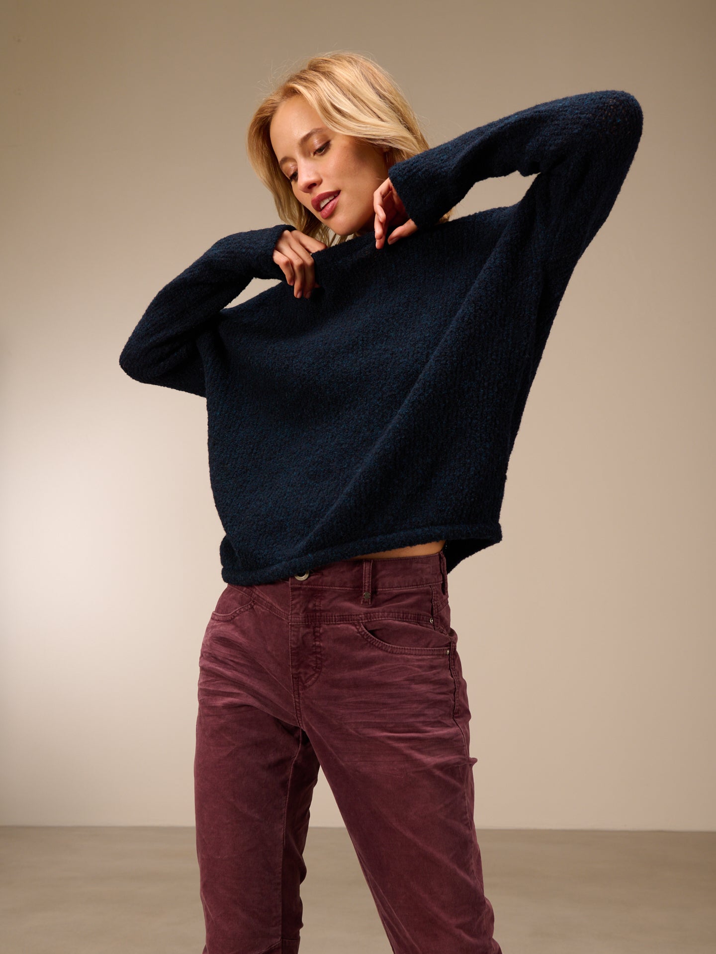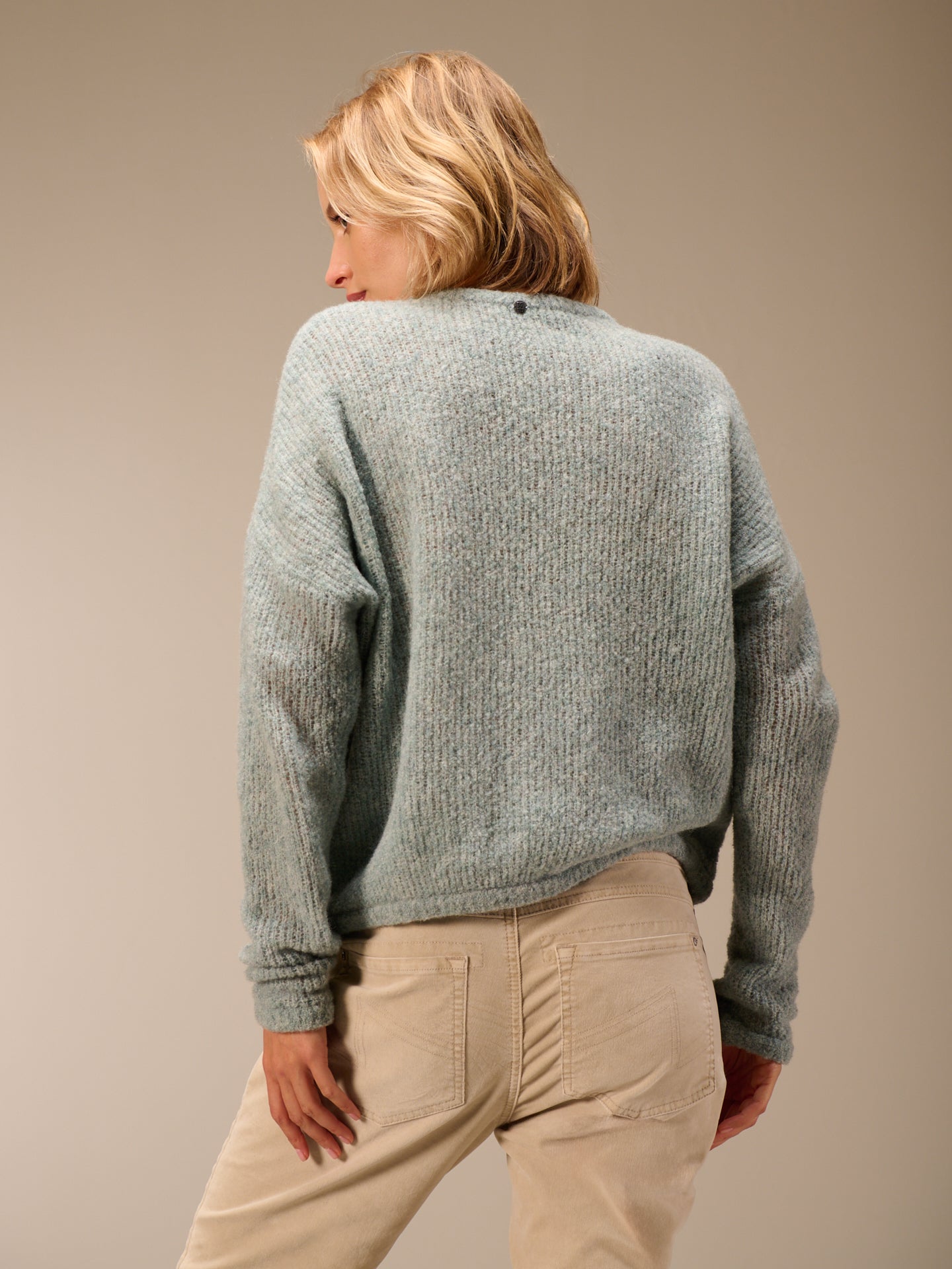 Loose-fitting ribbed knit sweater with a round neckline and ribbed cuffs, sleeves, and hem.