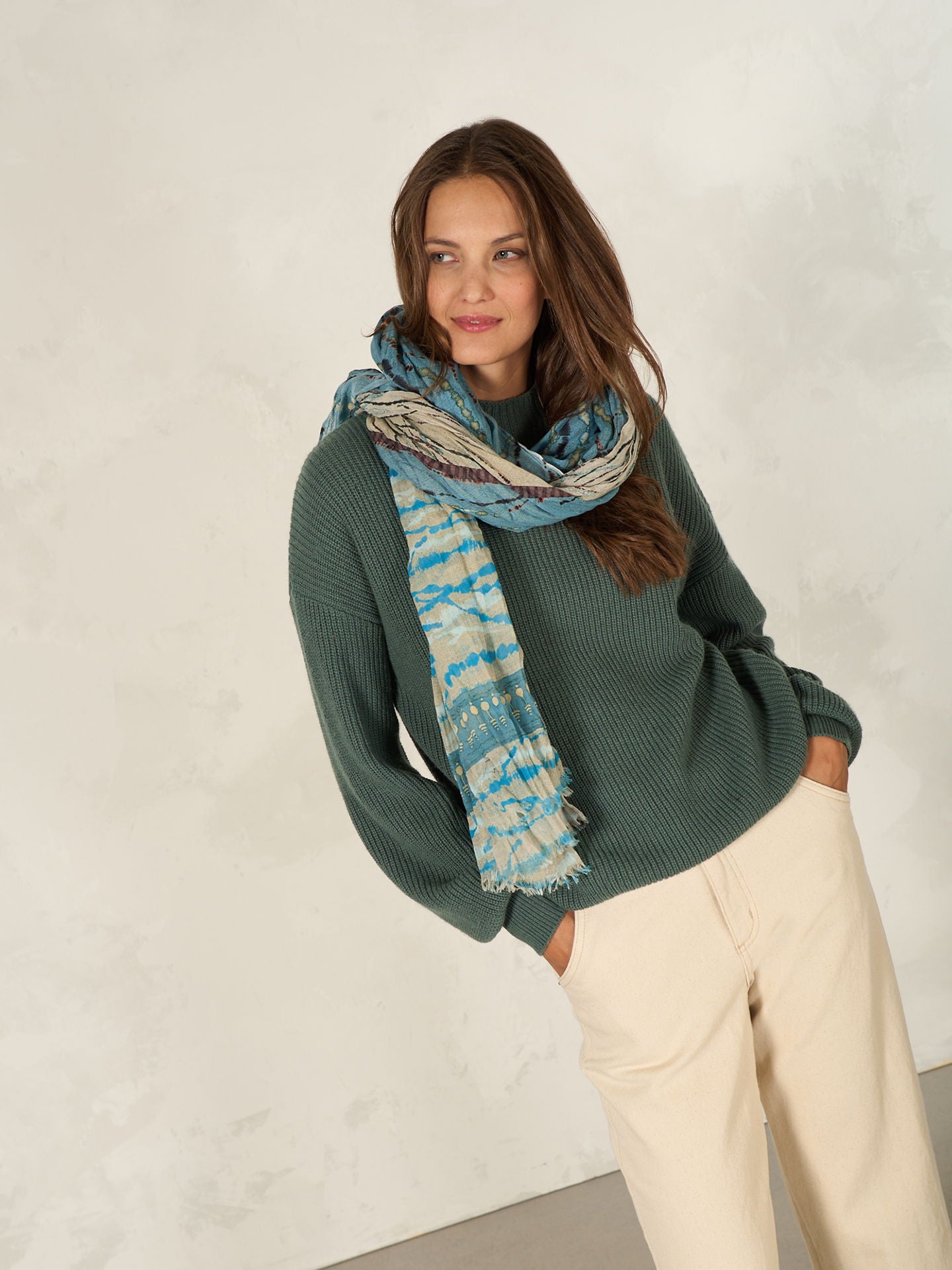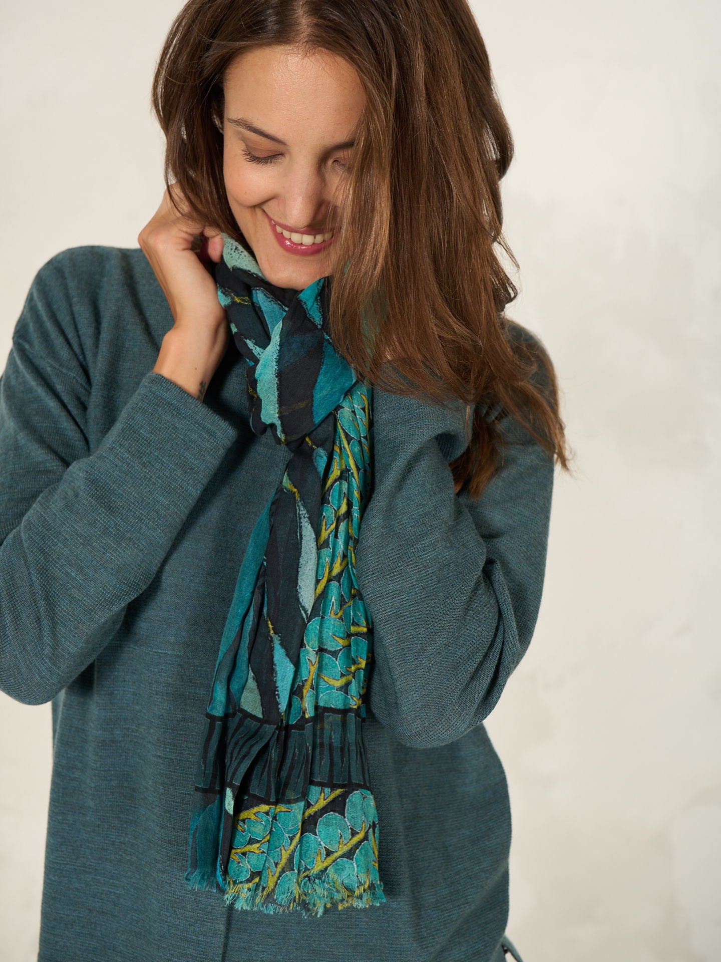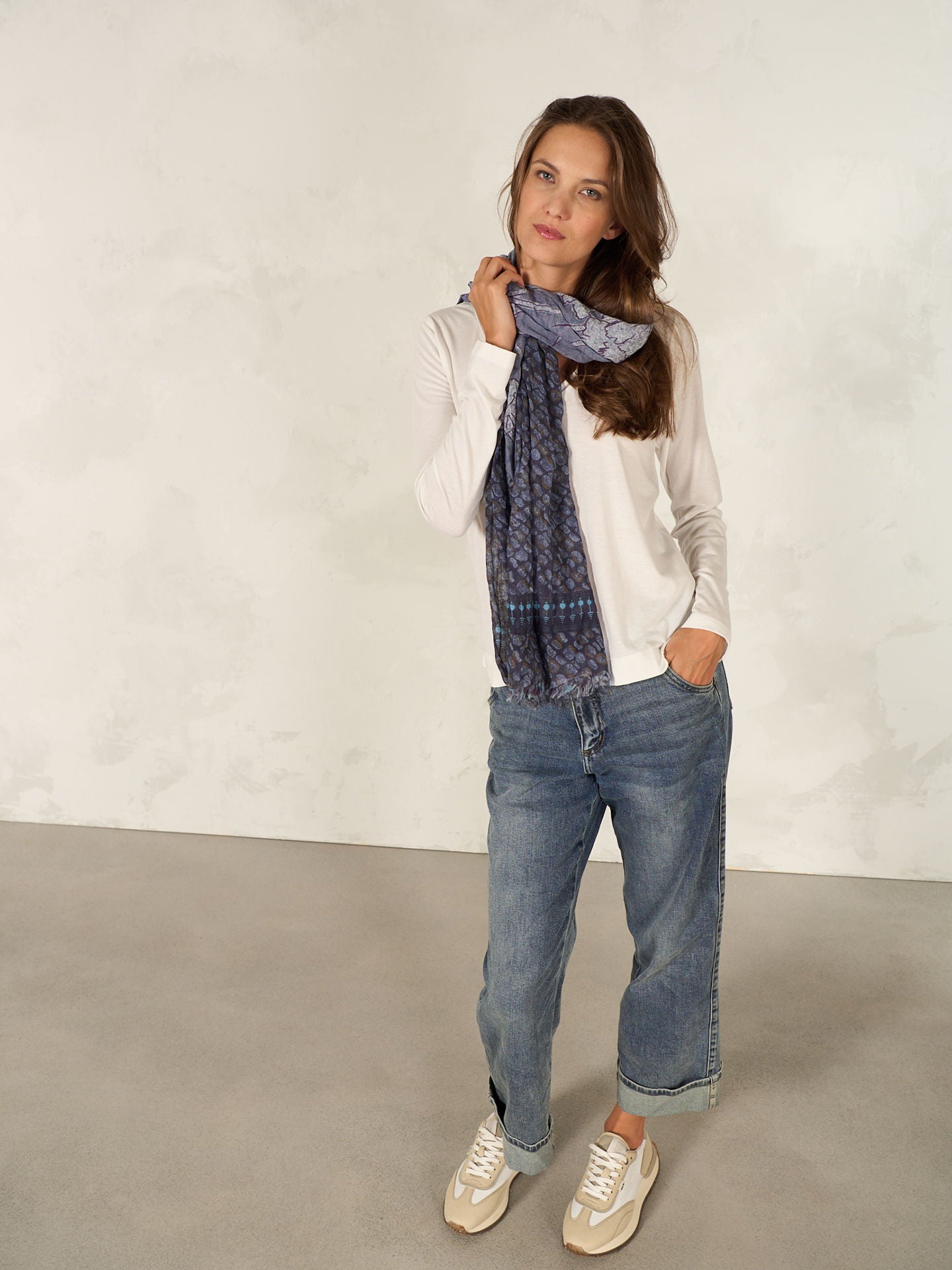 The large 100x200cm size is perfect for varied styling. Casually draped around the neck and shoulders, this scarf will instantly enhance any outfit and become a favourite accessory. The scarf is printed all over with hand-drawn prints and has shorter edges with fringes. 100% organic cotton from certified cultivation.
