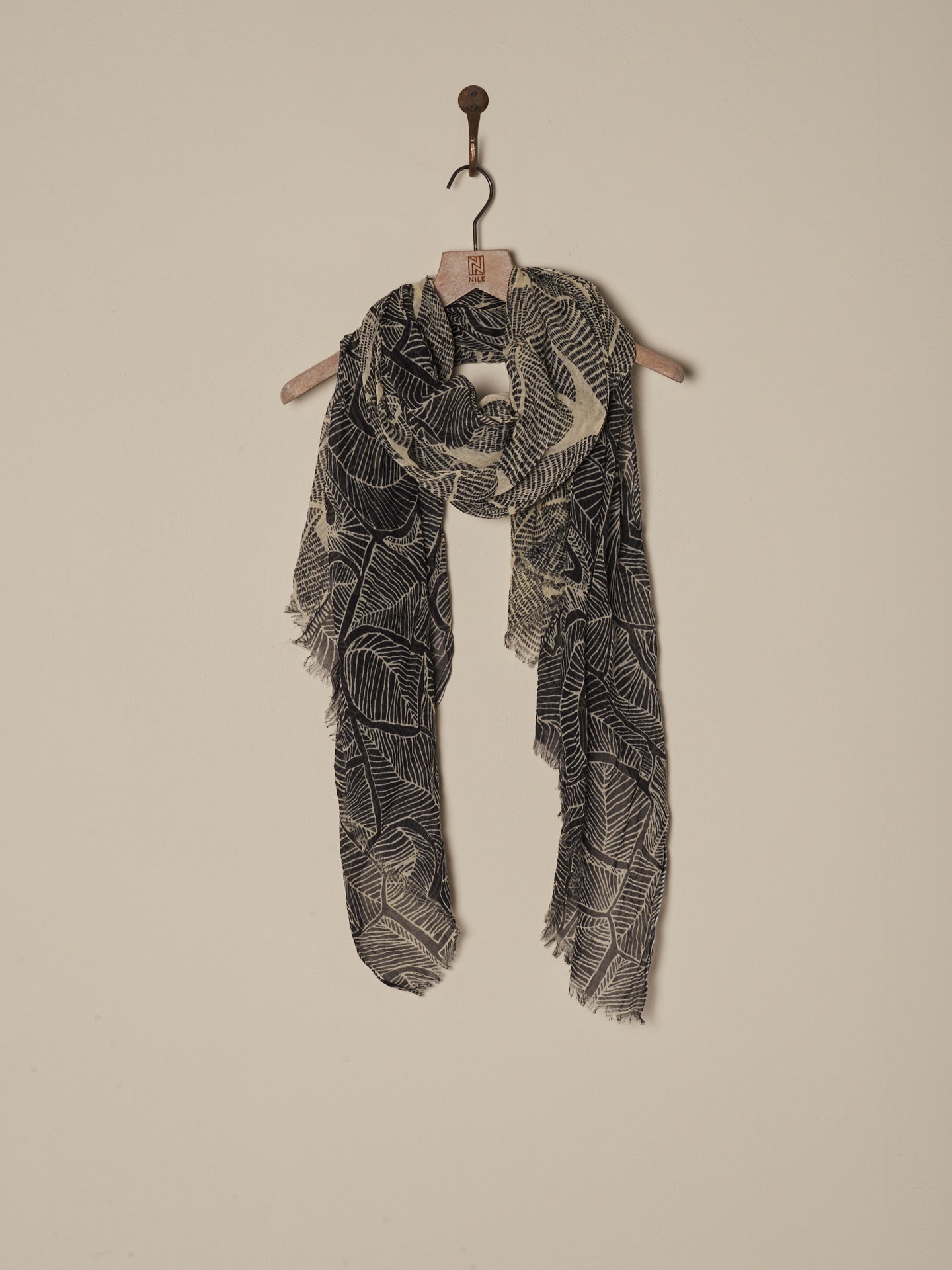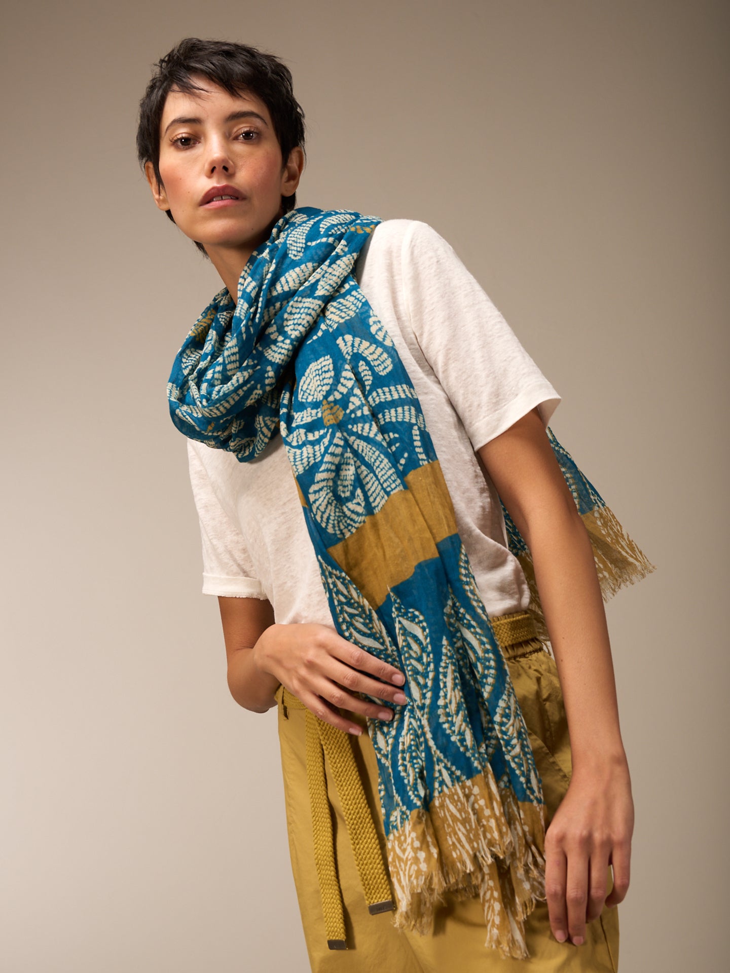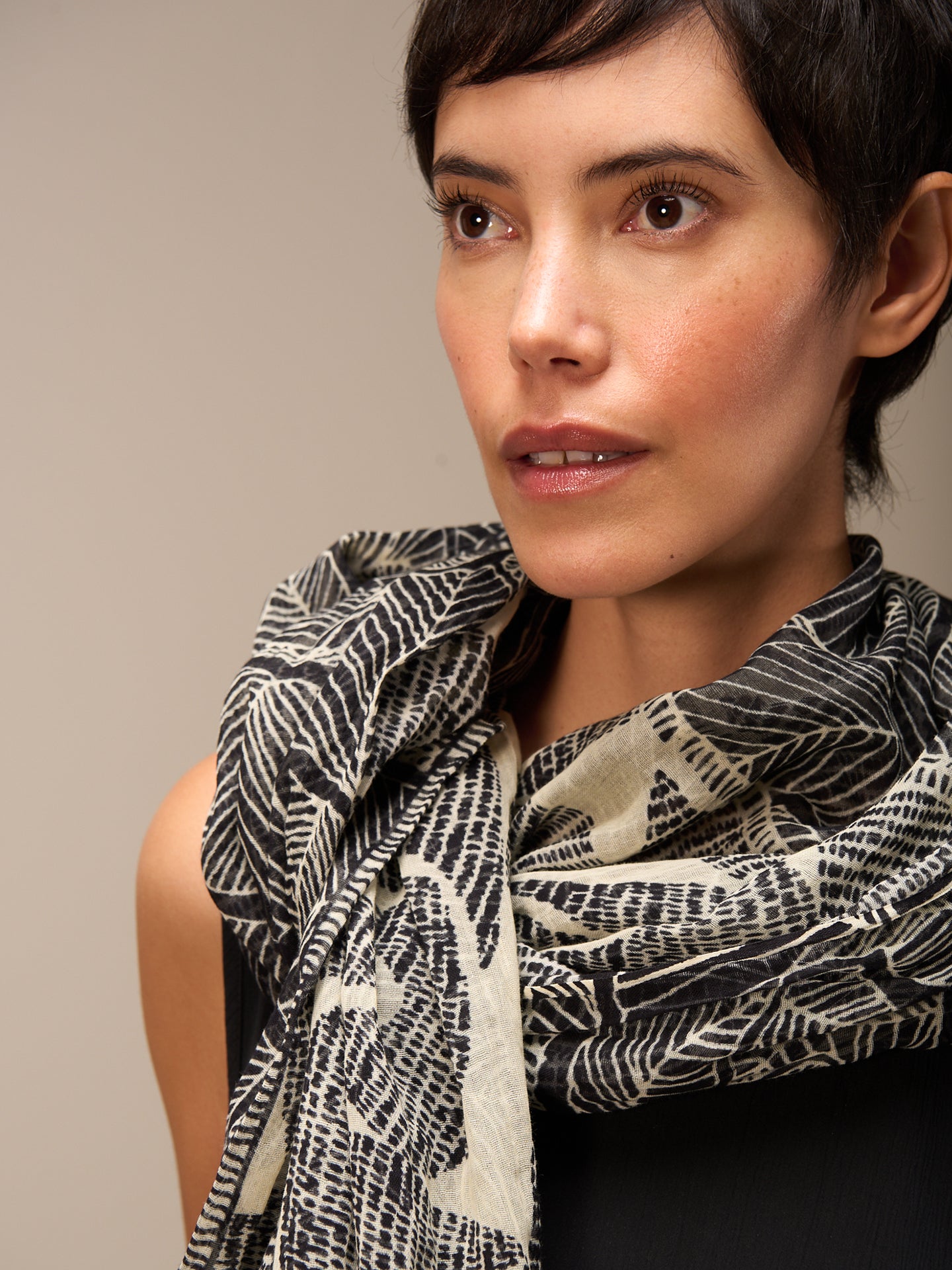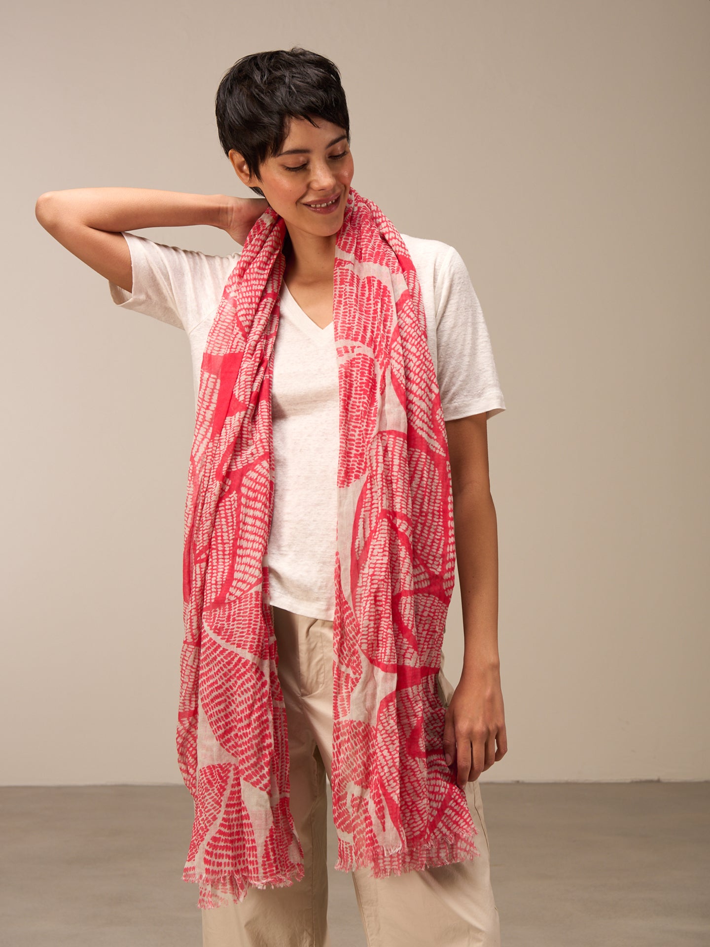 The large 100x200cm size is perfect for varied styling. Casually draped around the neck and shoulders, this scarf will instantly enhance any outfit and become a favourite accessory. The scarf is printed all over with hand-drawn prints and has shorter edges with fringes. 100% organic cotton from certified cultivation.