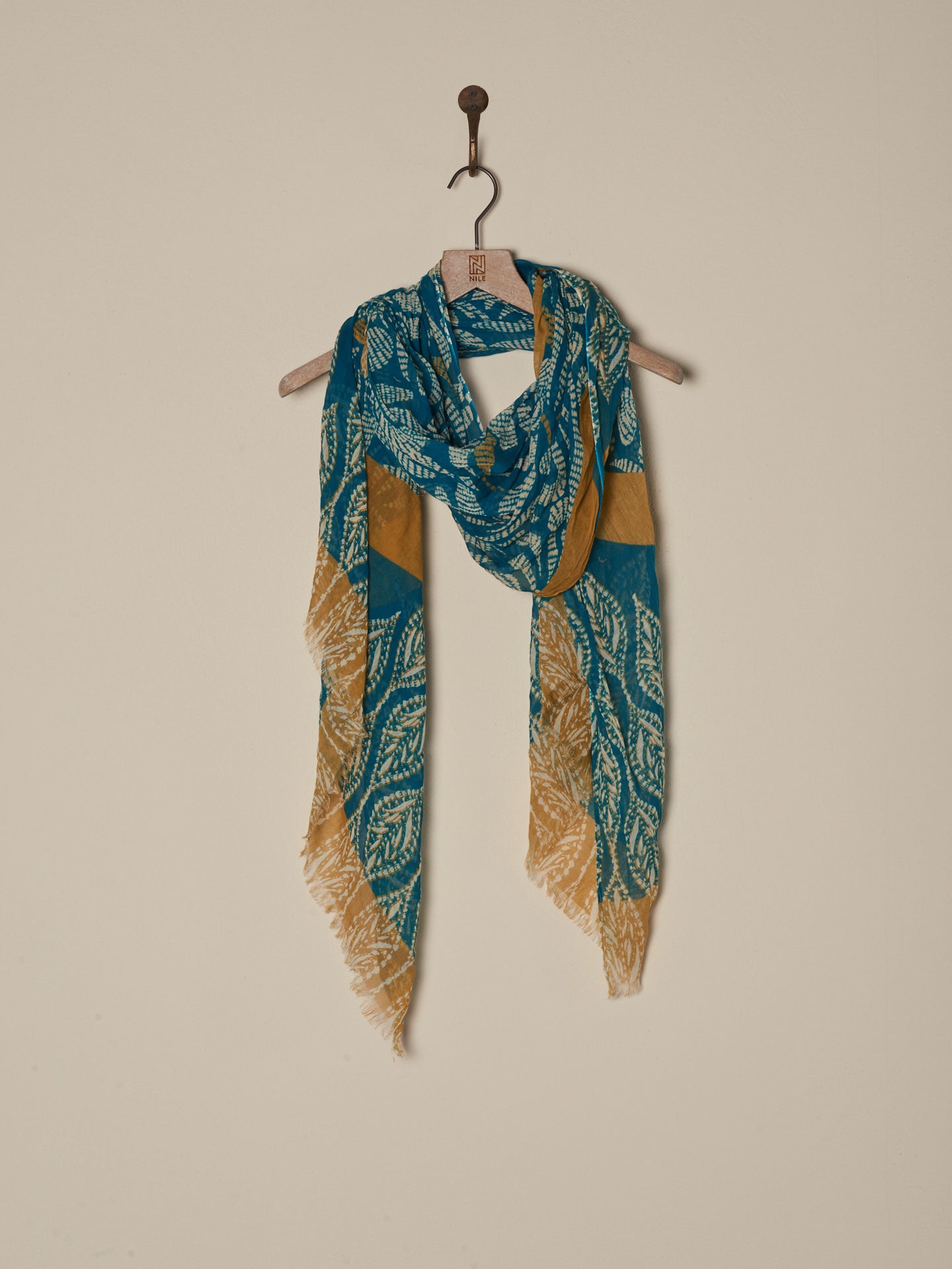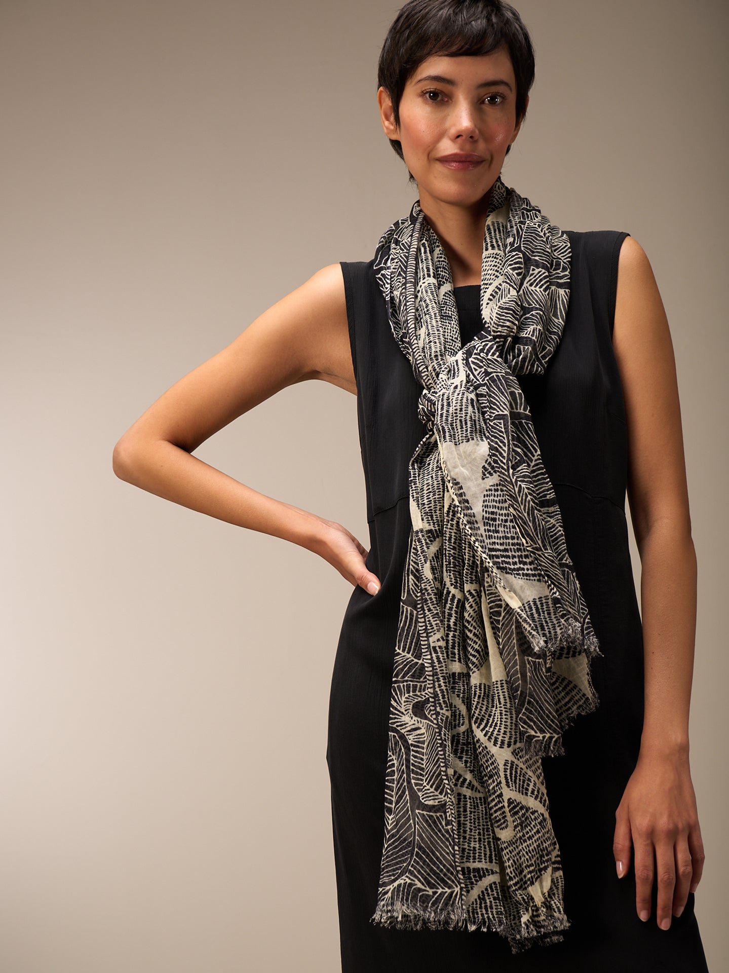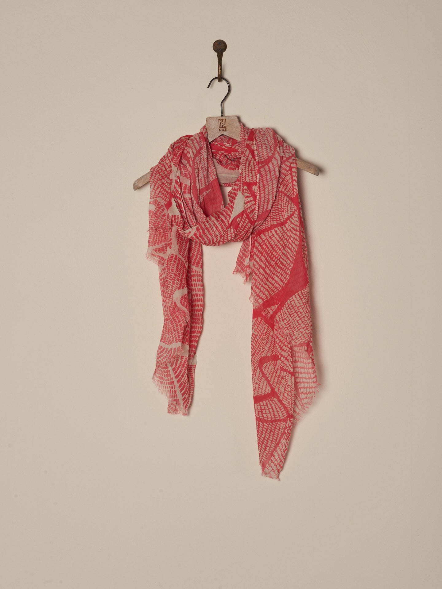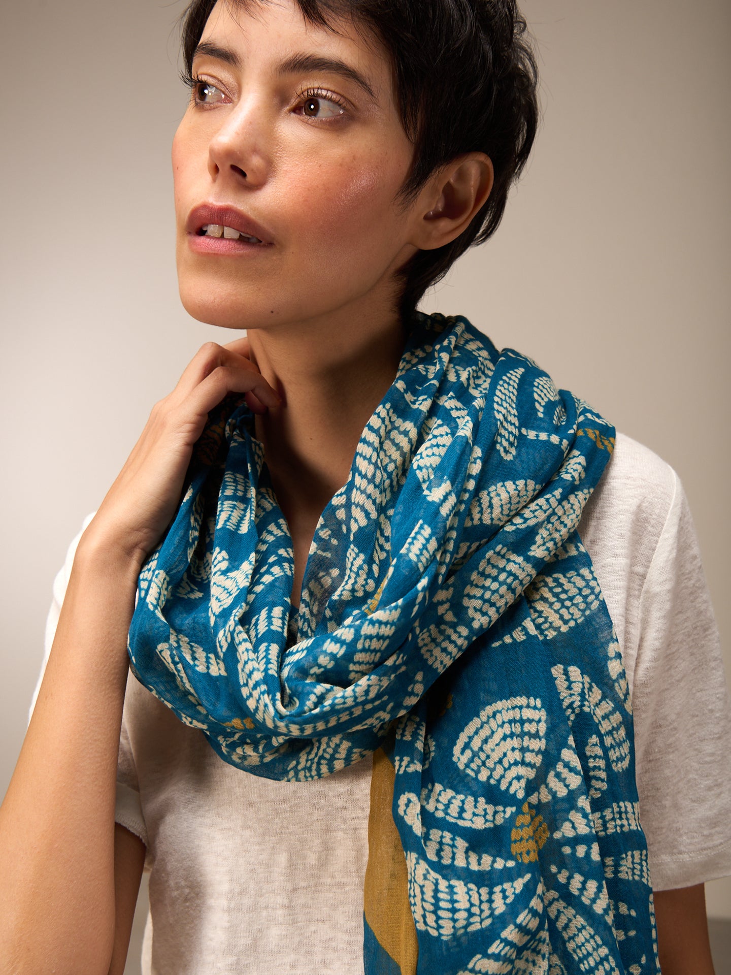 The large 100x200cm size is perfect for varied styling. Casually draped around the neck and shoulders, this scarf will instantly enhance any outfit and become a favourite accessory. The scarf is printed all over with hand-drawn prints and has shorter edges with fringes. 100% organic cotton from certified cultivation.