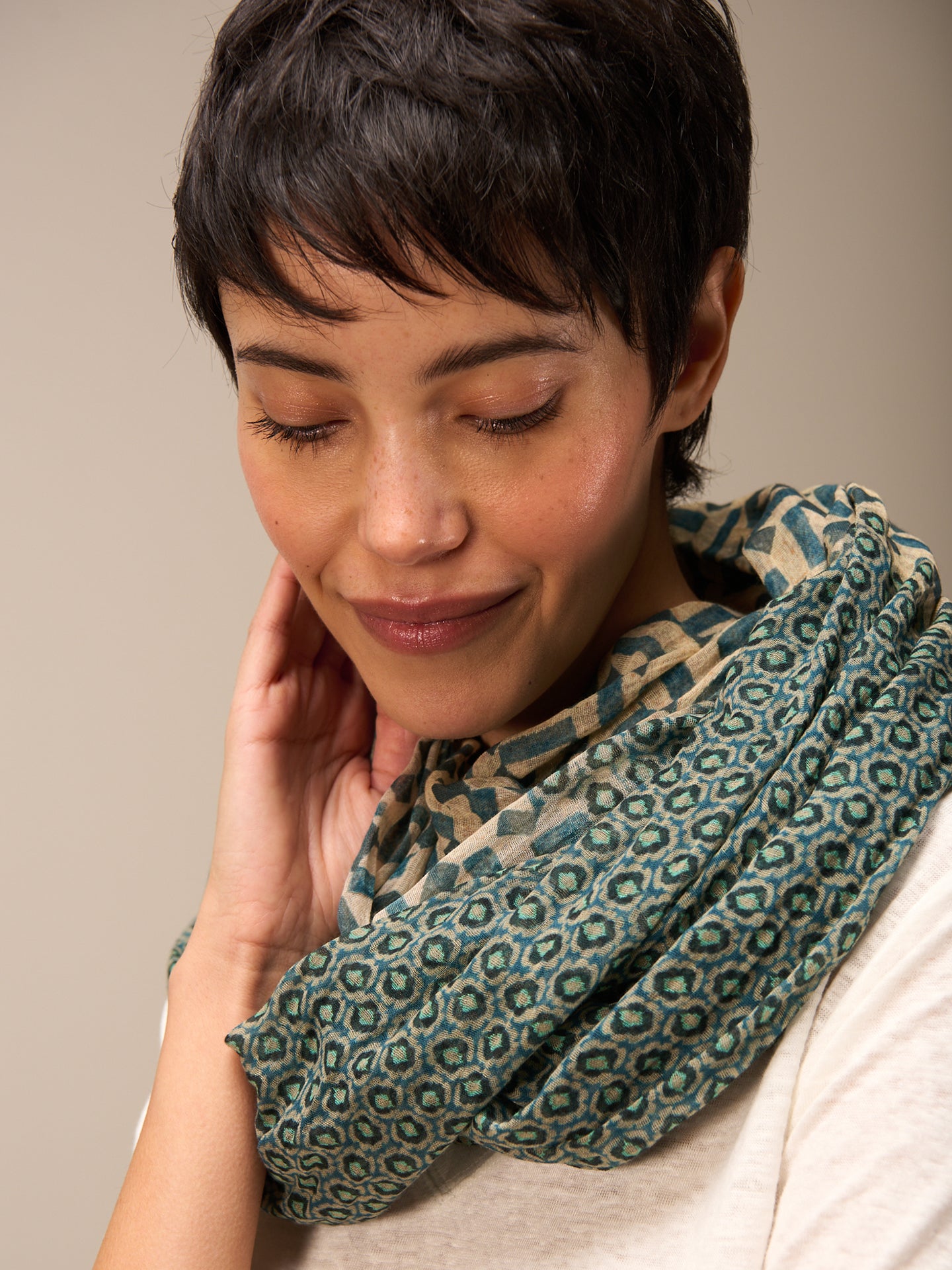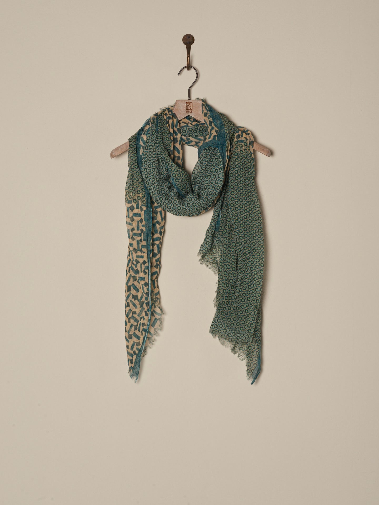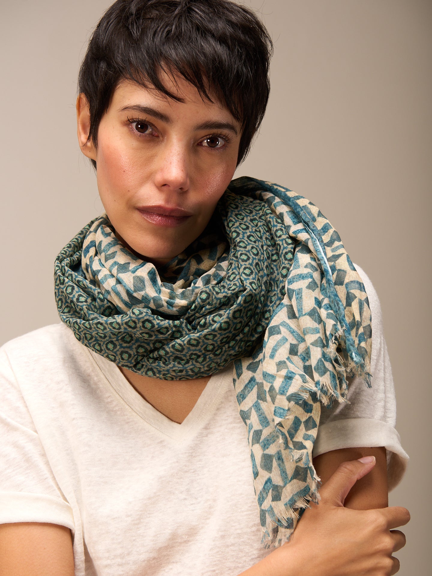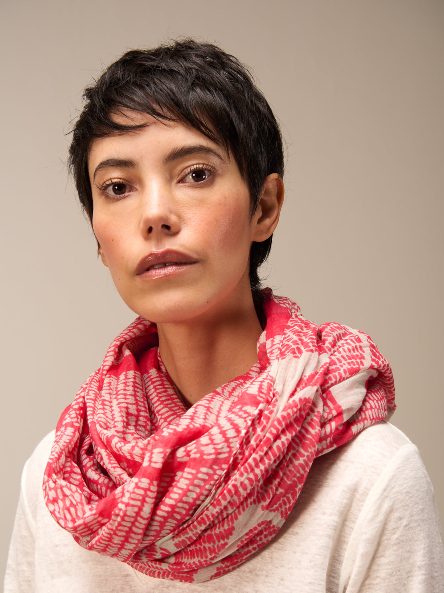 The large 100x200cm size is perfect for varied styling. Casually draped around the neck and shoulders, this scarf will instantly enhance any outfit and become a favourite accessory. The scarf is printed all over with hand-drawn prints and has shorter edges with fringes. 100% organic cotton from certified cultivation.